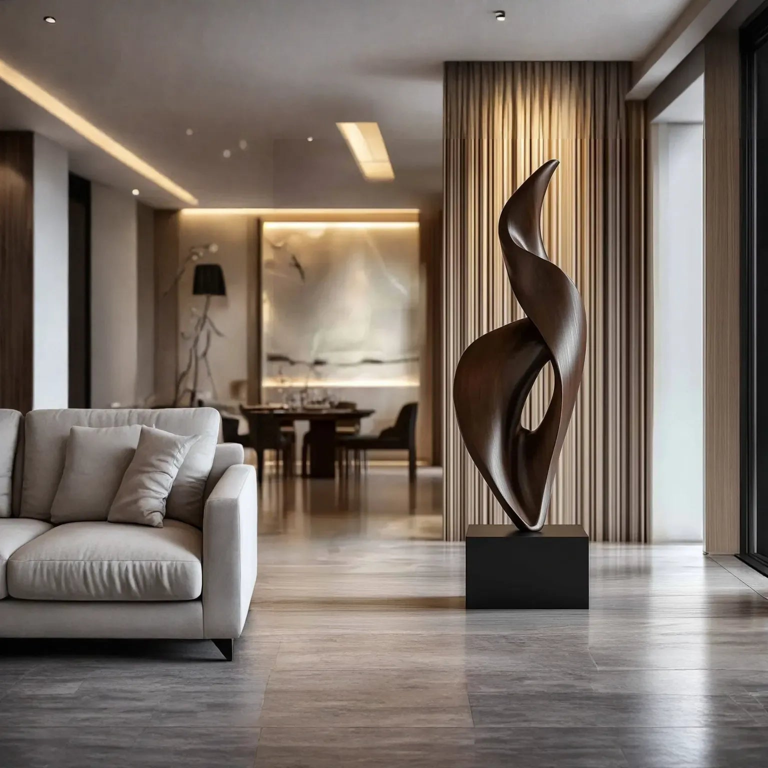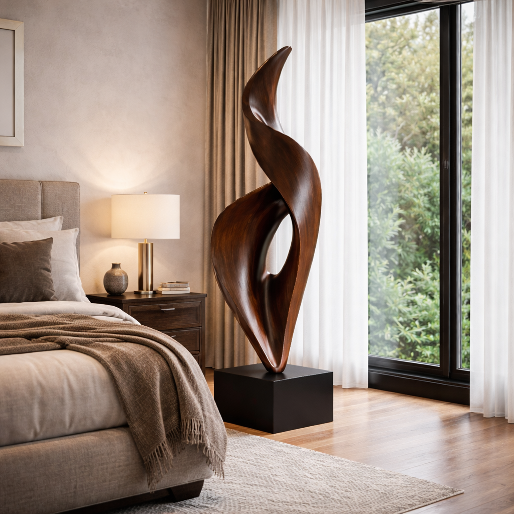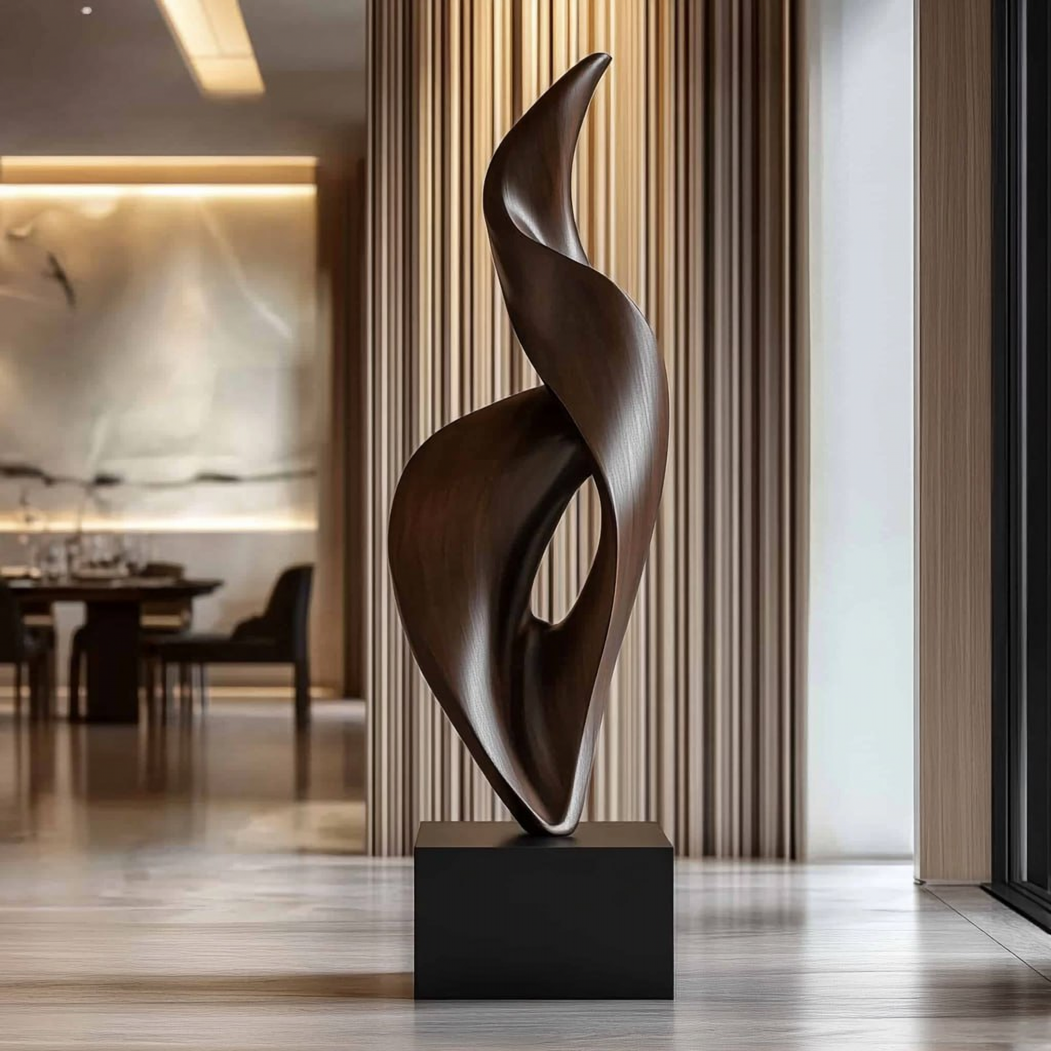 Ideal for living rooms, entryways, or dining areas, this sculpture blends craftsmanship and design. It adds a warm, modern accent that complements minimalist, richly layered, and nature-led interiors.