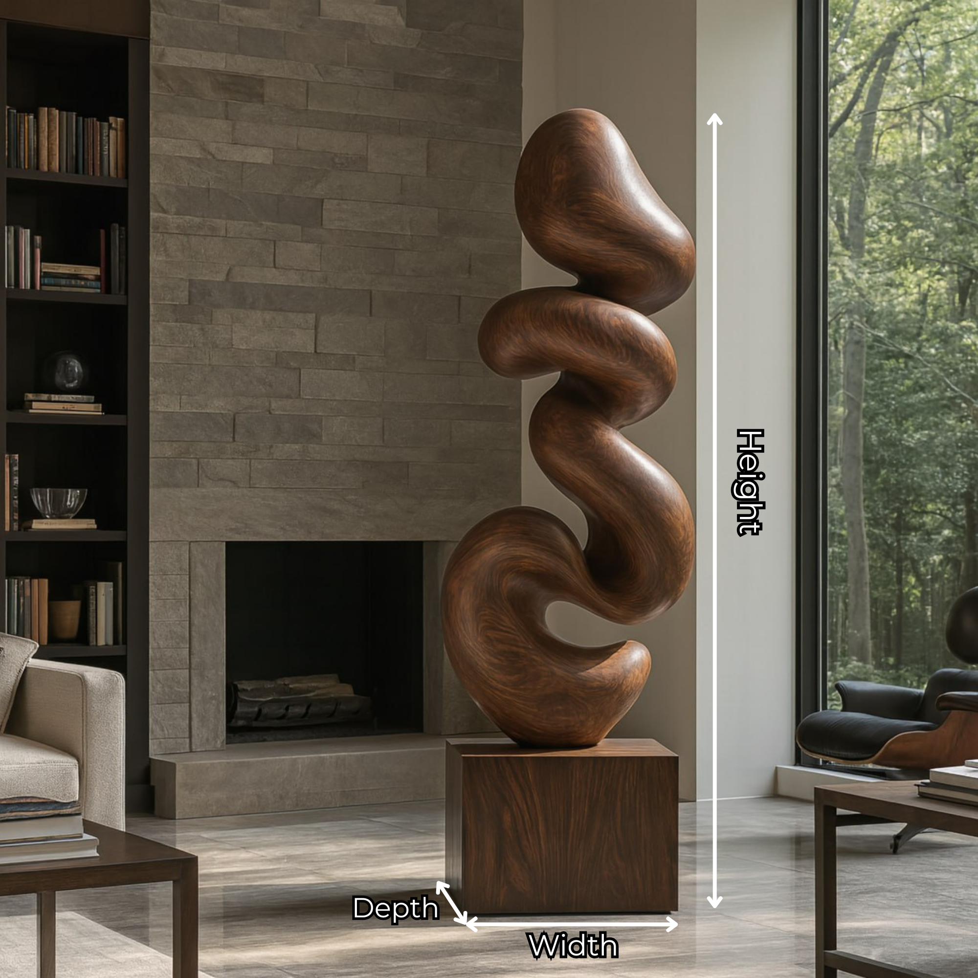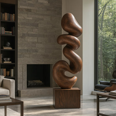 This Organic-Flow sculpture features a continuous curved form that suggests rhythm and natural movement. Smooth transitions and a sculpted contour create a calm presence, making it a compelling focal point for living rooms and quiet interior settings.
