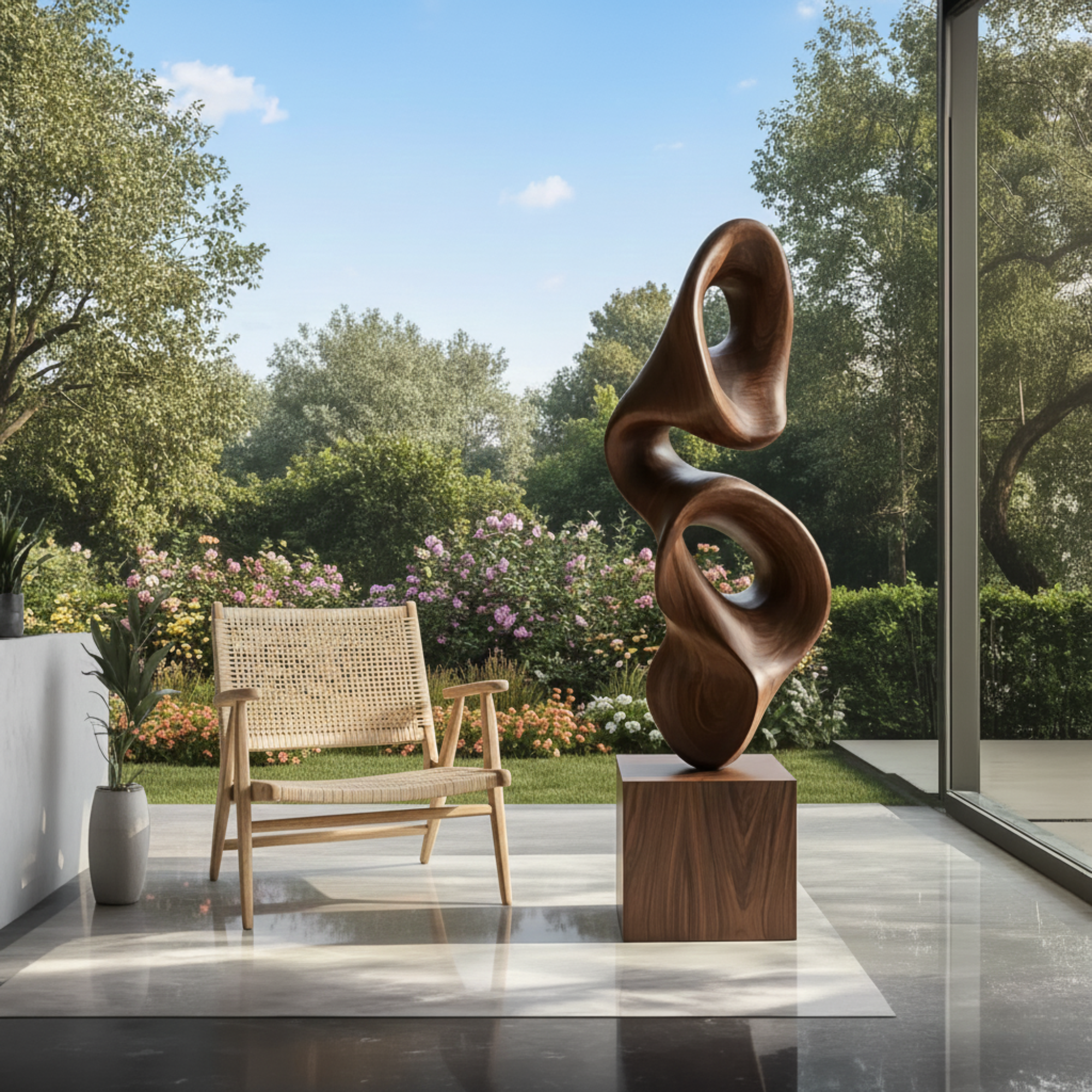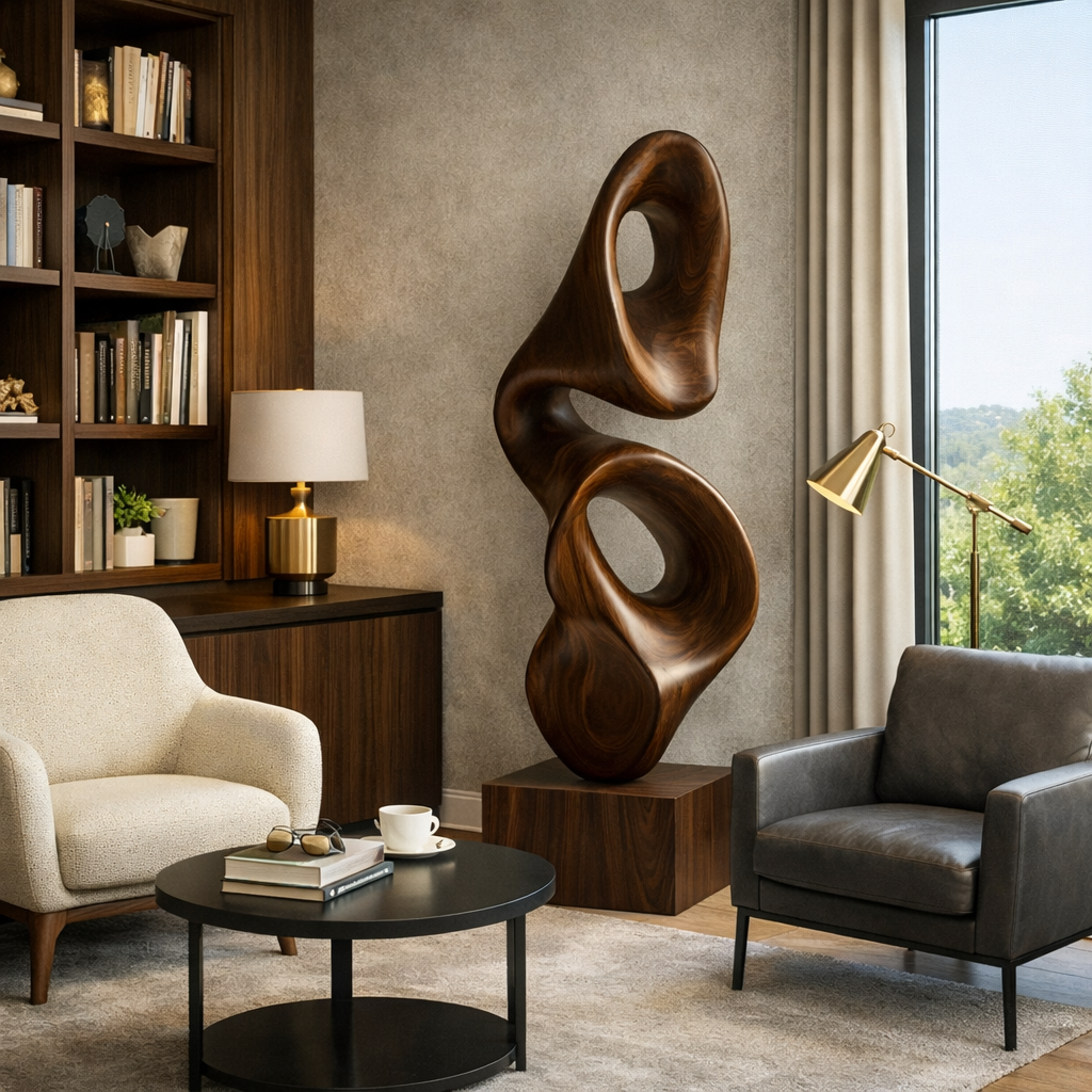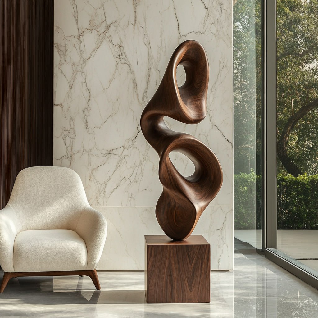 Hand-carved from natural solid wood, the sculpture emphasizes the character of the grain, resulting in a warm, refined presence. A satin finish enhances texture and tonal depth while maintaining a timeless, tactile, and natural feel. Its aesthetic pairs beautifully with minimalist, modern, Japandi, luxury, and art-focused spaces.