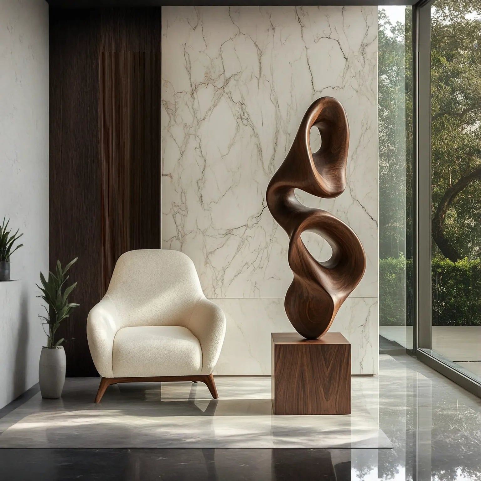 This contemporary organic sculpture is designed to elevate modern interiors with its fluid, freeform silhouette. Soft, continuous curves rise in a natural rhythm, creating a visual balance that feels both organic and refined. Carved openings and gentle transitions allow every angle to reveal a new perspective, making it a captivating focal point.