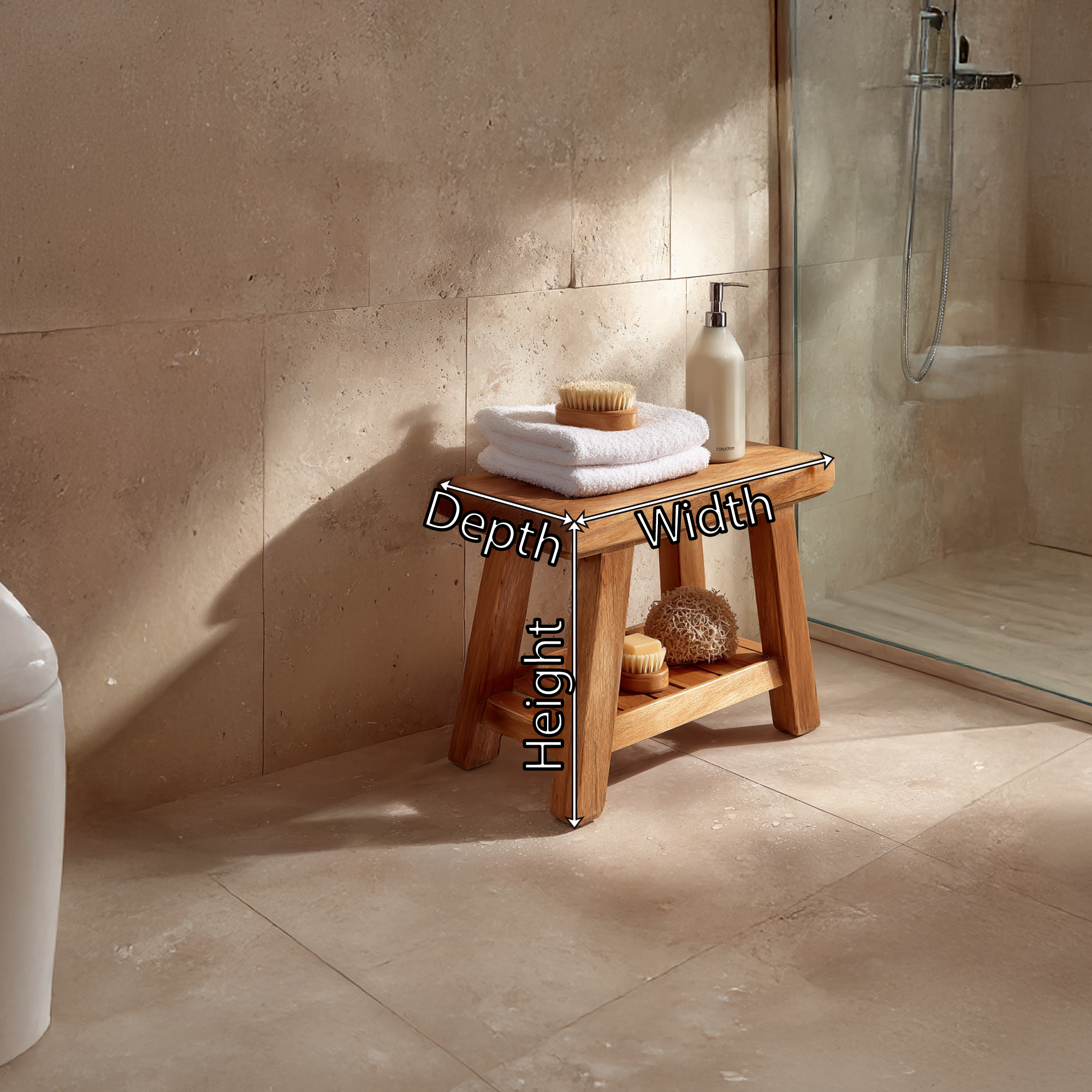 Perfect beside a walk-in shower, bathtub, or vanity, this versatile piece functions as a shower seat, bath bench, or compact side table. The lower shelf keeps towels, brushes, and bath essentials neatly organized and within easy reach, helping create a clutter-free, relaxing atmosphere.