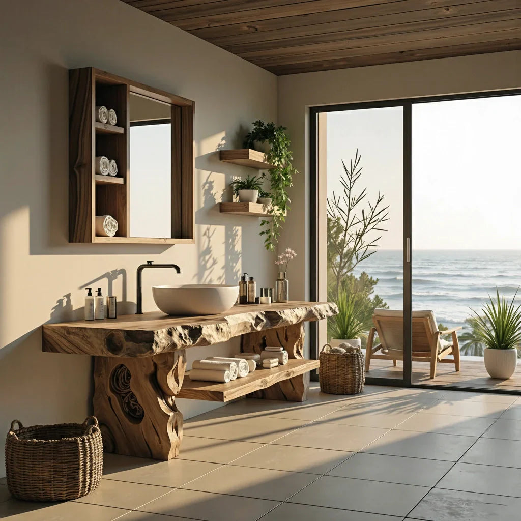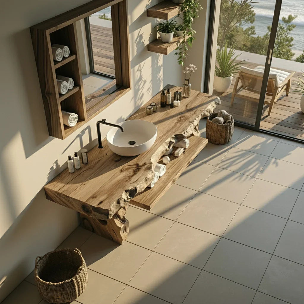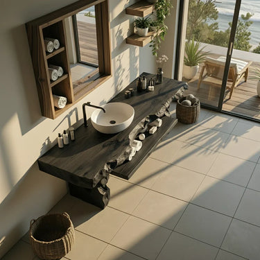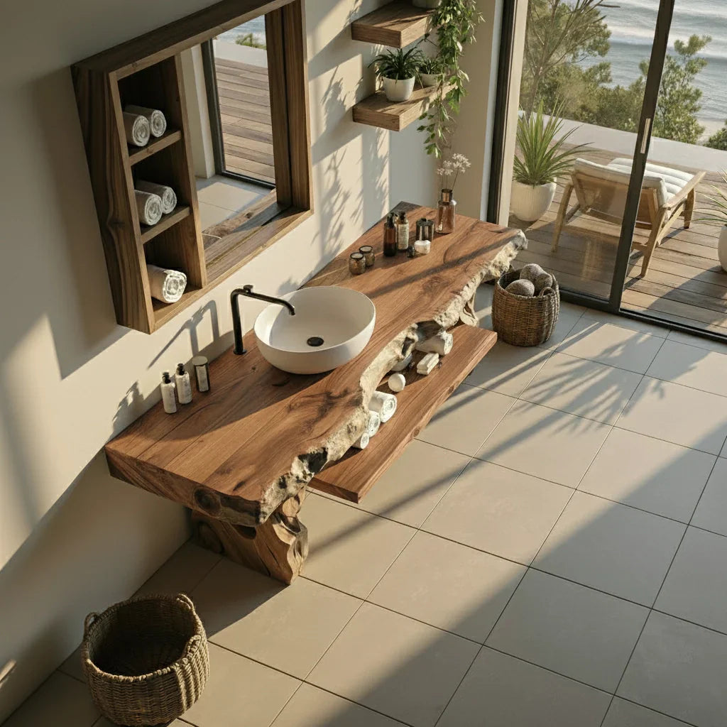 Bring a calm, coastal-inspired sense of luxury to your bathroom with this live edge solid wood vanity, designed to feel grounded and effortlessly refined. The thick, natural-edge countertop preserves the organic beauty of real timber, creating a warm surface that pairs beautifully with a vessel-style basin and clean-lined fixtures. In changing light, the wood grain and subtle texture add depth and character, helping everyday routines feel more serene.