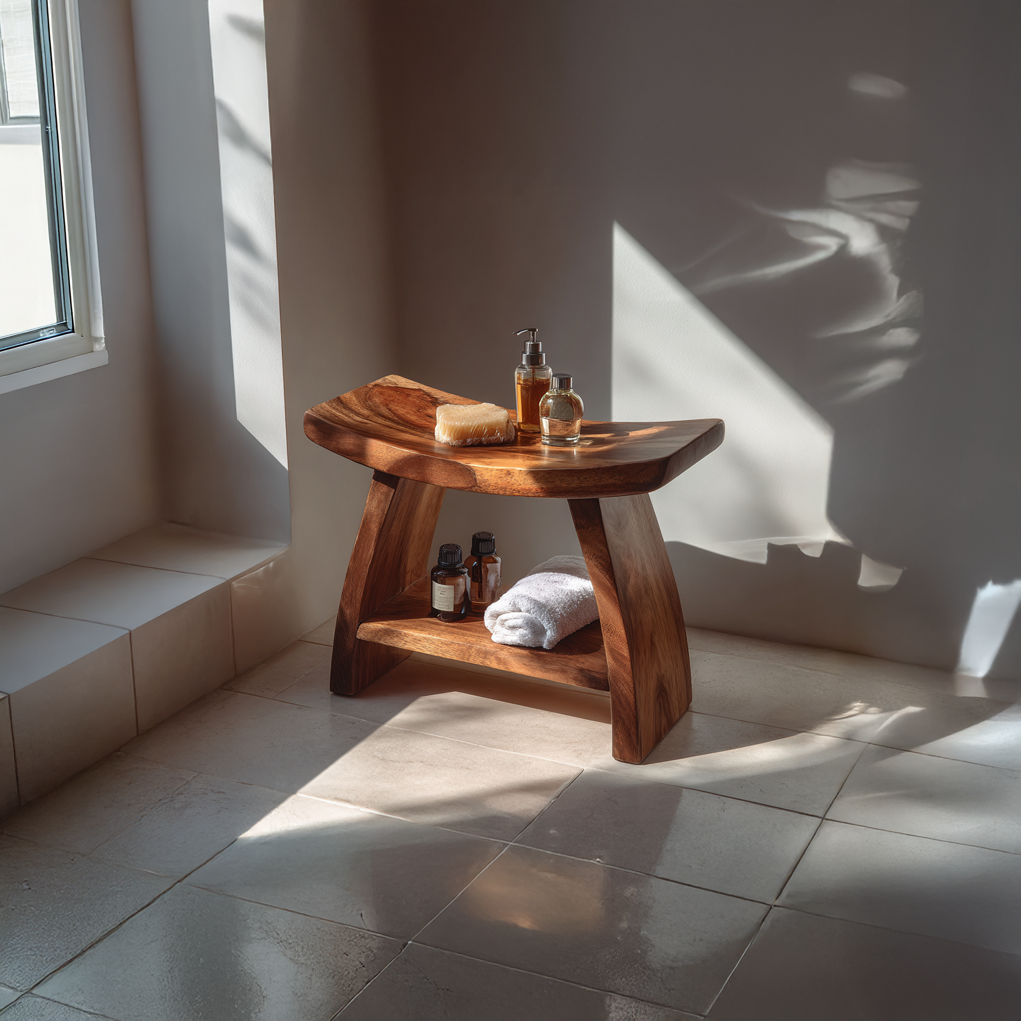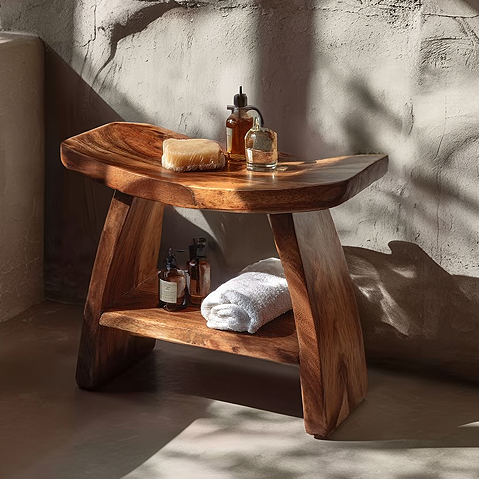 Rooted in organic form and refined simplicity, this handcrafted solid wood bath bench brings sculptural warmth to modern interiors. The gently contoured top features a subtle saddle curve, creating a comfortable seat while showcasing the natural movement of the wood grain. Supported by bold, angled legs, the structure feels both grounded and fluid an elegant balance of strength and softness.