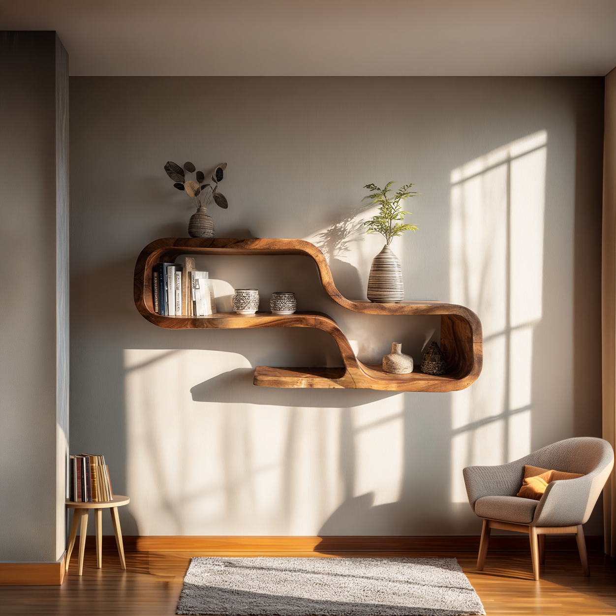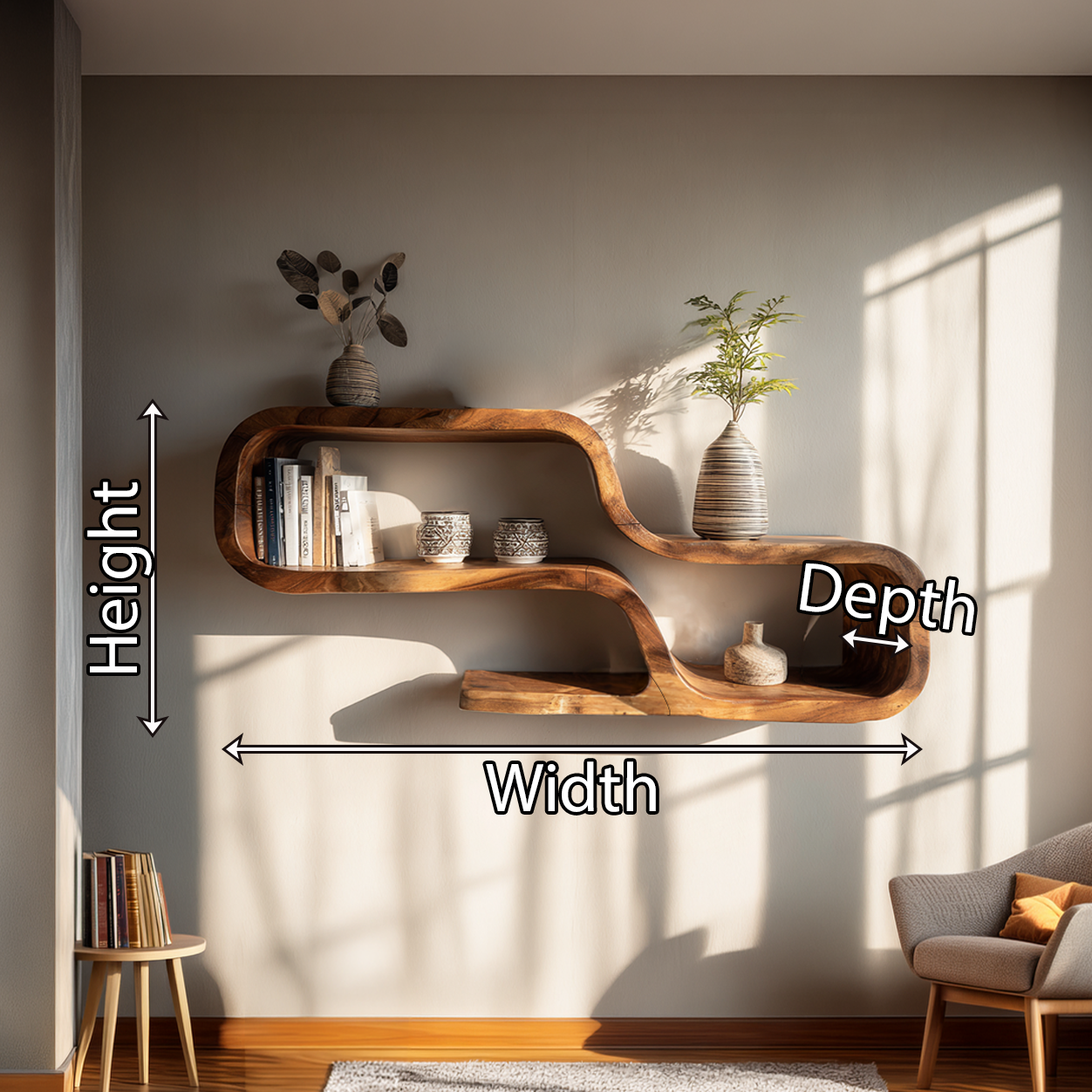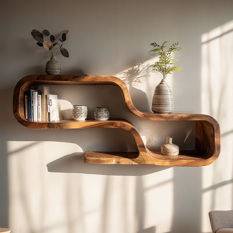 Ideal for living rooms, bedrooms, entryways, or contemporary office spaces, this sculptural wall shelf elevates books, ceramics, and decorative accents into a curated display. Its floating installation keeps the space feeling open and airy, while the warm wood tones soften modern walls and natural light. More than functional storage, it becomes an artistic focal point bringing depth, craftsmanship, and timeless organic elegance into your home decor.