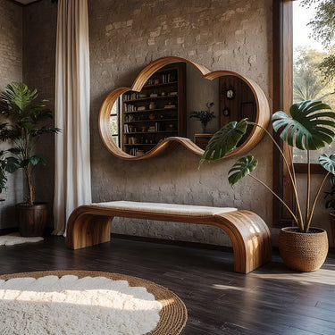 Make a bold artistic statement with this curved solid wood bench and sculptural wall mirror set, designed to transform your interior into a gallery of organic form. The flowing silhouette of the bench echoes the soft, cloud-like contours of the matching mirror, creating a harmonious focal point that feels both modern and timeless. Natural wood grain patterns ripple across each surface, adding warmth, texture, and visual depth to your space.