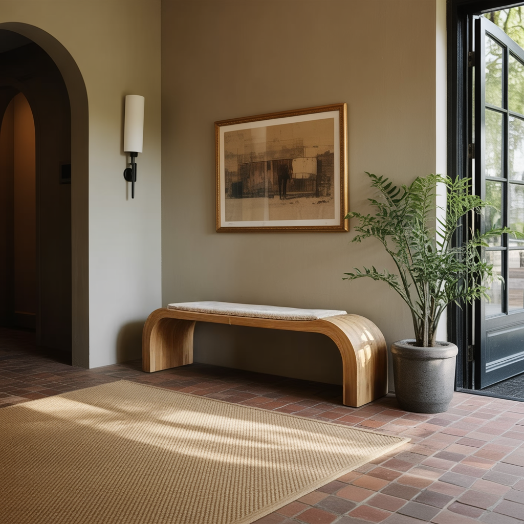 Expertly handcrafted from premium solid wood, every piece highlights unique tonal variations and distinctive grain movement. The smooth, rounded edges and seamless curves reflect careful craftsmanship and attention to detail. The bench features a gently arched base for stability and elegance, topped with a soft upholstered cushion that enhances comfort without distracting from the sculptural design.