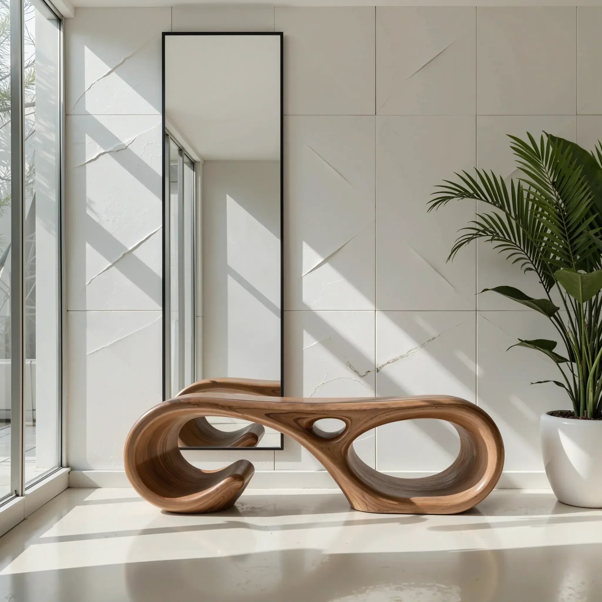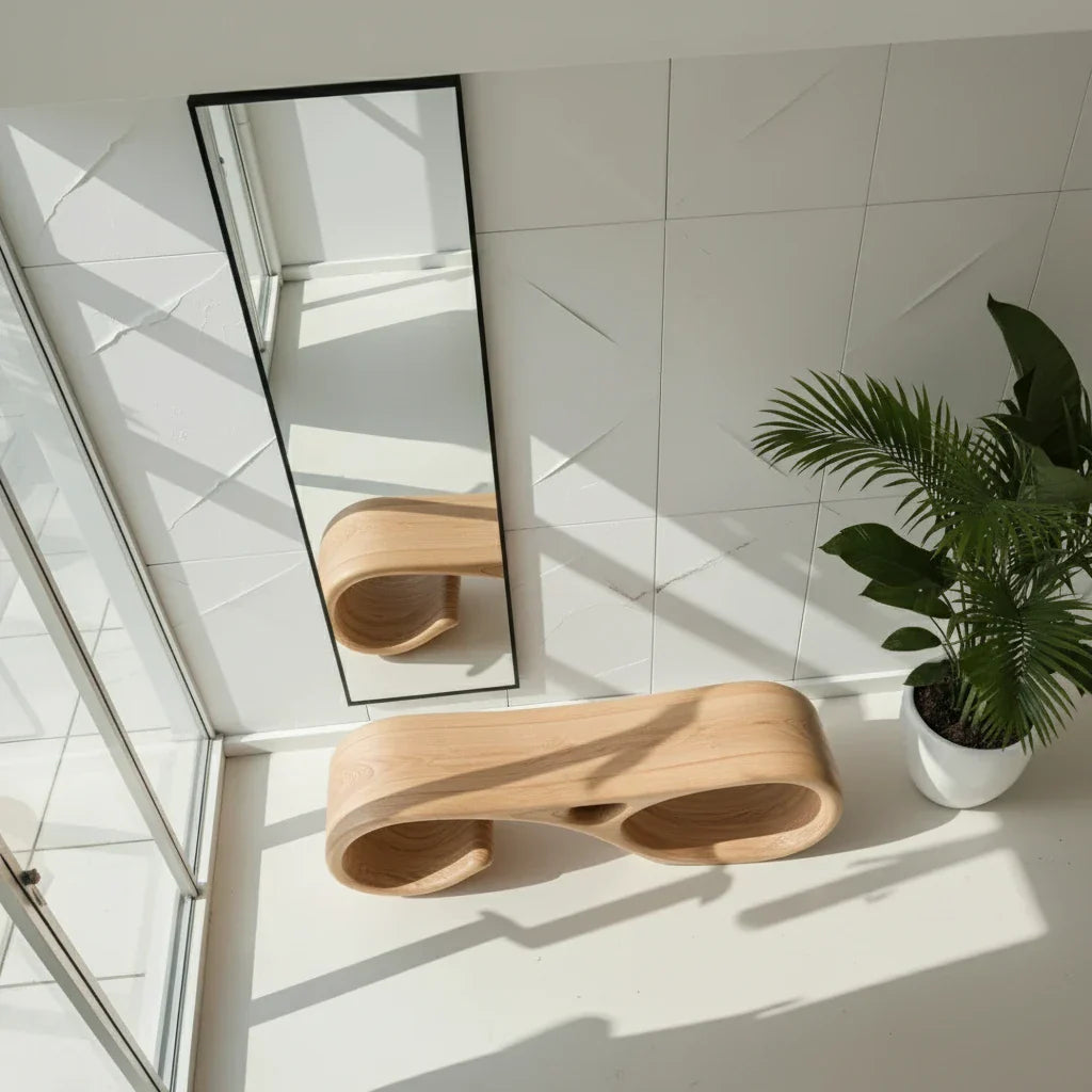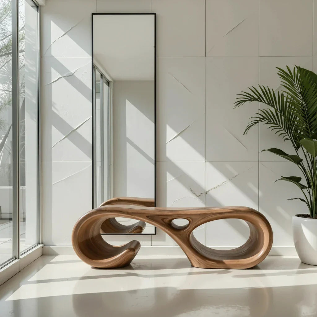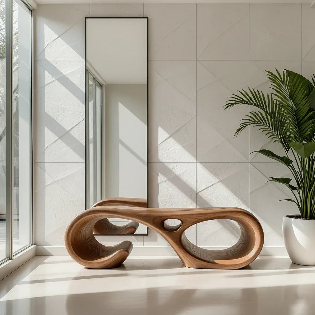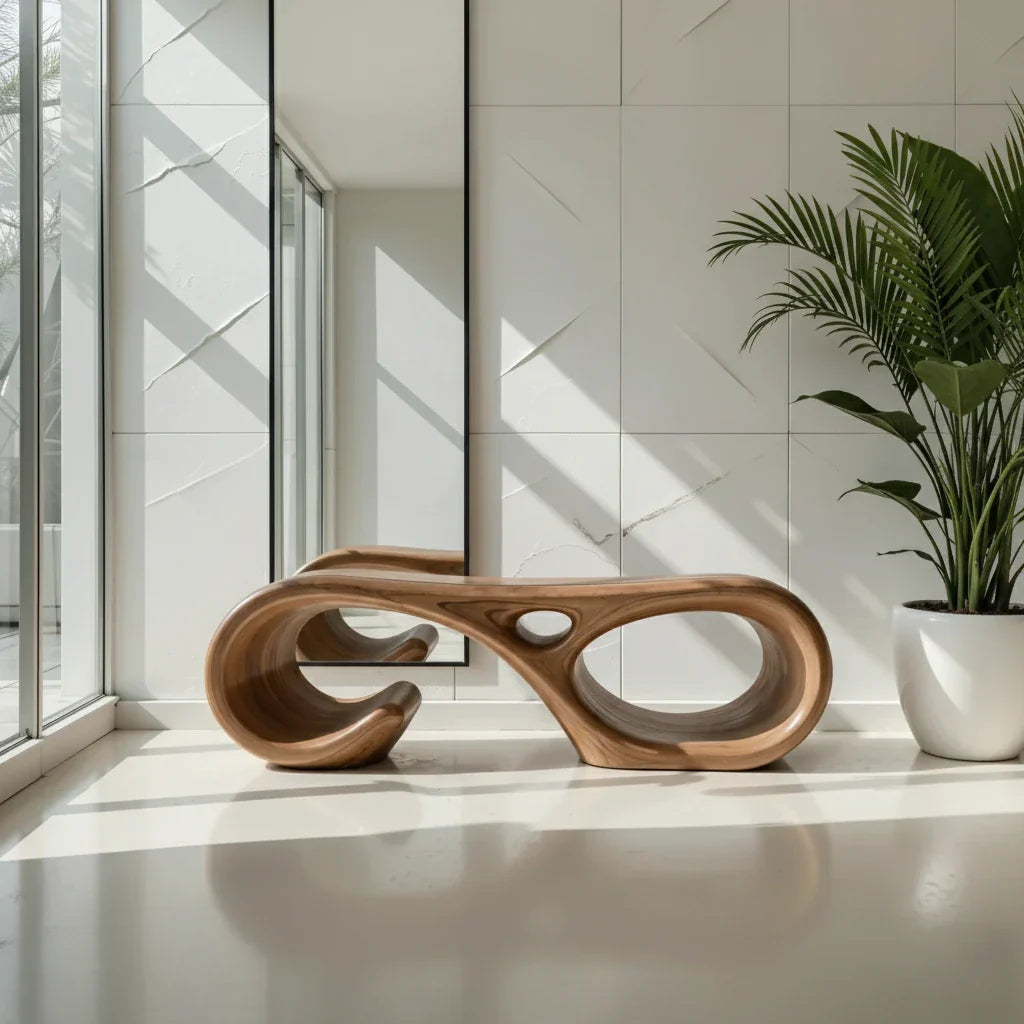 In real spaces, it works as an entry bench for putting on shoes, a minimalist hallway seat beneath a large mirror, or a sculptural accent at the foot of a bed. The open, flowing form helps the room feel spacious while still delivering a strong focal point. Pair it with stone, linen, and clean-lined accents for an organic modern look that feels warm, curated, and quietly refined.