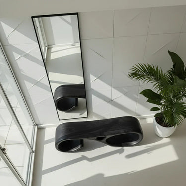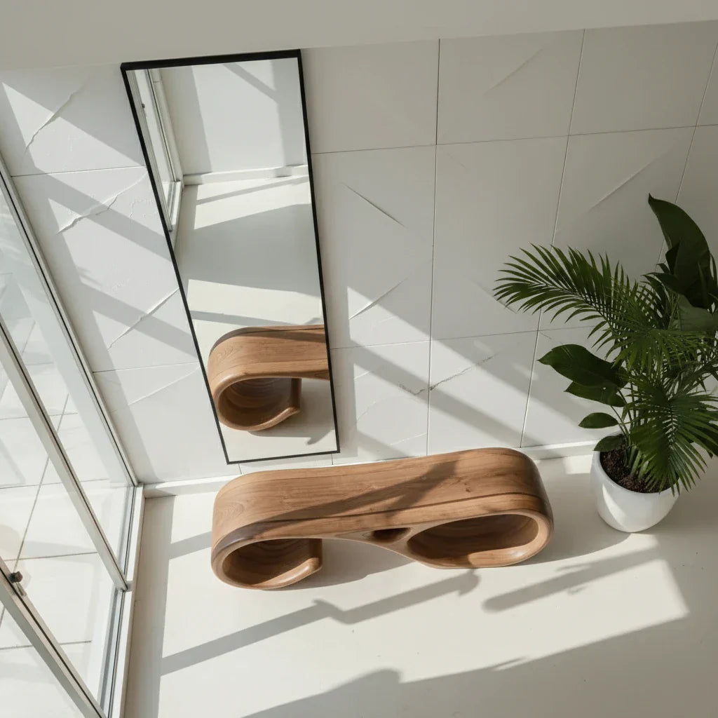 Designed as seating you can live with and art you can admire this sculptural solid wood bench brings fluid movement to minimalist interiors. Its continuous looped silhouette creates a striking sense of negative space, with smooth, rounded transitions that feel calm and architectural. The low, grounded profile makes it a natural fit for modern entryways, airy hallways, and gallery-inspired living rooms where every piece is chosen with intention.