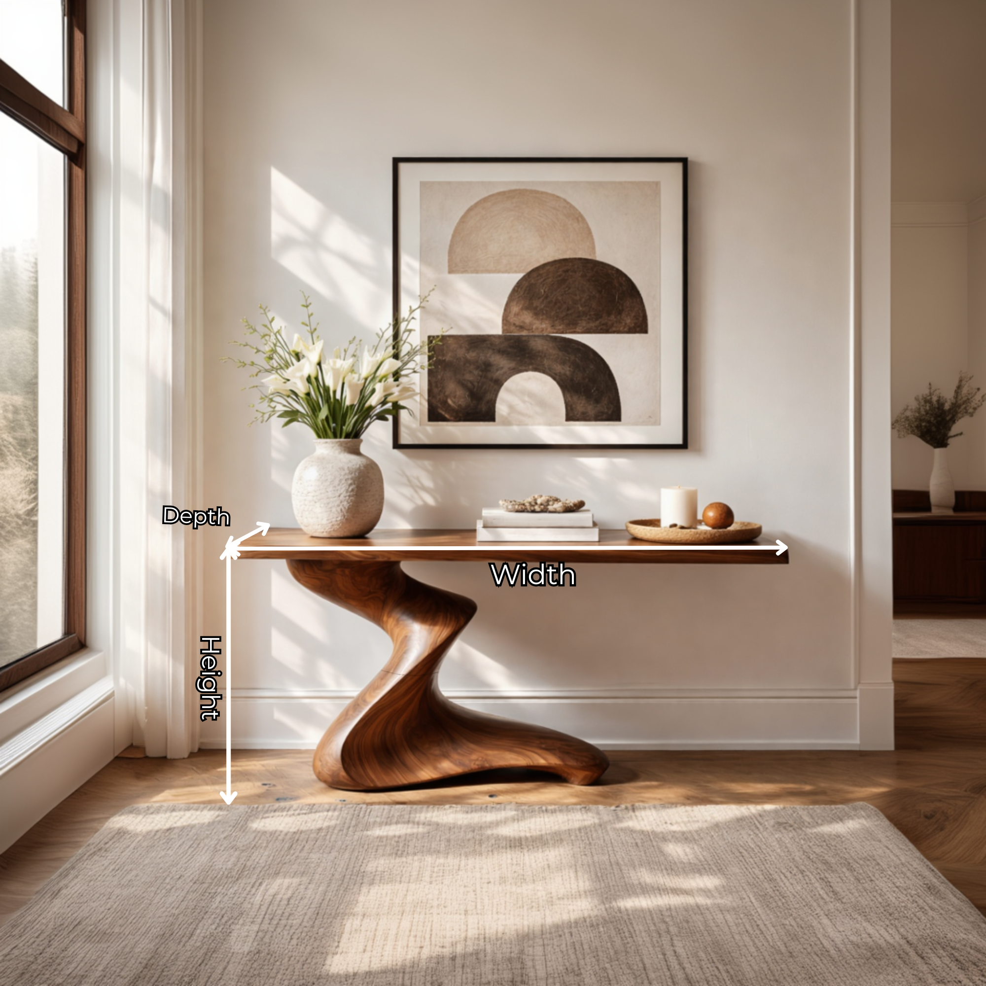 Suitable for living rooms, entryways, hallways, or open interior layouts, this console table pairs beautifully with natural materials and calm, neutral palettes. It serves as a refined display surface for vases, trays, books, and decorative objects while acting as a distinctive focal point in modern, minimalist, and contemporary interiors. Because solid wood is a natural material and each piece is finished individually, slight variations in grain, tone, and surface detail may occur.