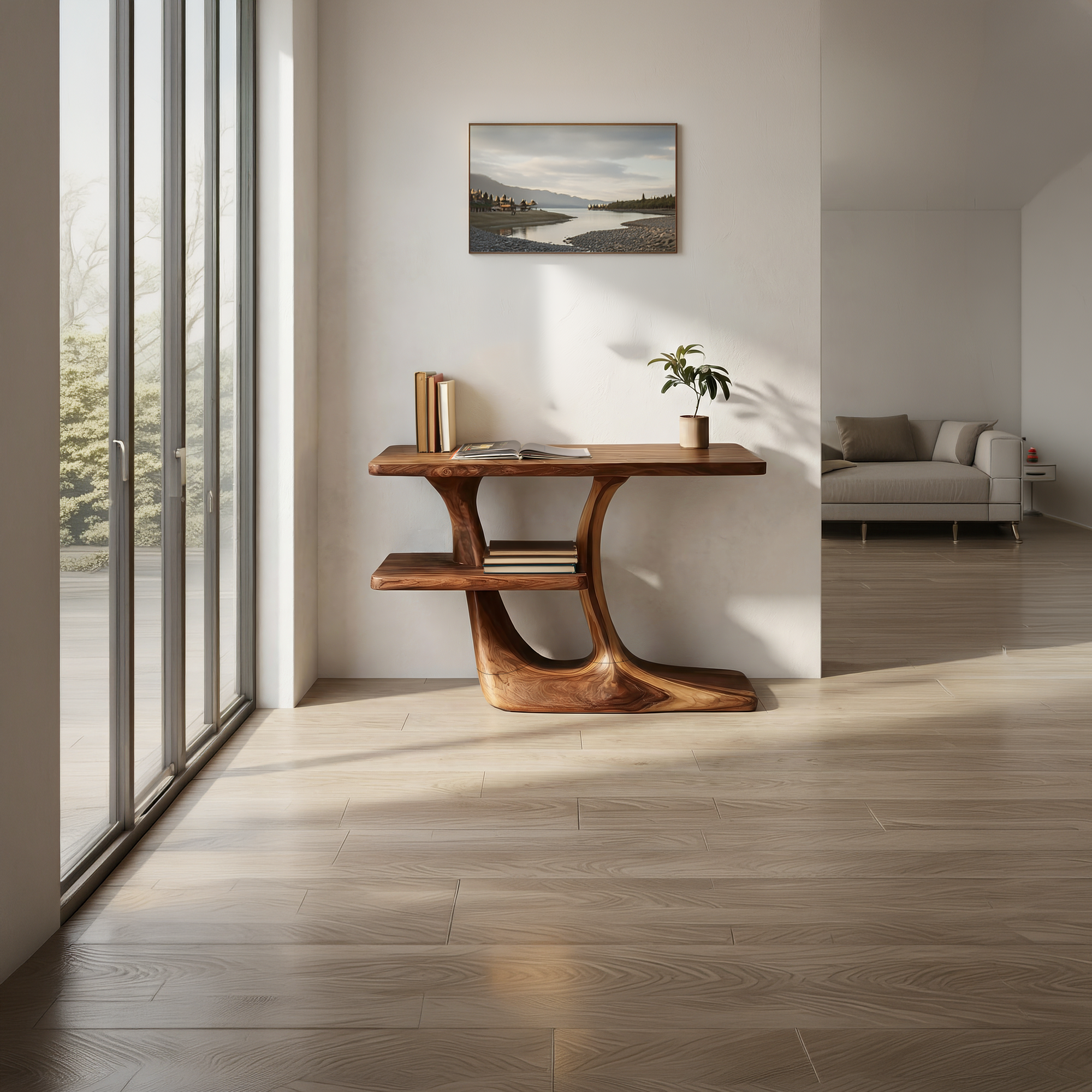 A bold expression of organic modern design, this sculptural solid wood console table is crafted to bring movement and artistic presence into refined interiors. The fluid, curved base flows seamlessly into a clean, elongated tabletop, creating a balanced silhouette that feels both architectural and natural. Its integrated lower shelf adds function without interrupting the minimalist form, making it as practical as it is visually striking.