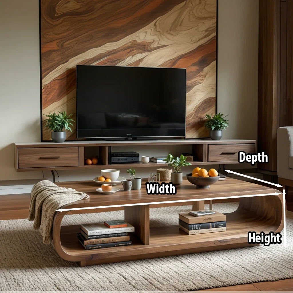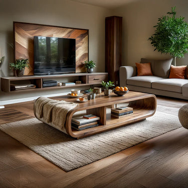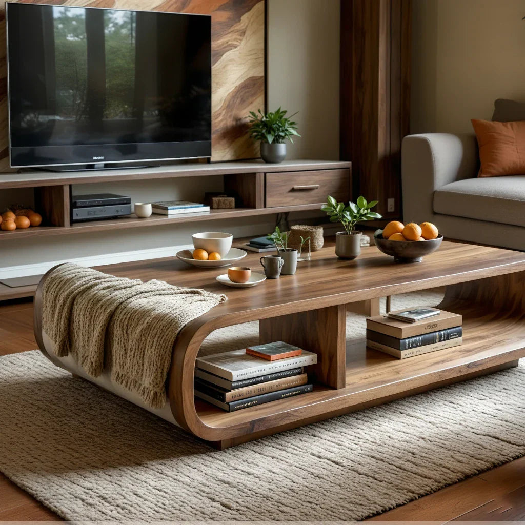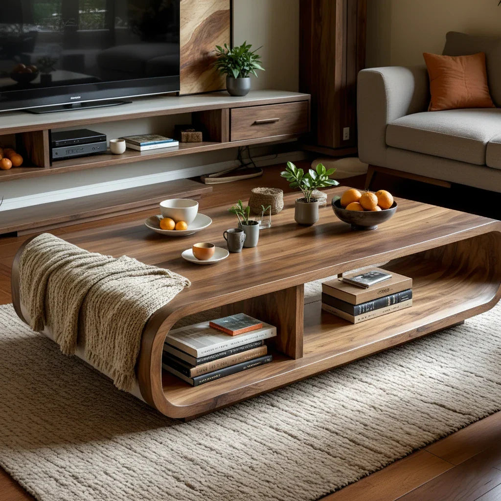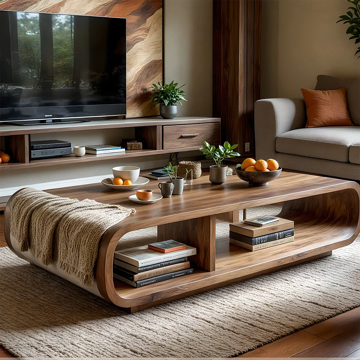 An open storage shelf runs through the center of the table, offering practical space for books, baskets, remotes, and everyday essentials. This integrated design keeps the top free for serving coffee, displaying ceramics, or styling greenery, making the table both organized and visually light. Perfect for contemporary, Japandi, or Scandinavian-inspired interiors, it pairs effortlessly with neutral sofas, textured rugs, and indoor plants. Combining solid-wood construction, curved modern lines, and generous storage, this coffee table brings warmth, functionality, and understated elegance to any home.