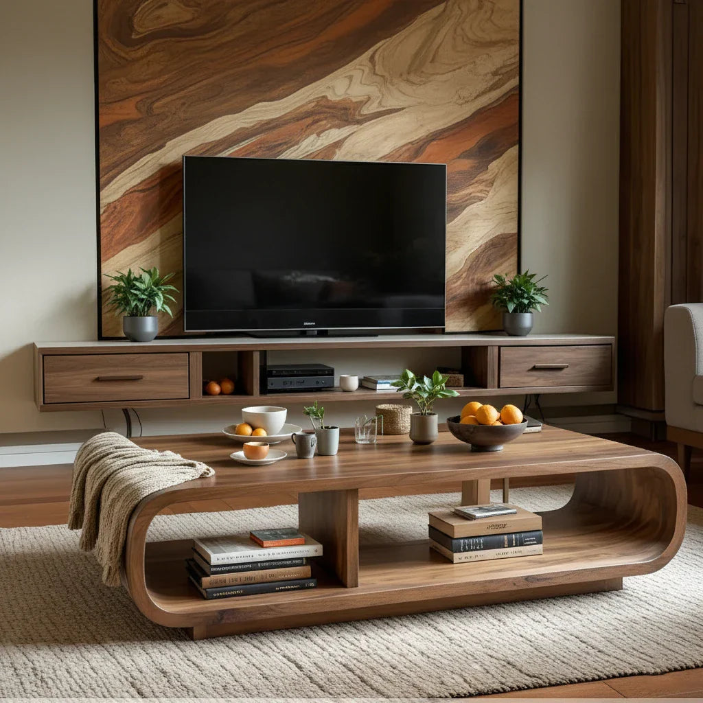 Curved Solid-Wood Coffee Table with Storage for Family Lounges