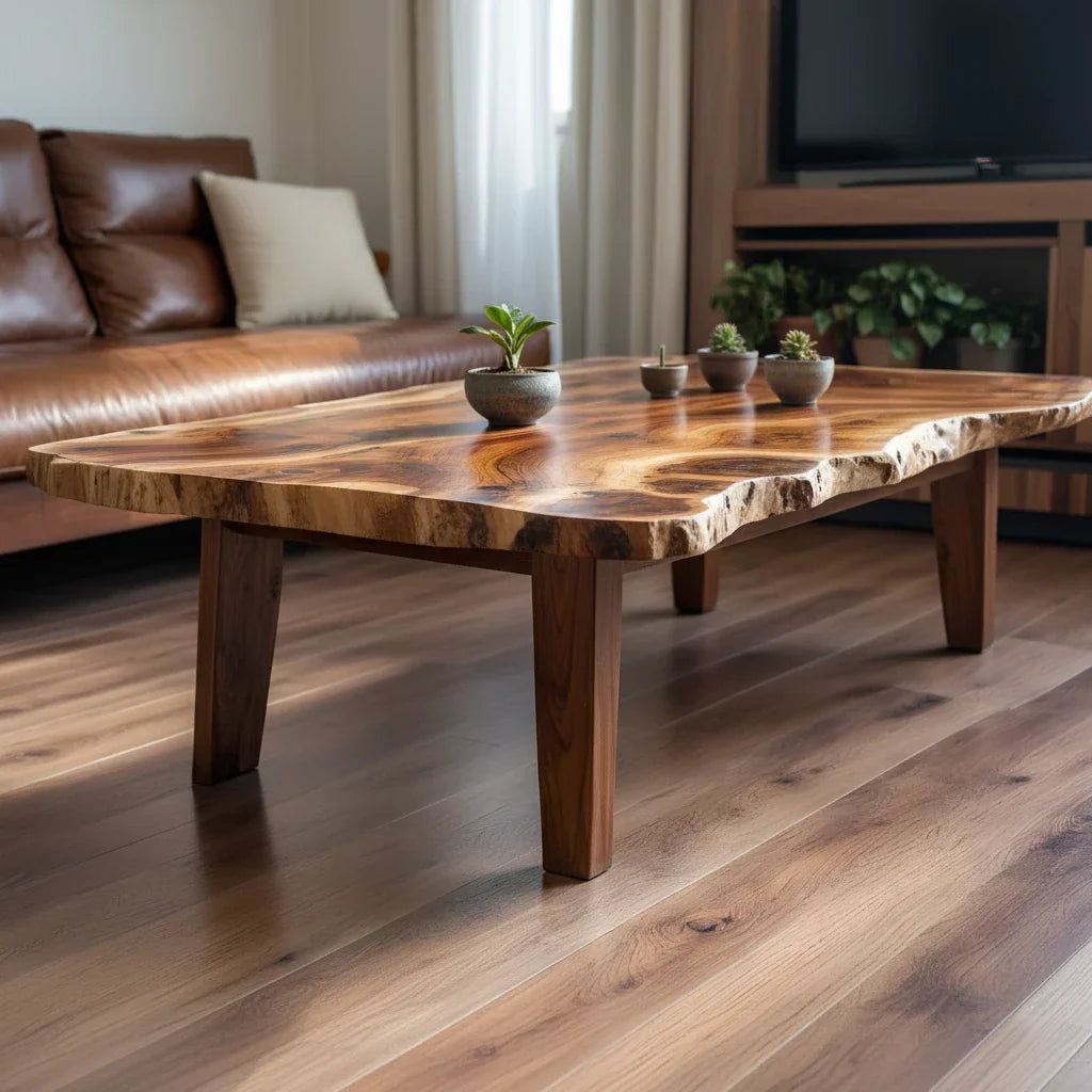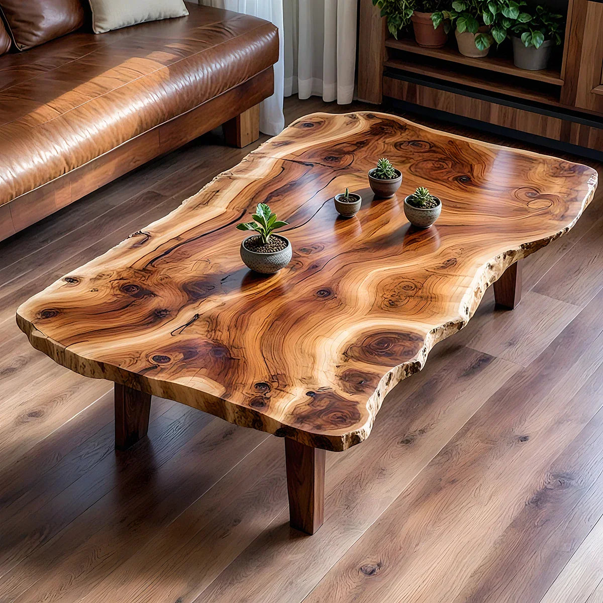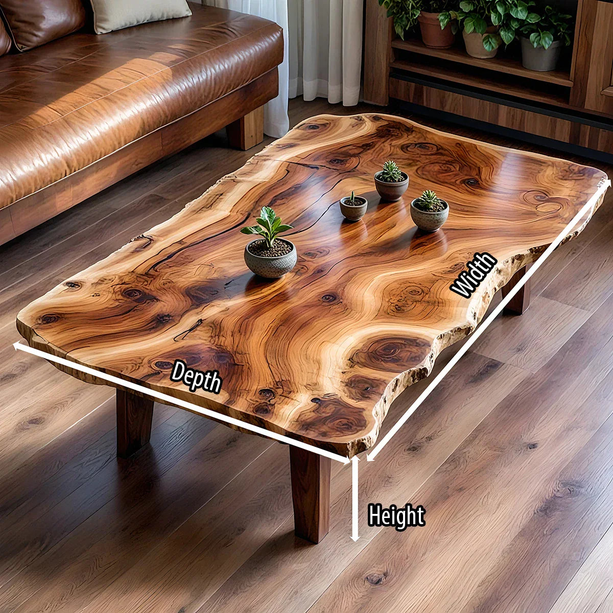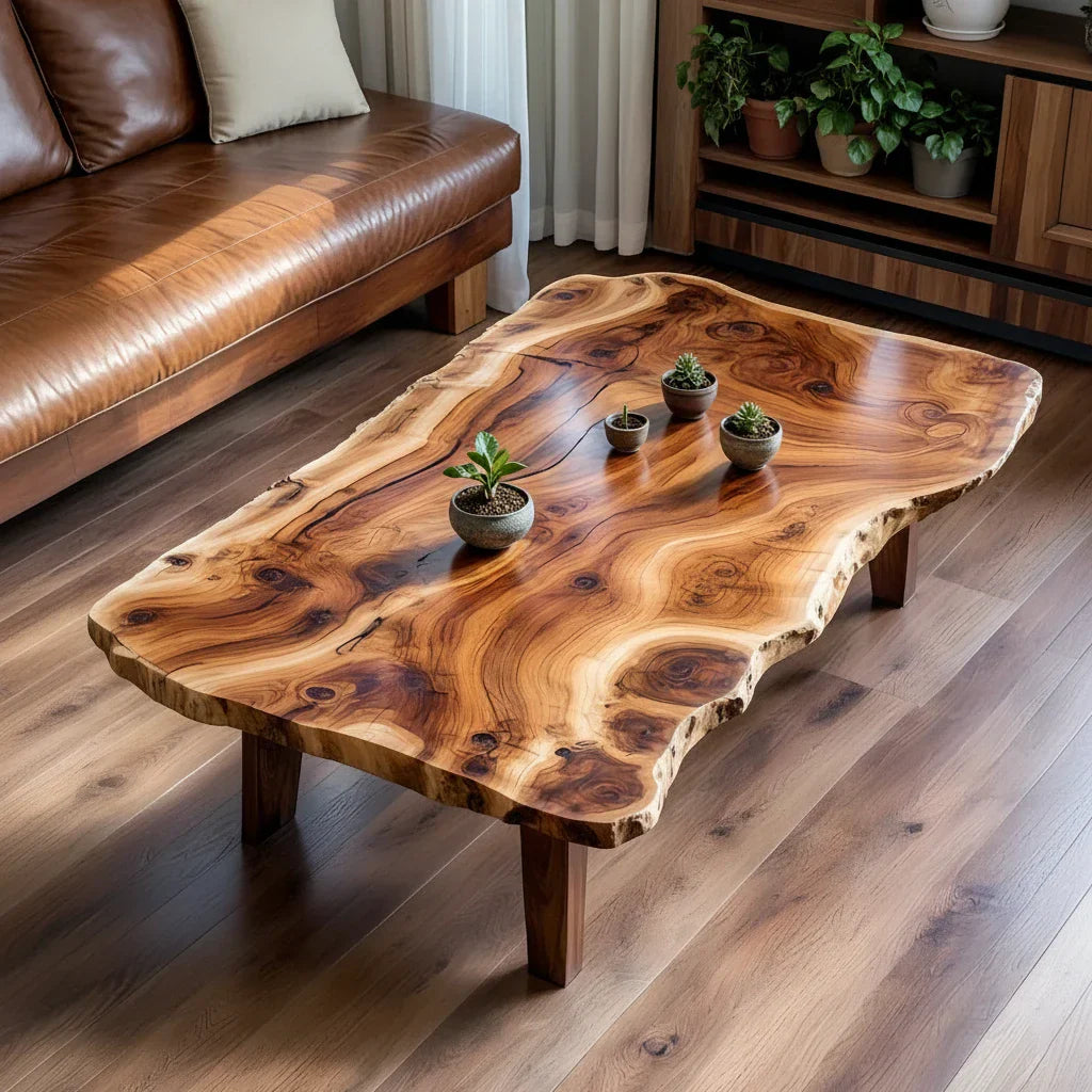 Supported by sturdy solid-wood legs, the table feels grounded and stable without appearing heavy. It pairs beautifully with leather sofas, neutral textiles, and indoor greenery, working equally well in organic-modern, rustic-contemporary, or Japandi-inspired interiors. Styled with simple ceramics, books, or small potted plants, this coffee table functions as both practical furniture and sculptural natural-wood décor, bringing warmth, personality, and a striking focal point to any home.