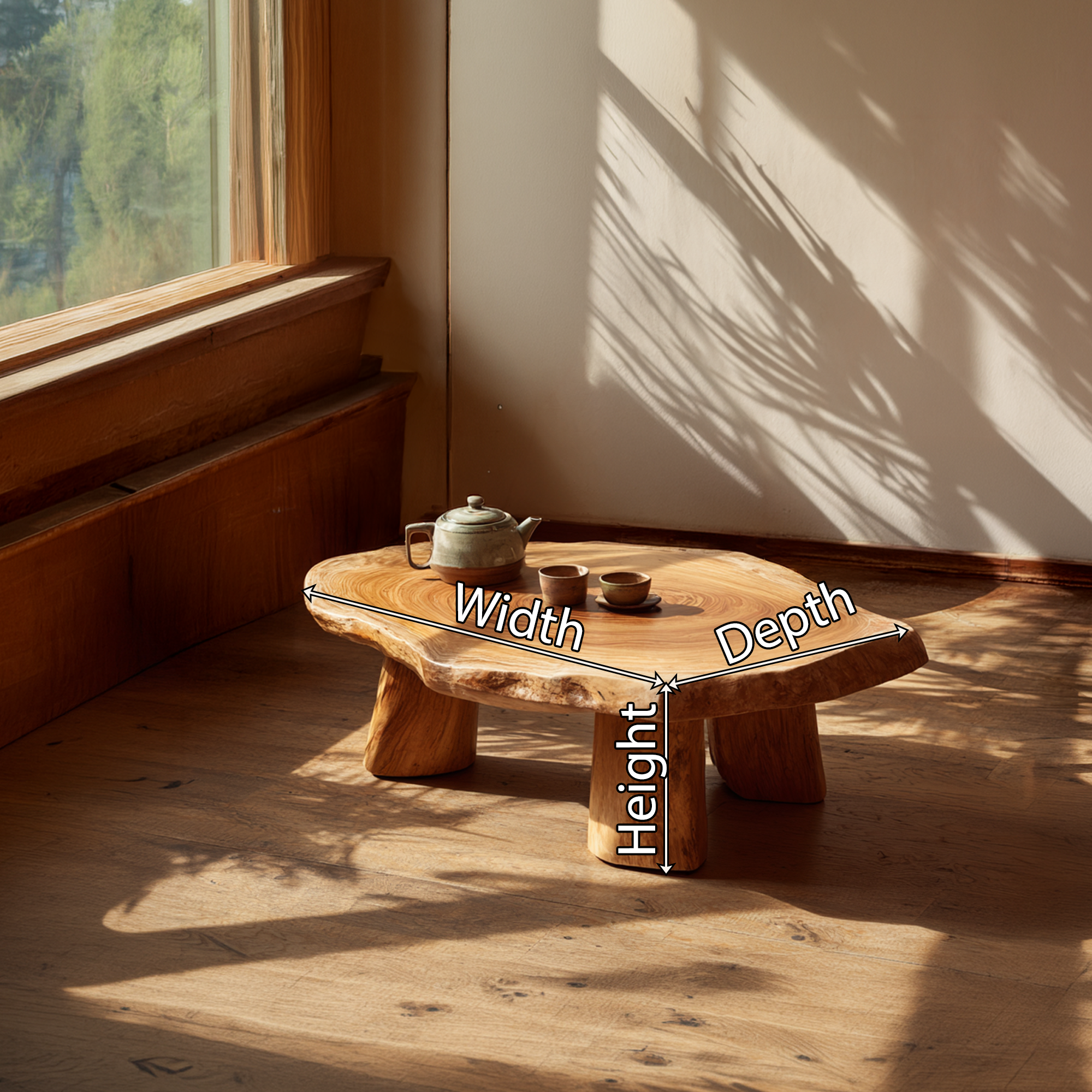 Handcrafted from solid natural wood, each table is carved from a single slab to maintain structural integrity and visual continuity. The thick top showcases raw live edges, subtle knots, and warm golden tones that deepen over time. Four solid block legs provide strong grounding support while maintaining a balanced, low-profile silhouette ideal for floor seating or relaxed lounge spaces.