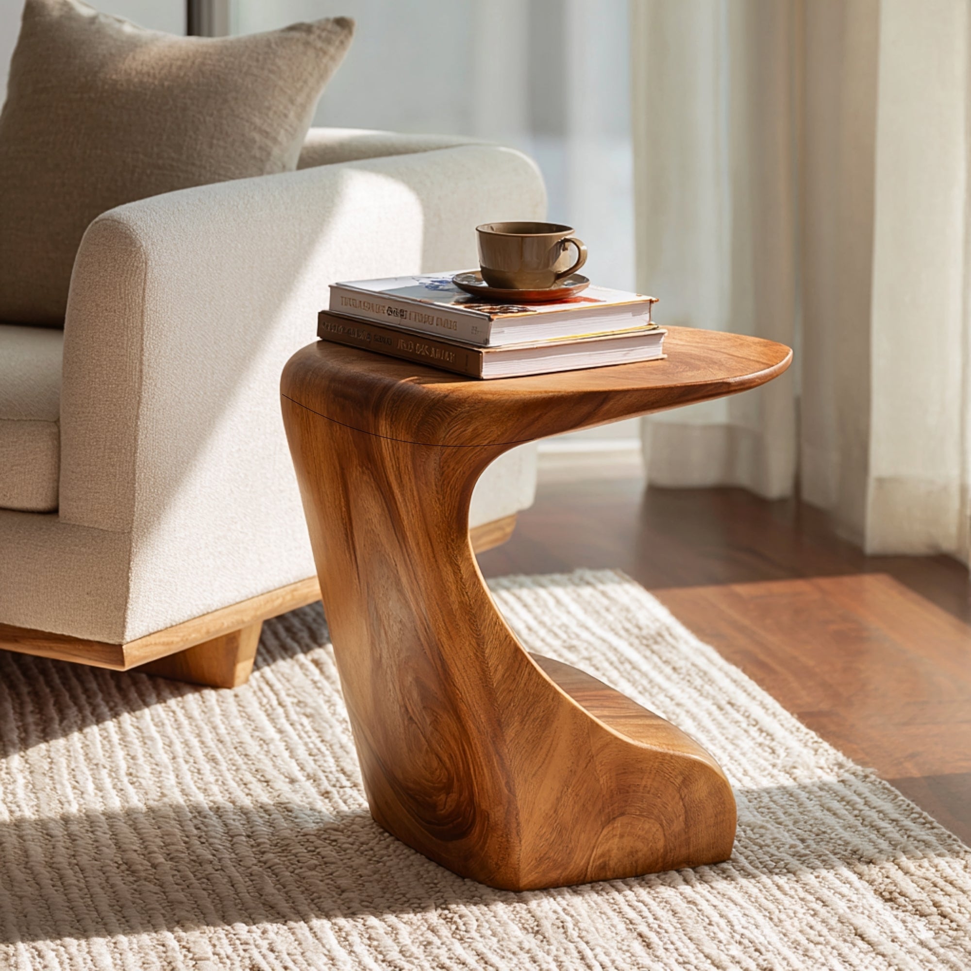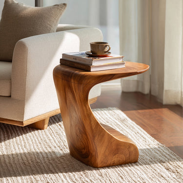 This sculptural side table is hand-shaped from solid wood with a smooth, flowing silhouette that feels both modern and organic. The curved profile creates a bold statement piece while keeping a compact footprint that styles easily beside a sofa or lounge chair.