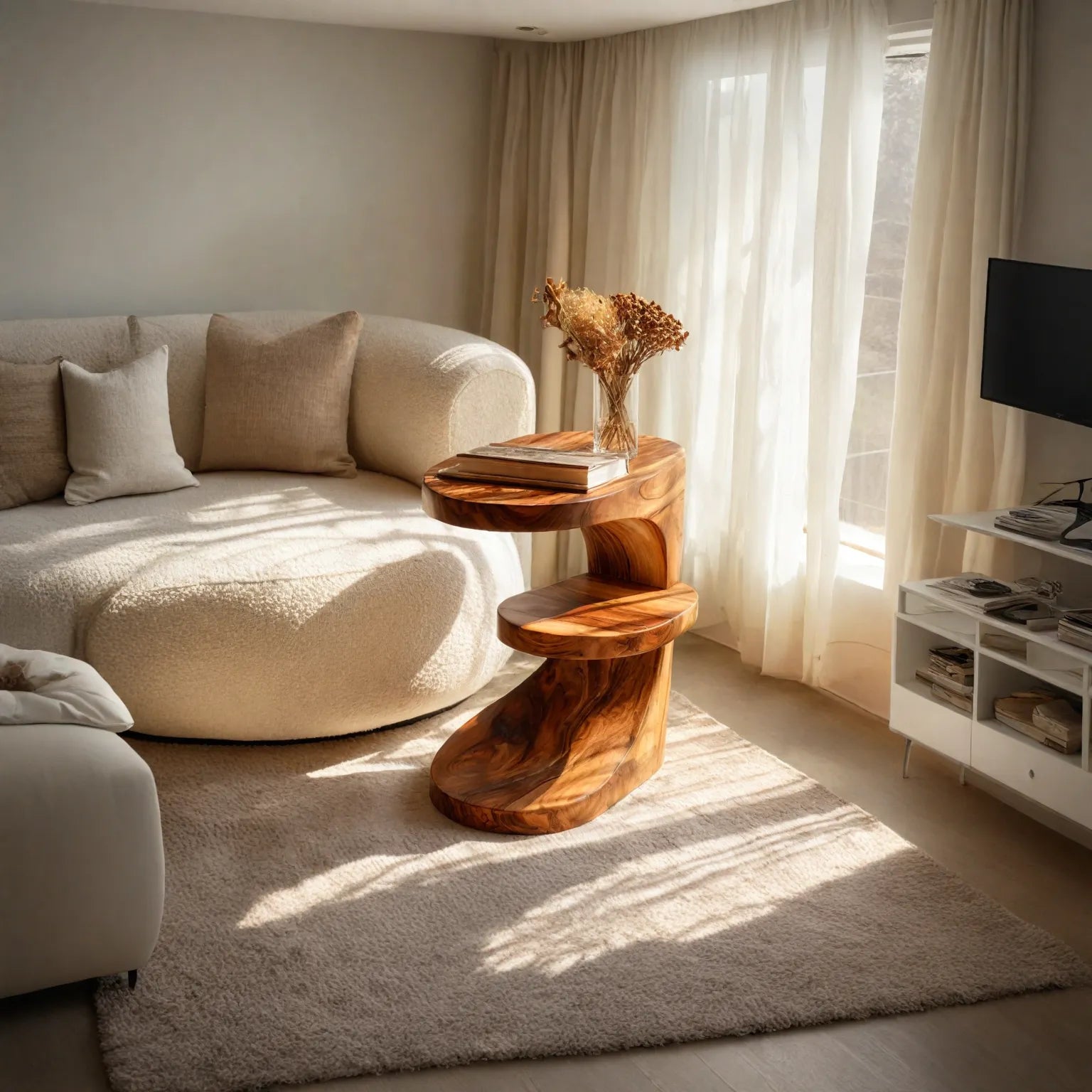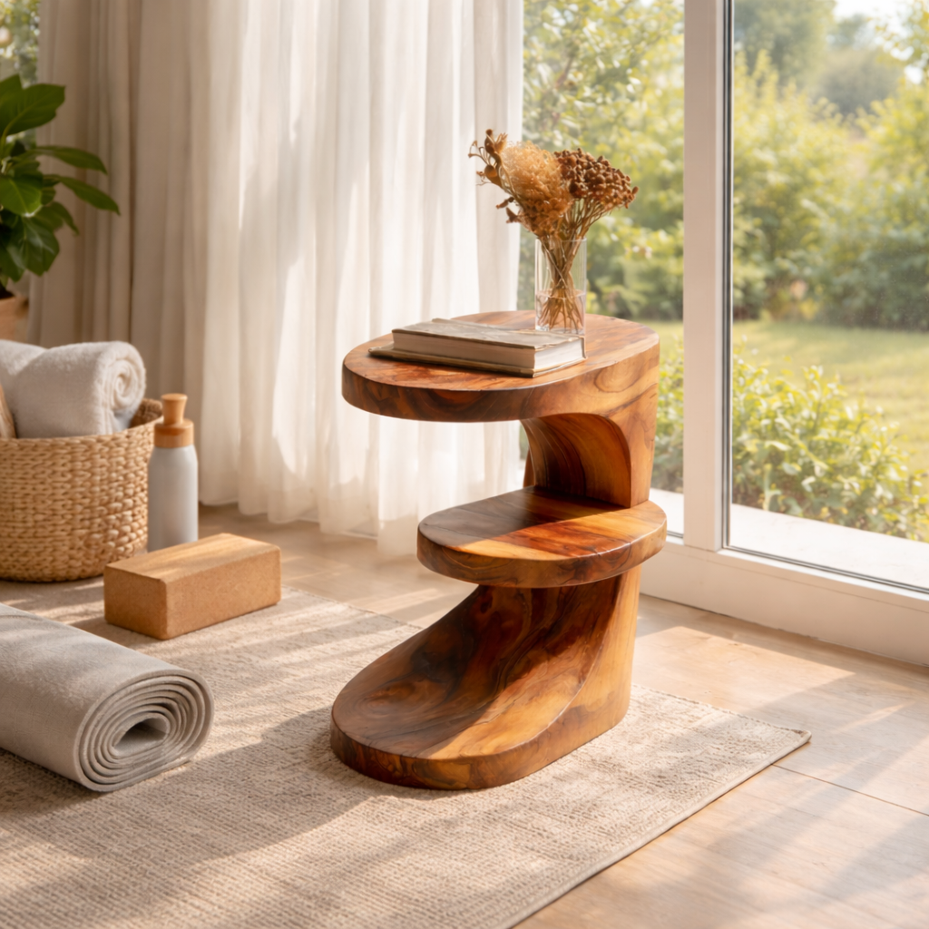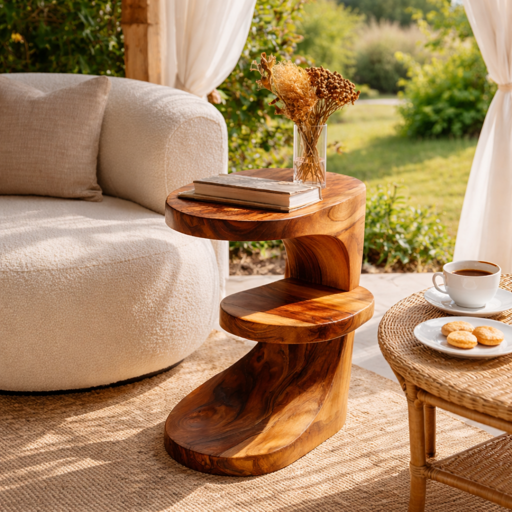 This sculptural solid wood side table blends functional surface space with a graceful, flowing silhouette. Carved from a single block of hardwood, the design steps gently downward from a rounded top to a curved middle shelf and a grounded base, creating a natural Z-shaped profile. The generous top surface is ideal for a book, cup, or small vase, while the middle tier keeps extra reading or accessories close at hand without cluttering the sofa or lounge chair.