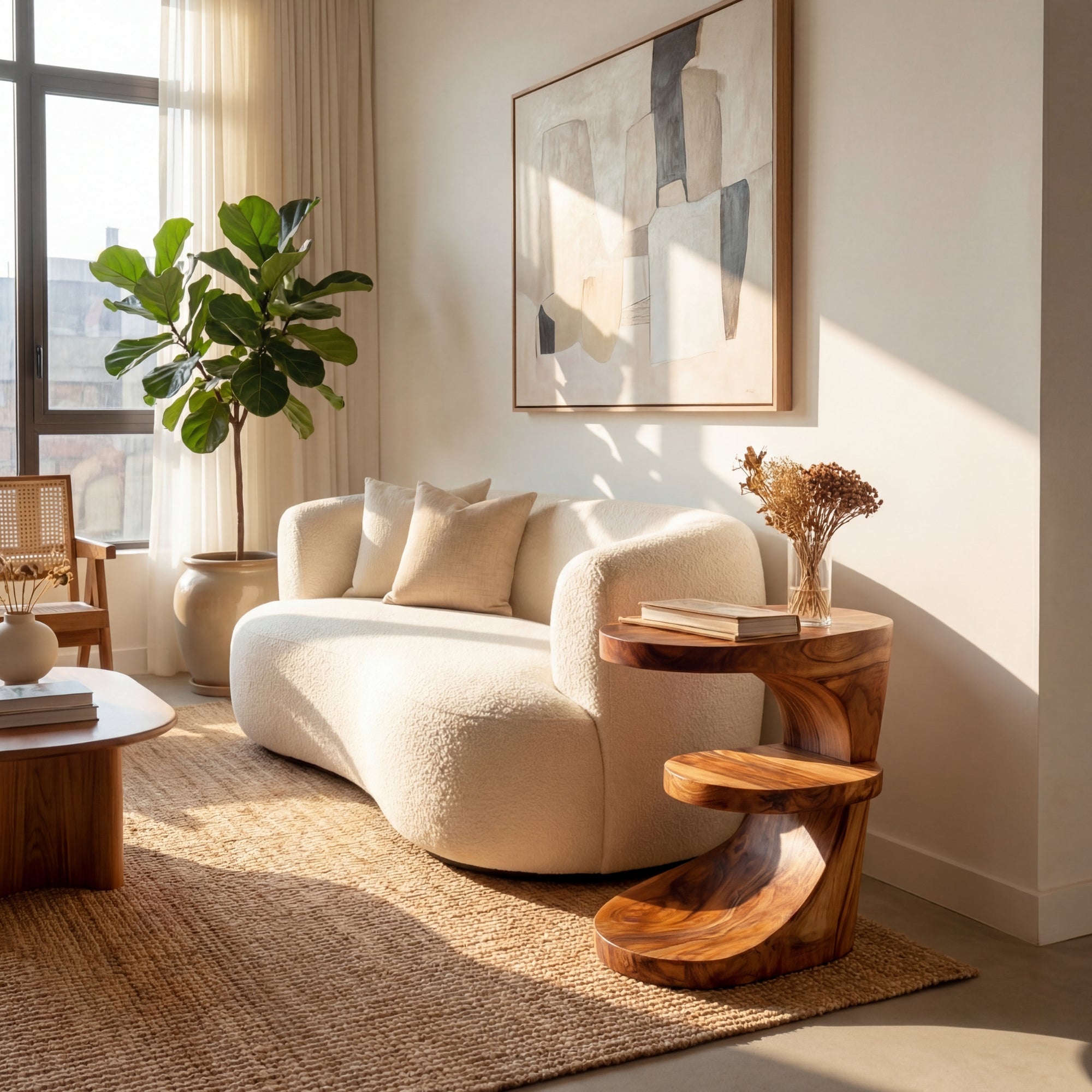 The smooth hand-shaped curves highlight rich grain movement and warm tonal variation across the entire piece. A soft satin finish protects the wood while letting its natural character remain visible, making the table feel warm and tactile rather than glossy or overtreated. The substantial base provides a stable footprint, so the table sits securely beside a sofa, armchair, or window seat.
