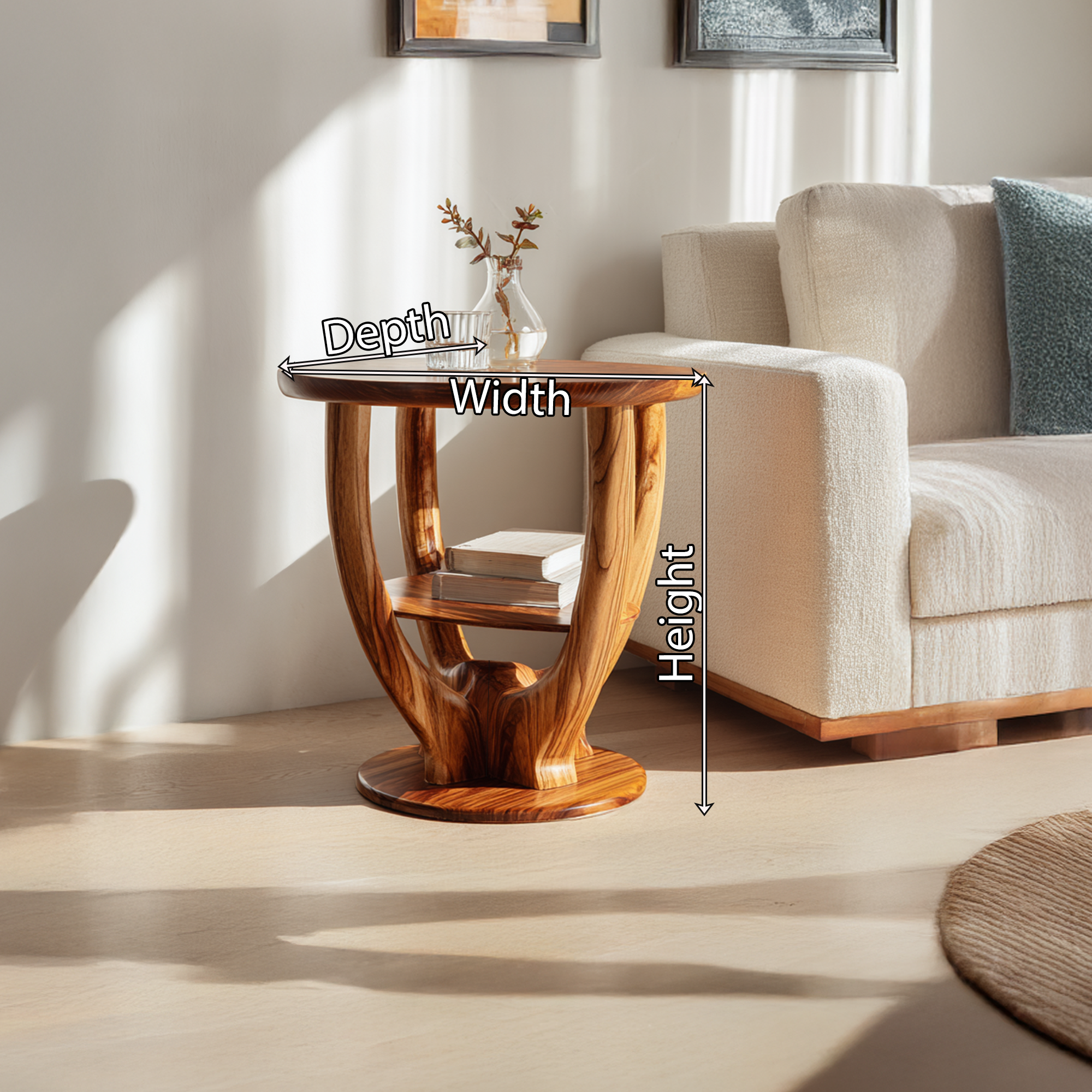 A lower integrated shelf offers practical storage for books or decorative objects, while the rounded tabletop provides an ideal surface for lighting, ceramics, or everyday essentials. Perfect as a side table beside a sofa, an accent table in a bedroom, or a sculptural piece in a reading corner, it complements organic modern, minimalist, and contemporary interiors.