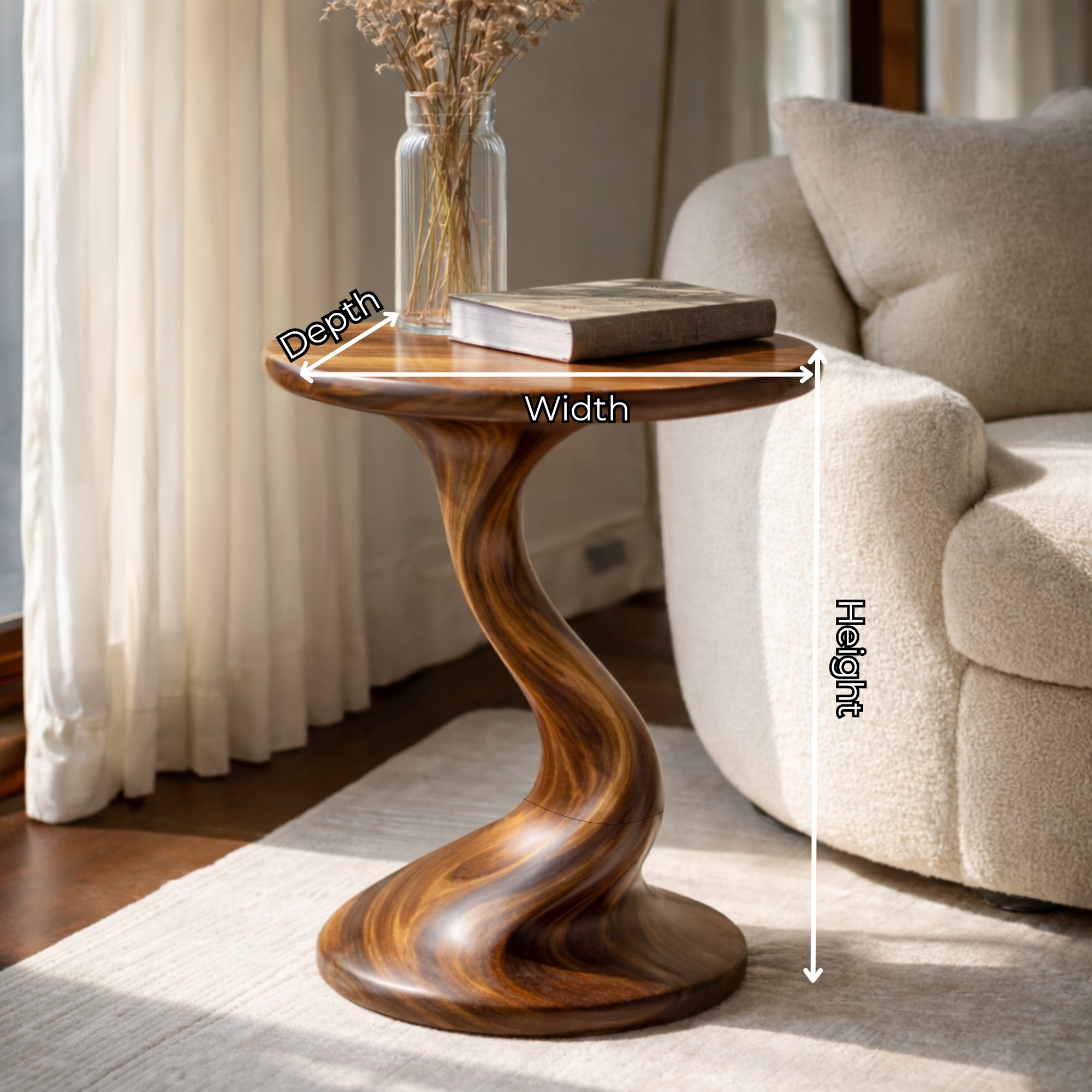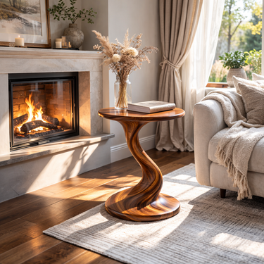This sculptural accent table is carved from a single block of solid wood and designed to sit beautifully beside a sofa or lounge chair. The softly rounded top flows into an elegant twisted pedestal and wide base, creating a stable form that feels both organic and contemporary.