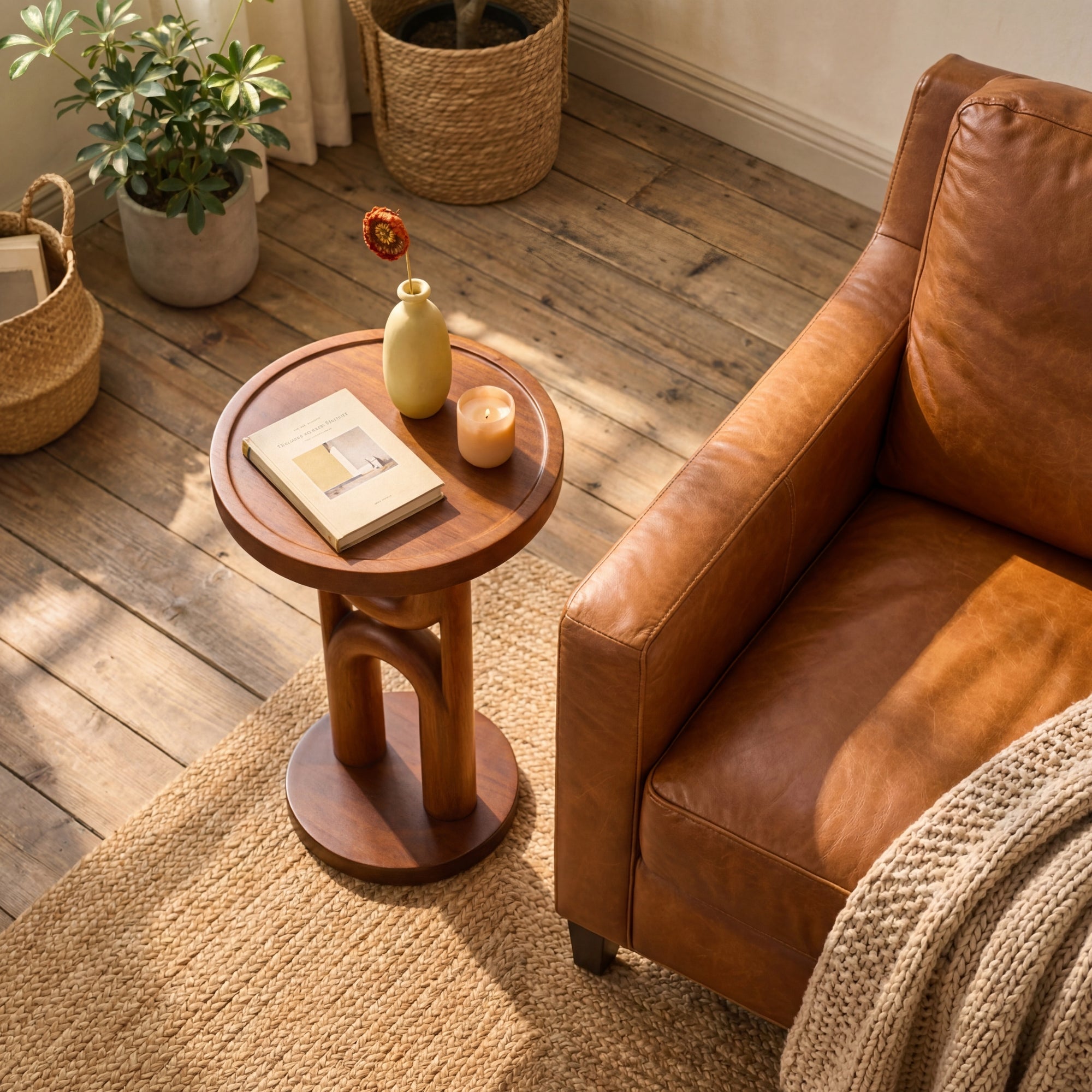 The round tabletop offers a practical surface for a book, a candle, or a small vase, keeping essentials within easy reach. Subtle grain movement and tonal variation run through the wood, giving the piece depth and character that changes slightly with the light.