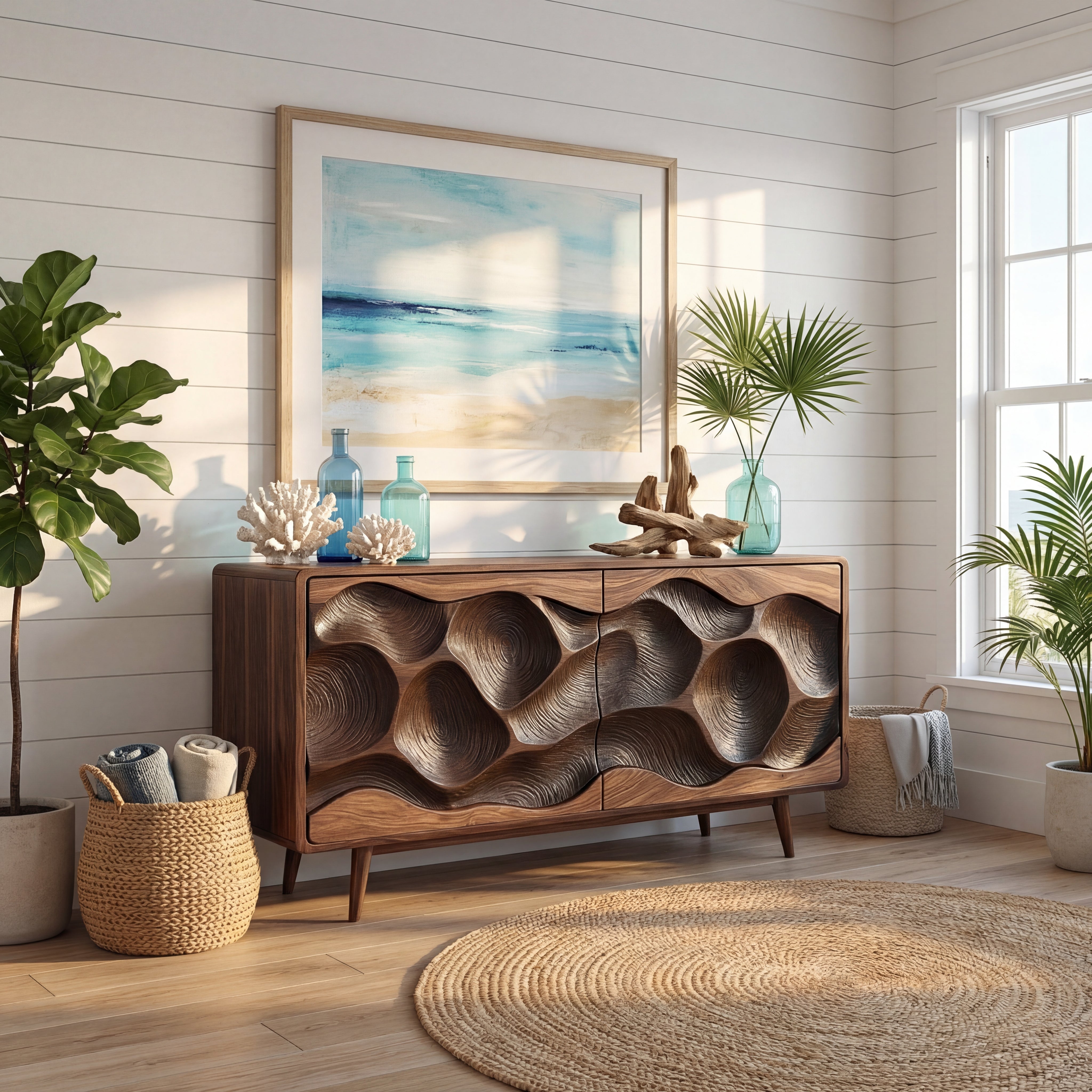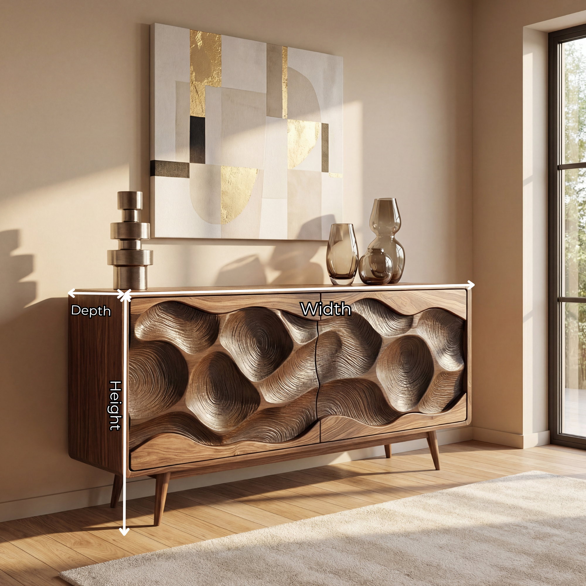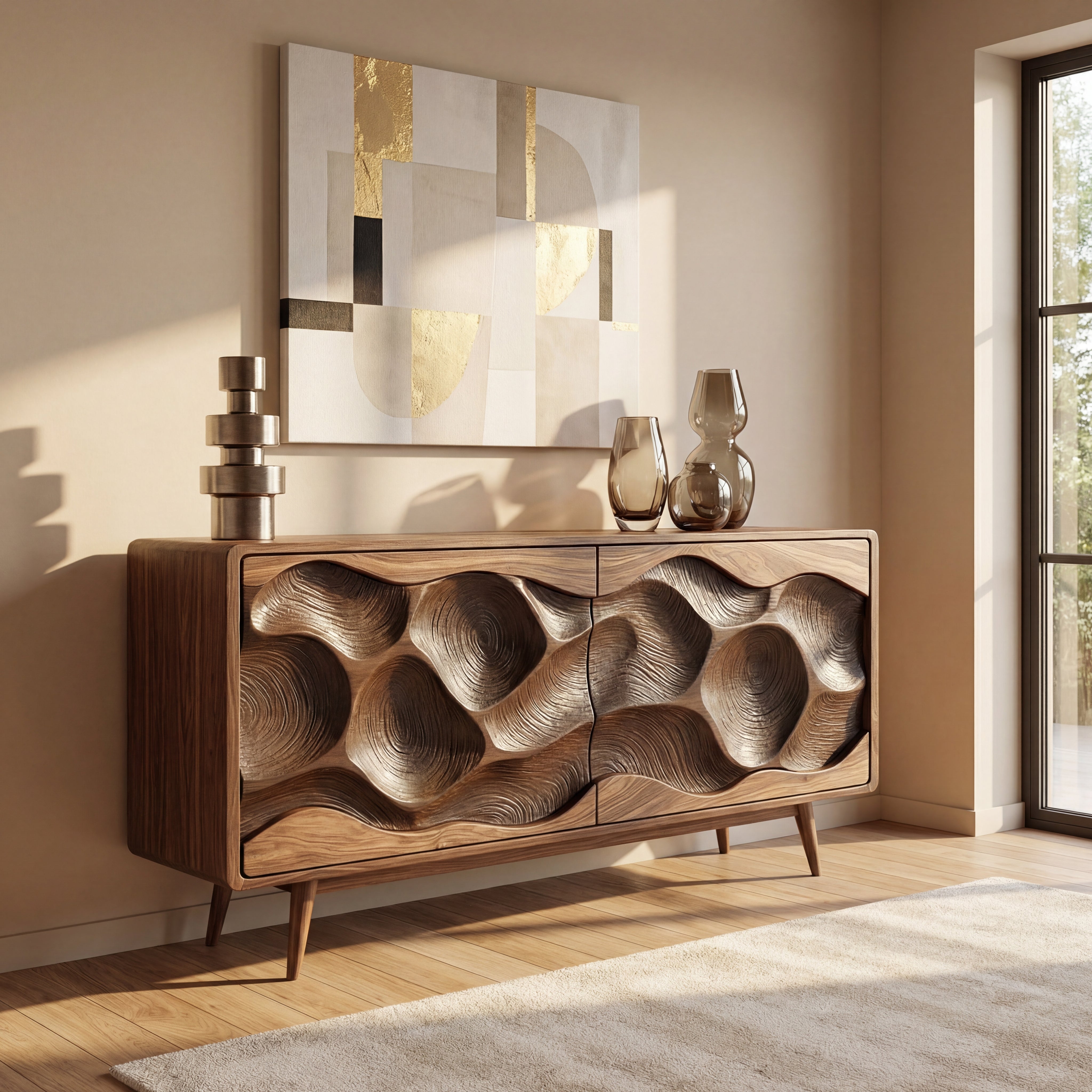 This sculptural credenza transforms everyday storage into a statement piece. Across the front, deep carved wave forms shift from light to shadow, giving the cabinet a sense of movement while the clean frame and tapered legs keep the silhouette refined. It works beautifully as a sideboard in the dining room, a media cabinet in the living room, or a focal console along a feature wall.