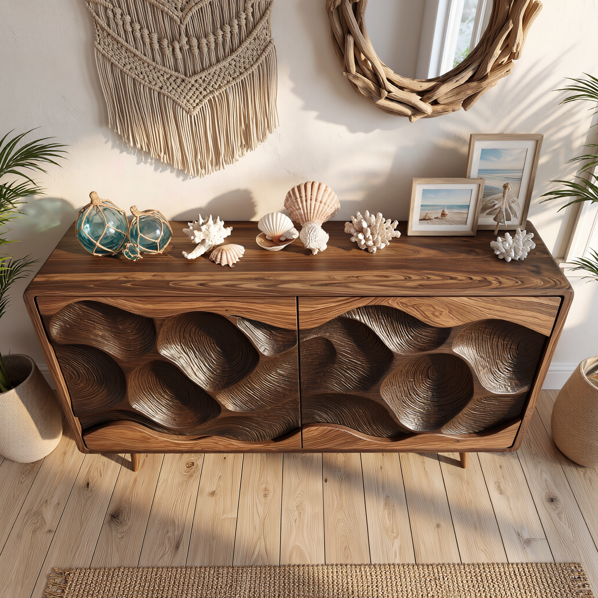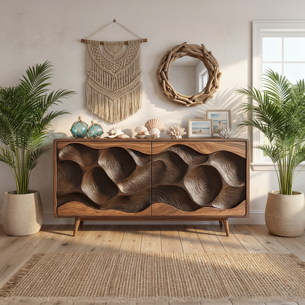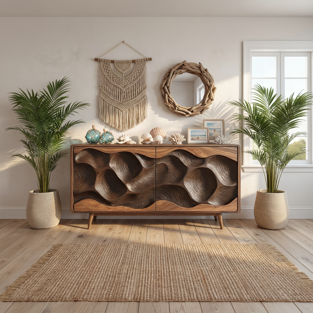 Solid Wood Sculpted Wave Credenza for Living Room and Dining Storage