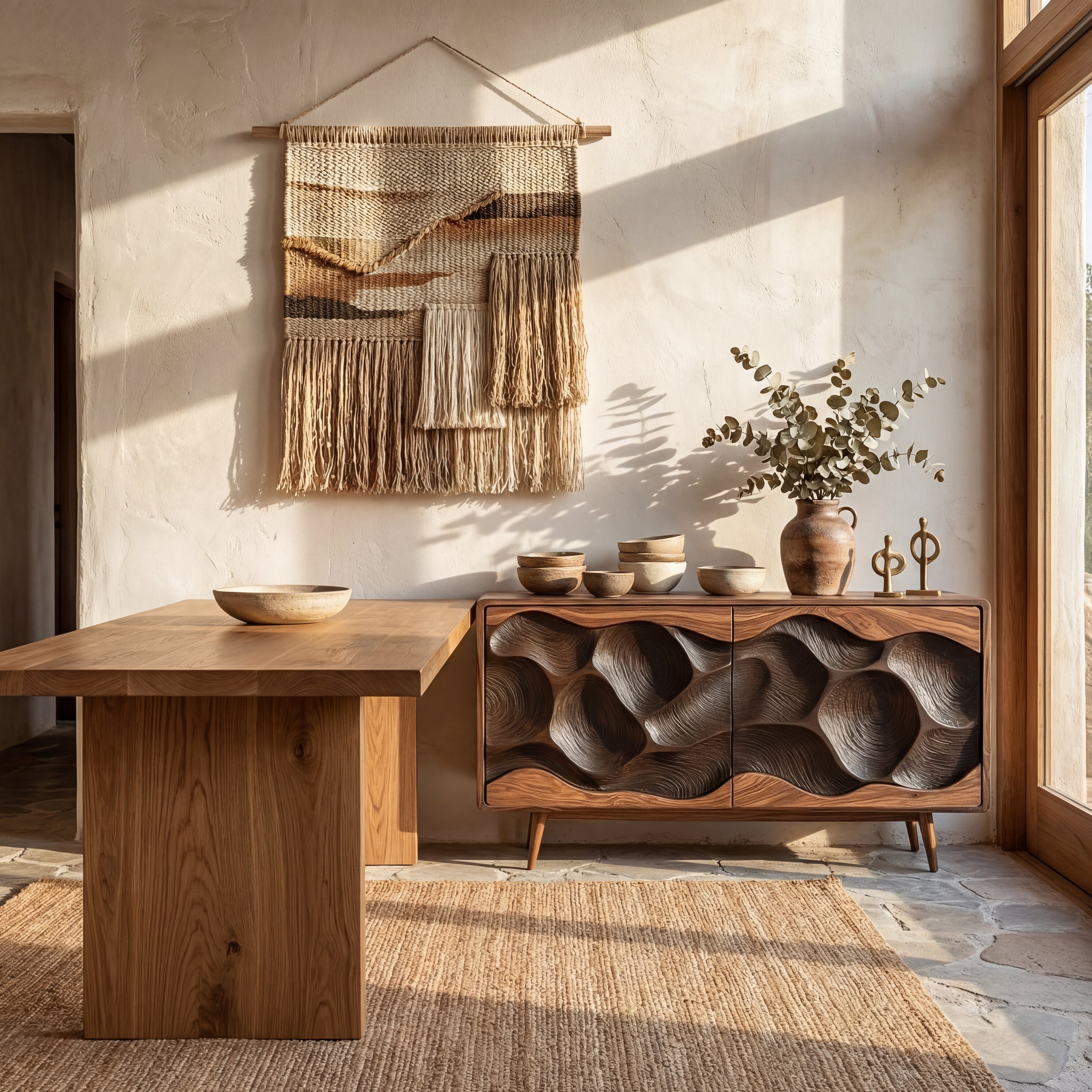 Designed for indoor use, this credenza pairs well with Modern, Japandi, Scandinavian, and Organic Contemporary interiors. Because solid wood is a natural material and each front is carved and finished individually, slight variations in grain, tone, and carving detail are normal and ensure that every cabinet is unique.