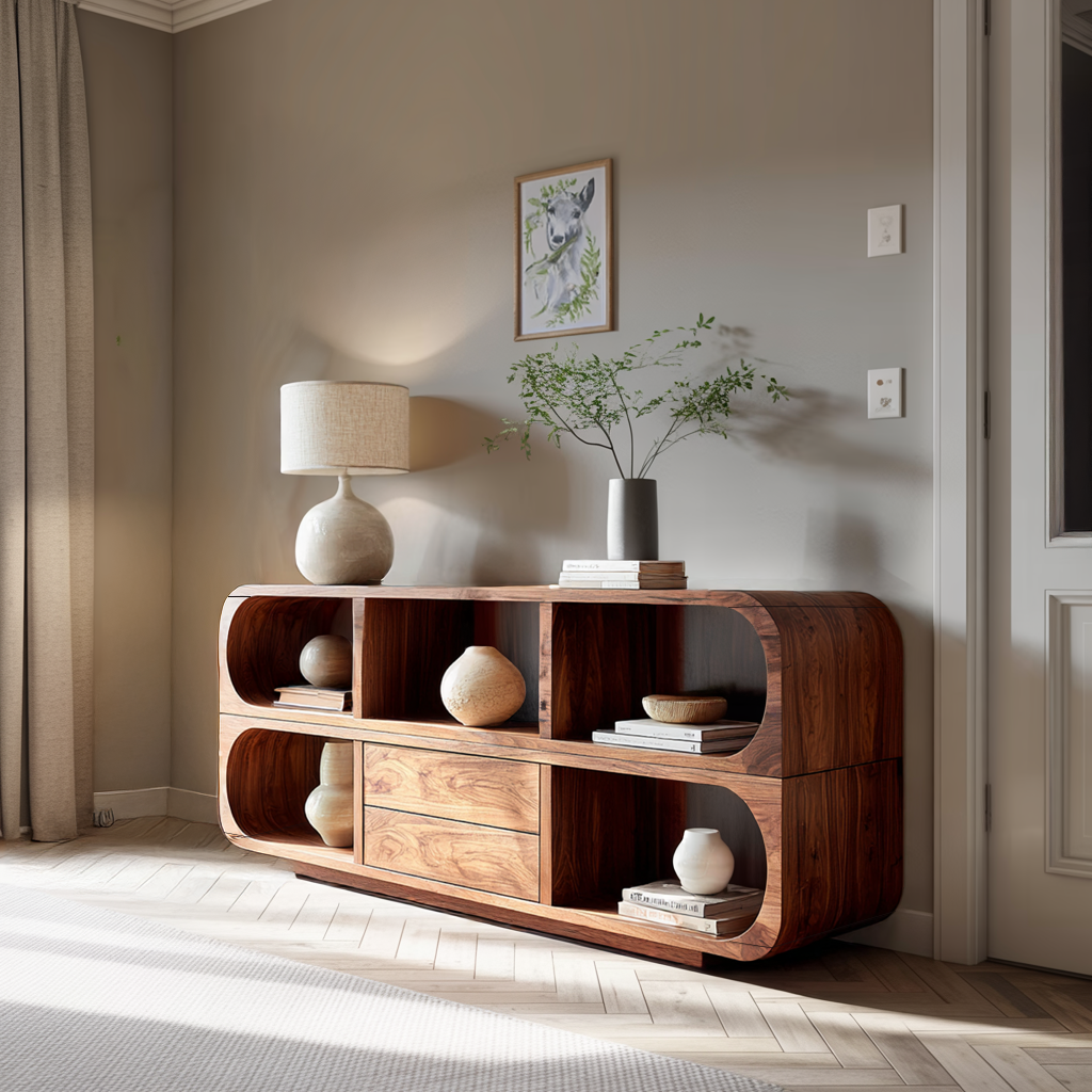 Japandi Solid Wood Sideboard with Curved Edges Modern Console Cabinet with Open Shelves and Drawer Storage for Living Room