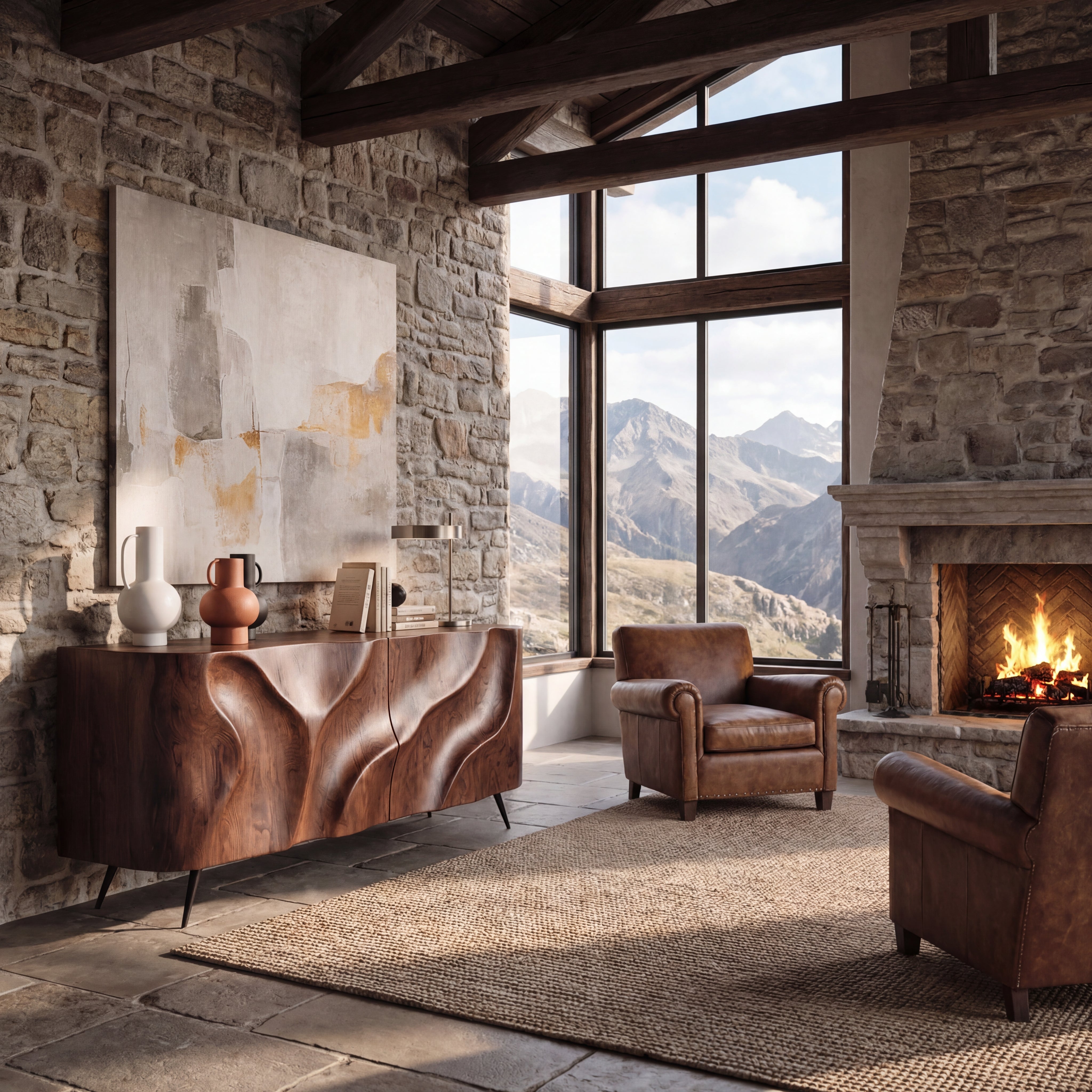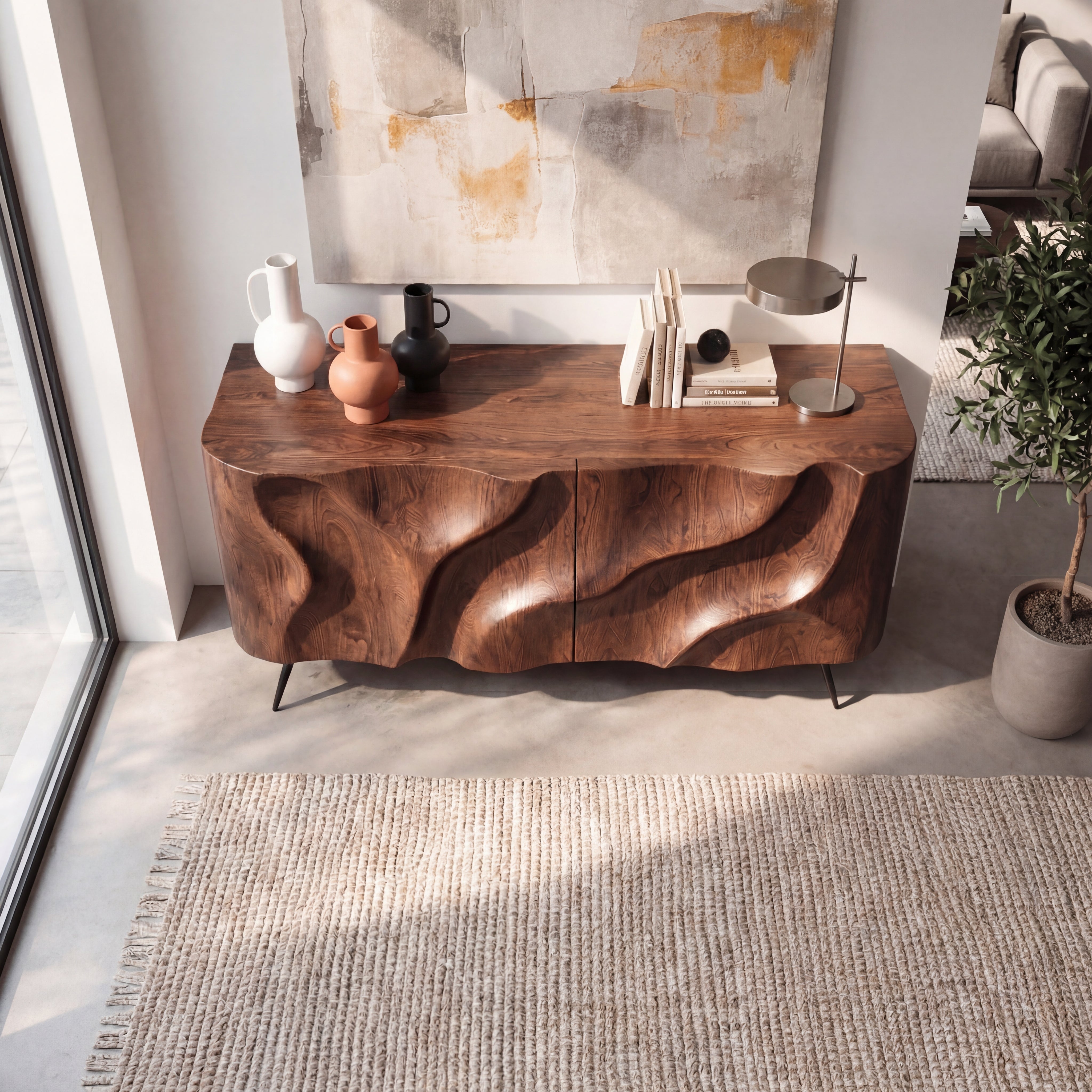This sculpted credenza turns everyday storage into a quiet focal point. The front doors are shaped with flowing, wave-like forms that catch light and shadow throughout the day, giving the piece a soft, organic presence. Slim metal legs lift the cabinet lightly off the floor, balancing the bold carved front with an overall clean, modern silhouette. It works well as a sideboard in the dining room, a media cabinet in the living room, or an elegant console along a feature wall.