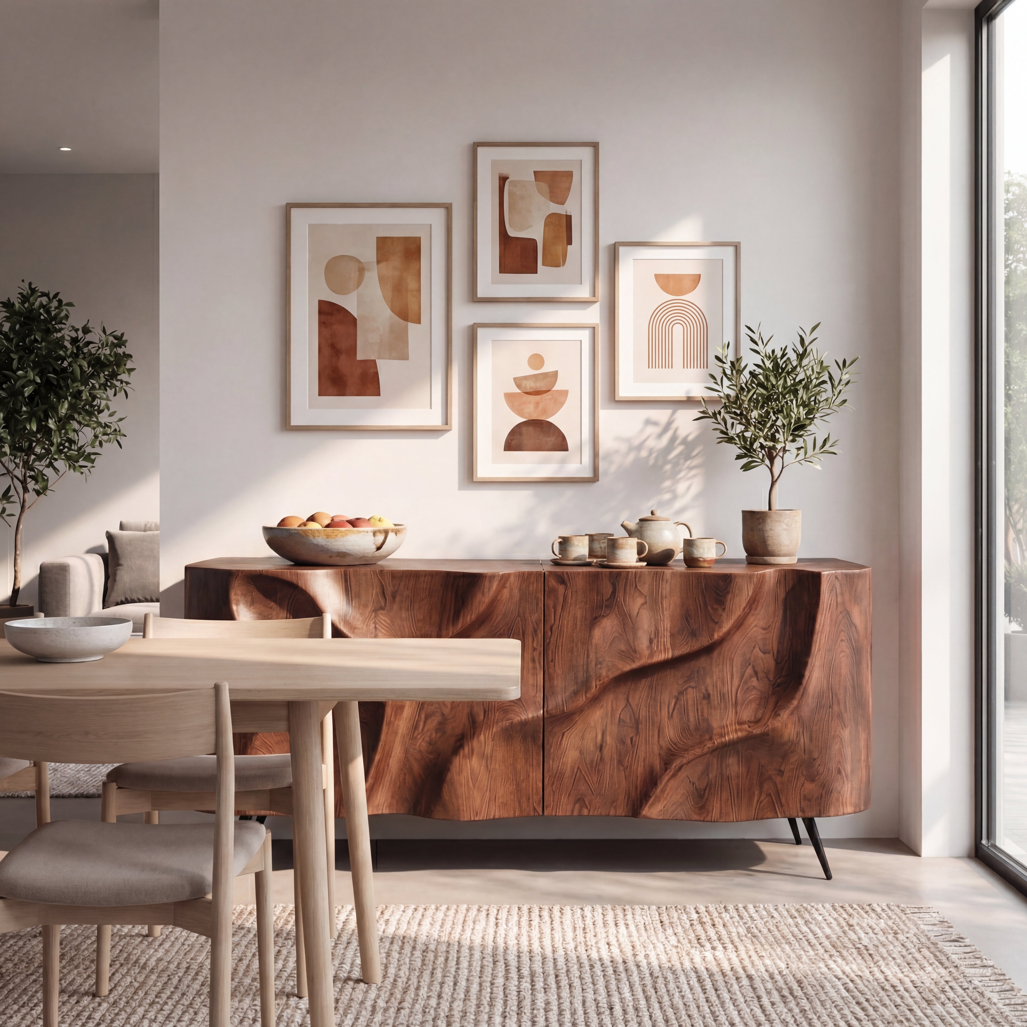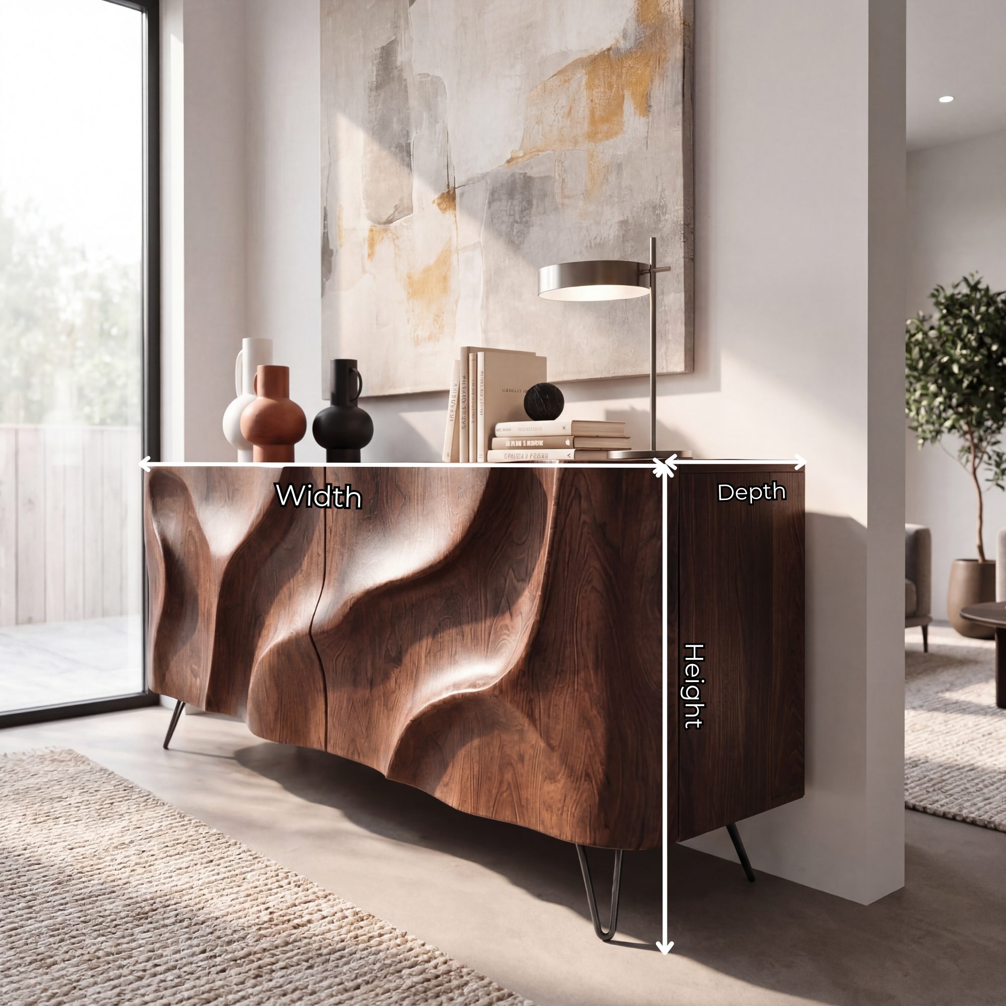Designed for indoor spaces, this credenza complements Modern, Japandi, Scandinavian, and Organic Contemporary interiors. Because solid wood is a natural material and each front is individually carved and finished, slight variations in grain pattern, color tone, and surface detail are normal and help ensure that every piece is unique.