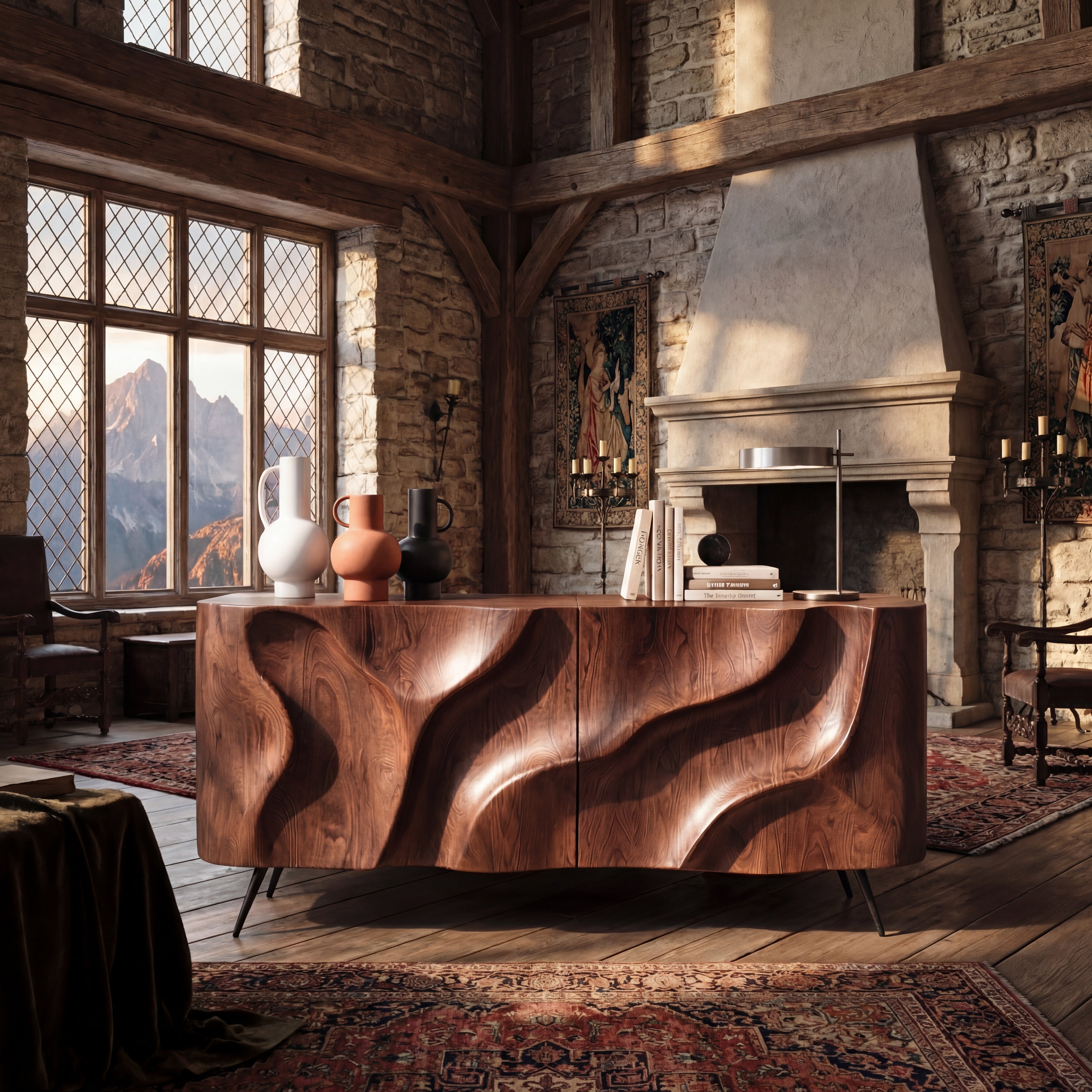 Sculpted Wavefront Solid Wood Credenza for Modern Living and Dining Rooms