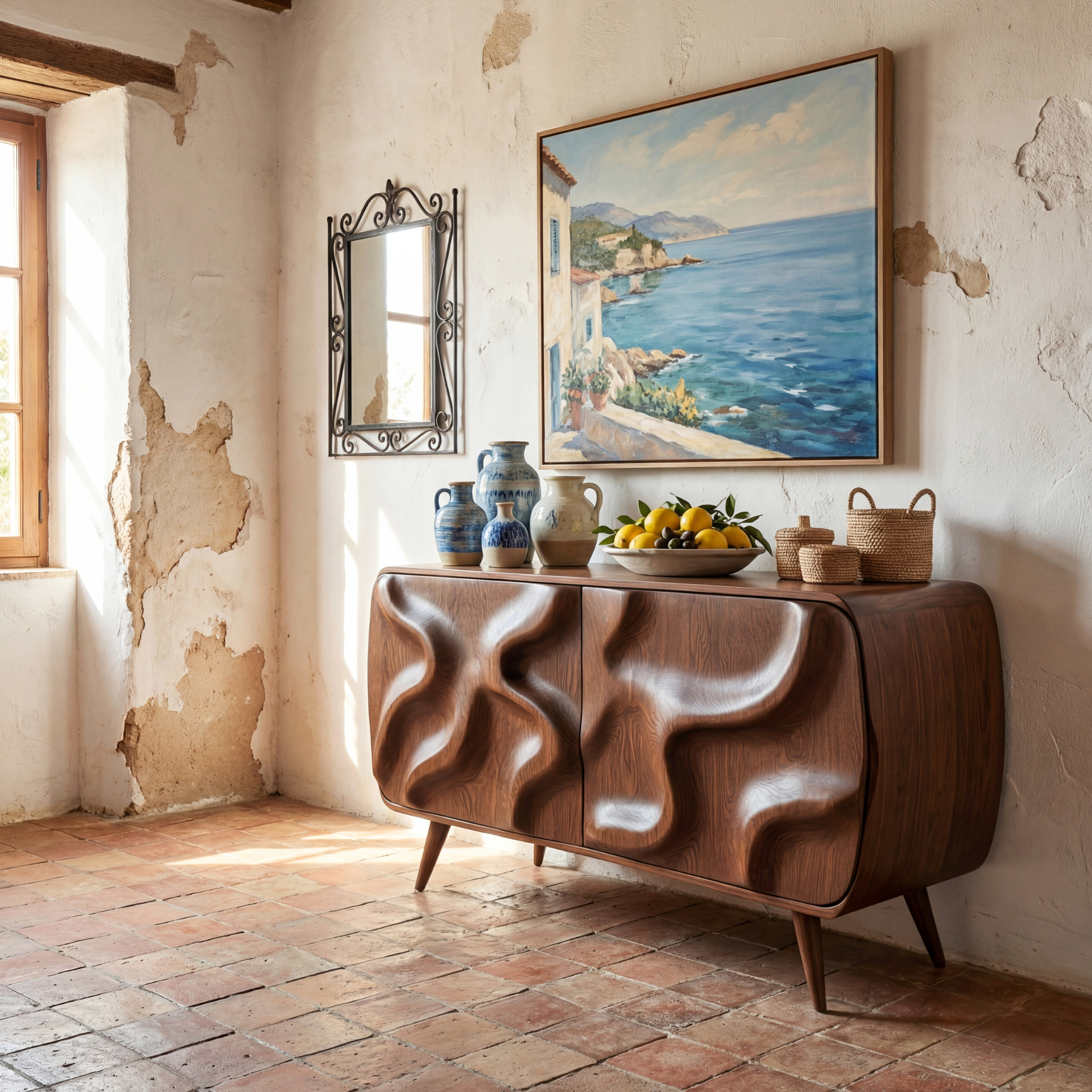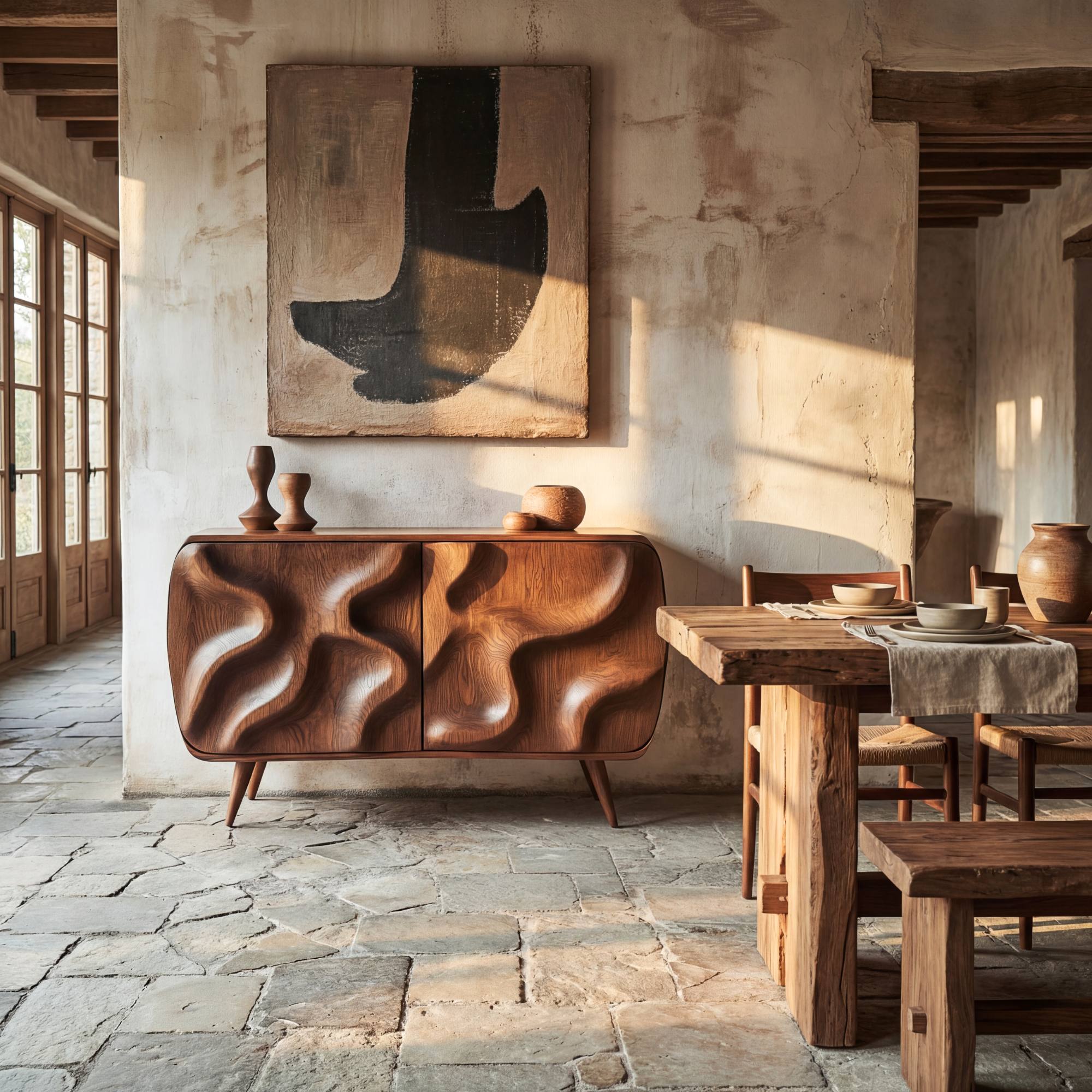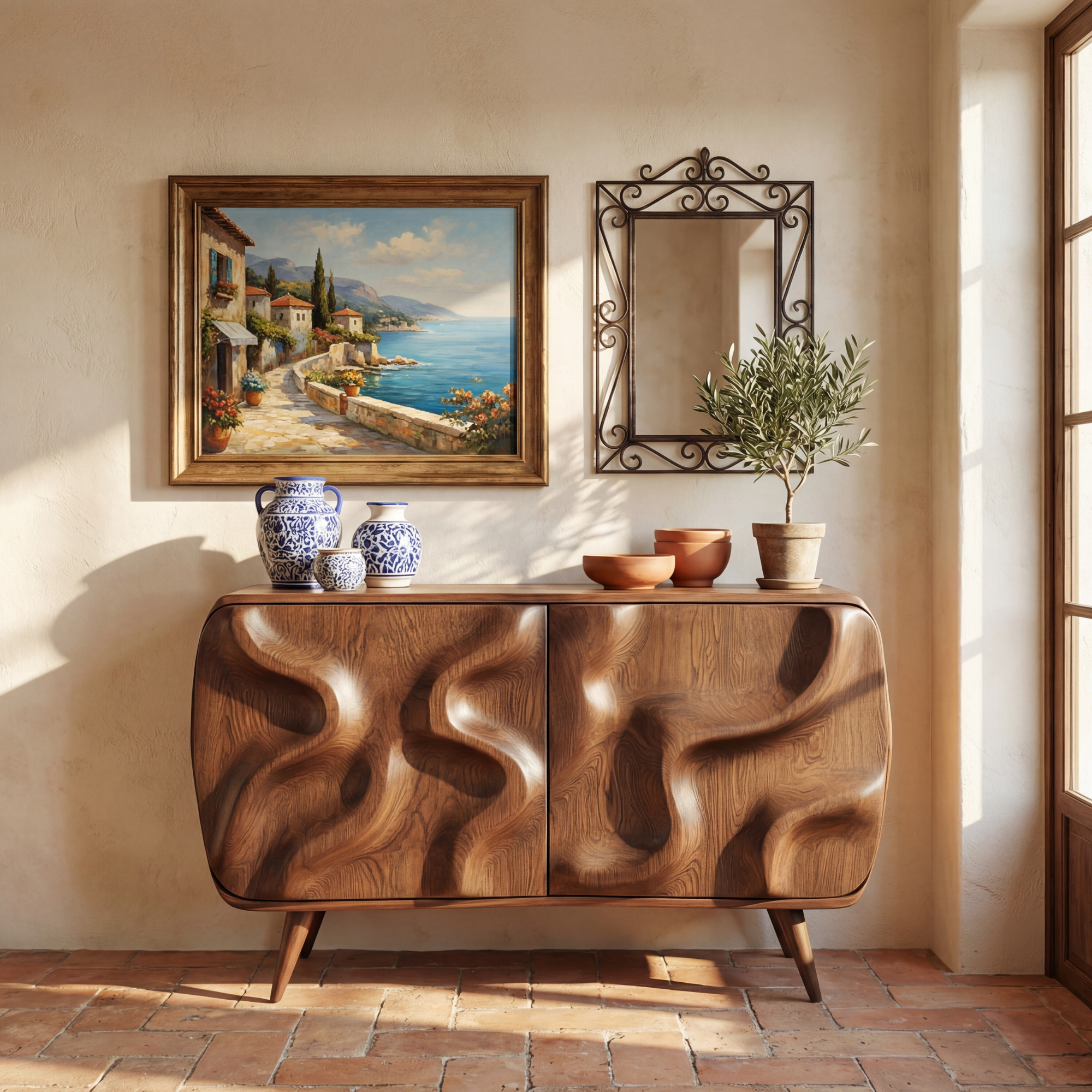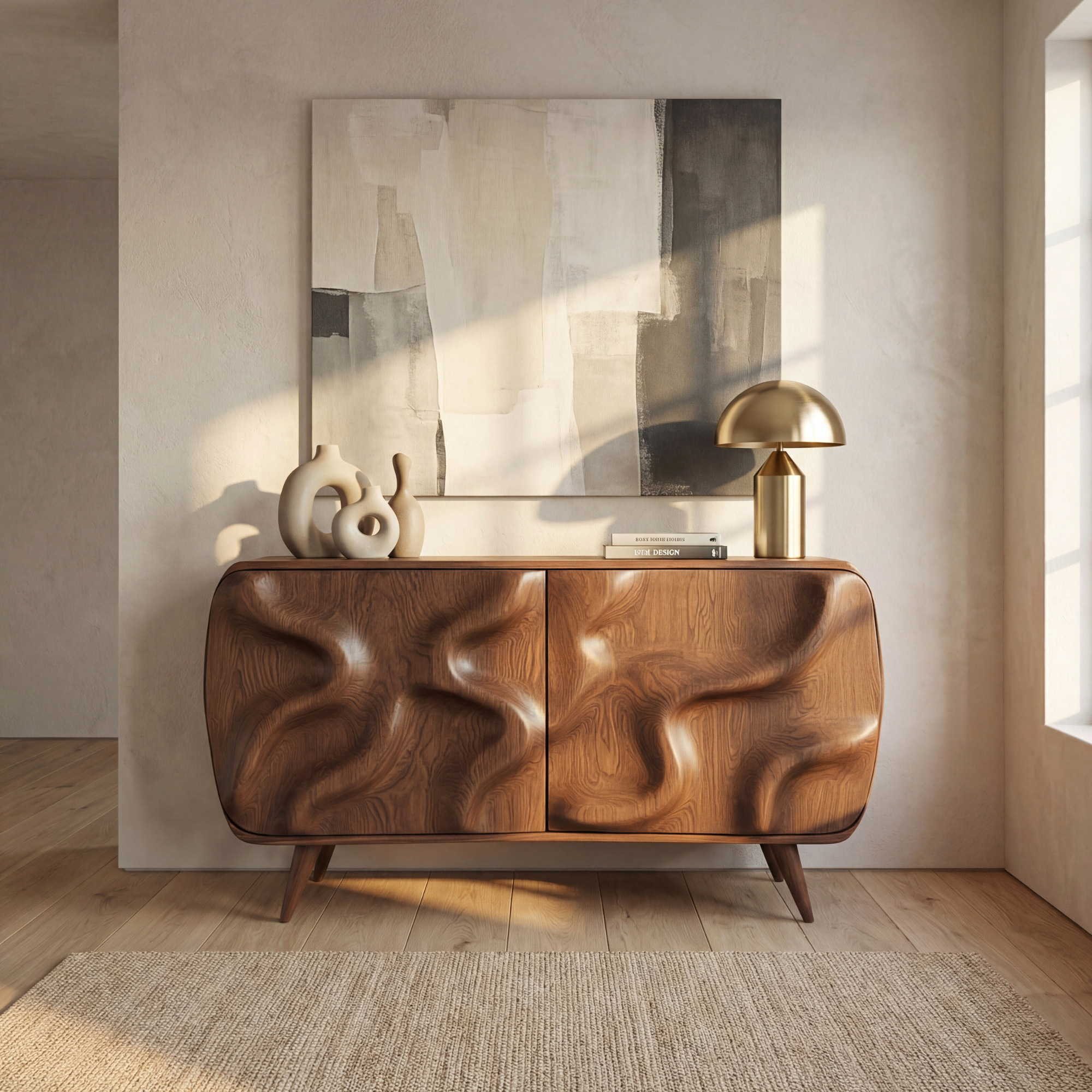 This sculptural sideboard cabinet turns everyday storage into a work of art. The doors are carved with deep, flowing wave forms that seem to move across the surface, catching light and shadow throughout the day. Softly rounded corners and tapered legs give the piece a warm, welcoming presence, making it a striking focal point for a living room, dining room, or entryway.
