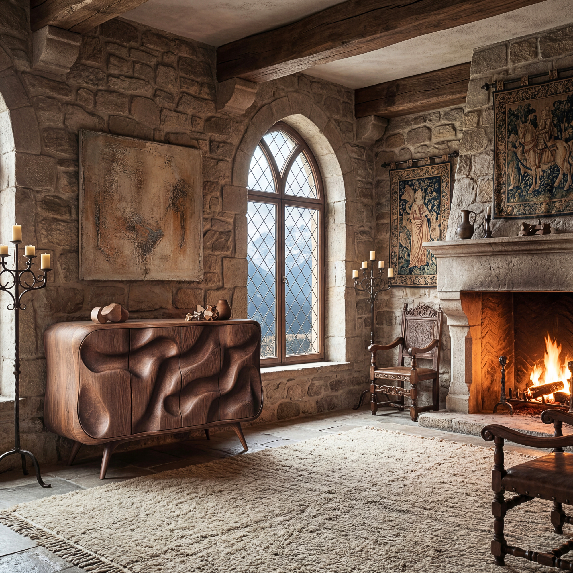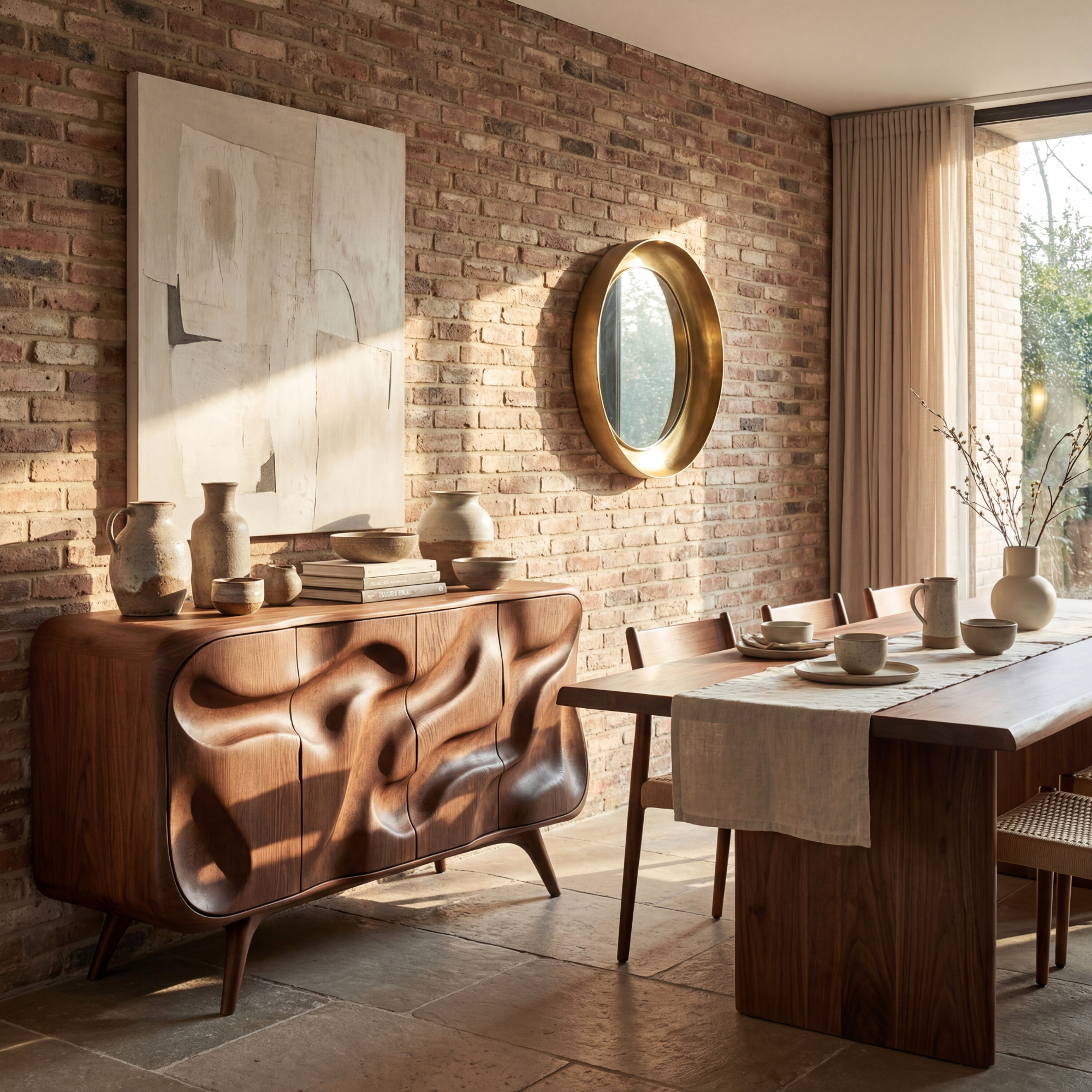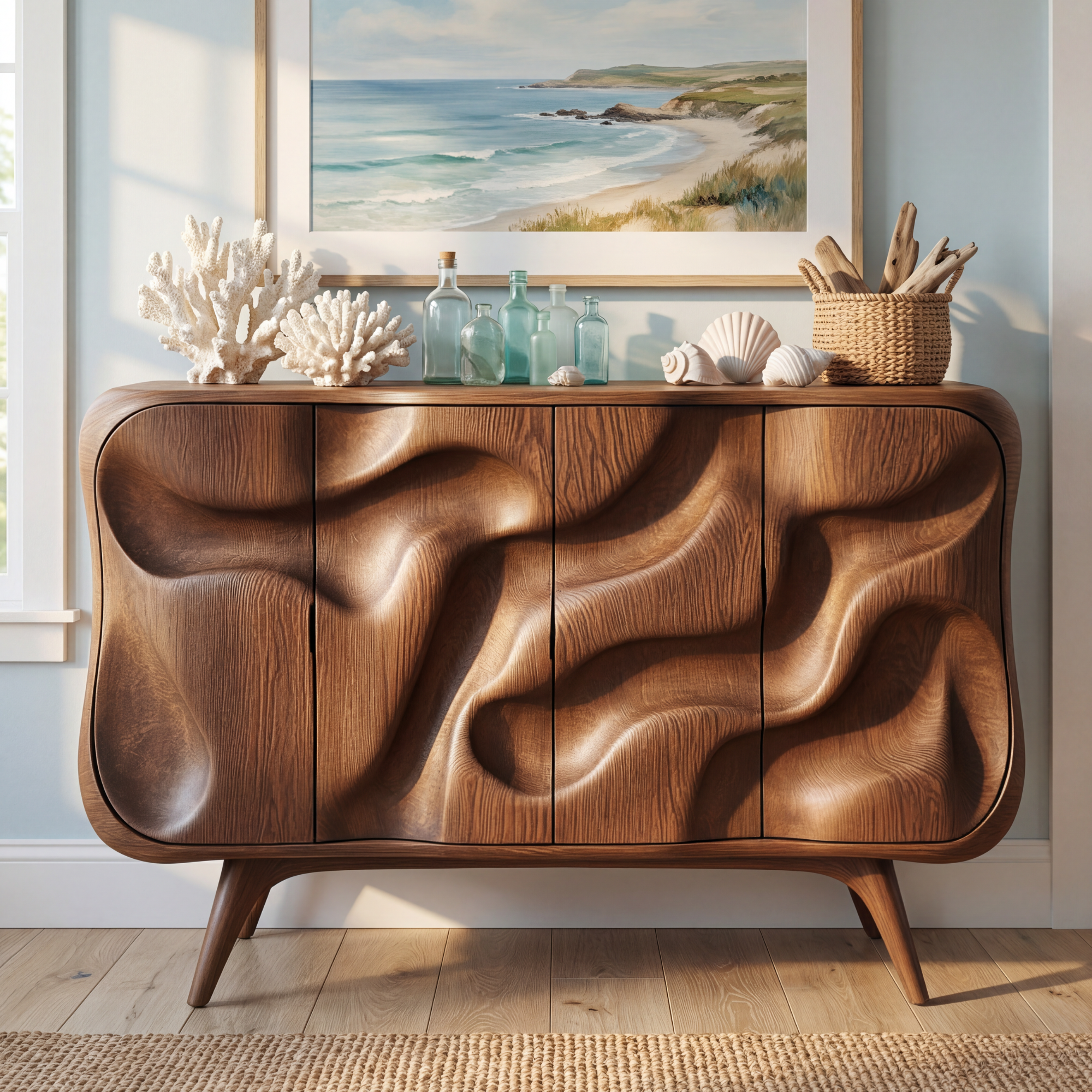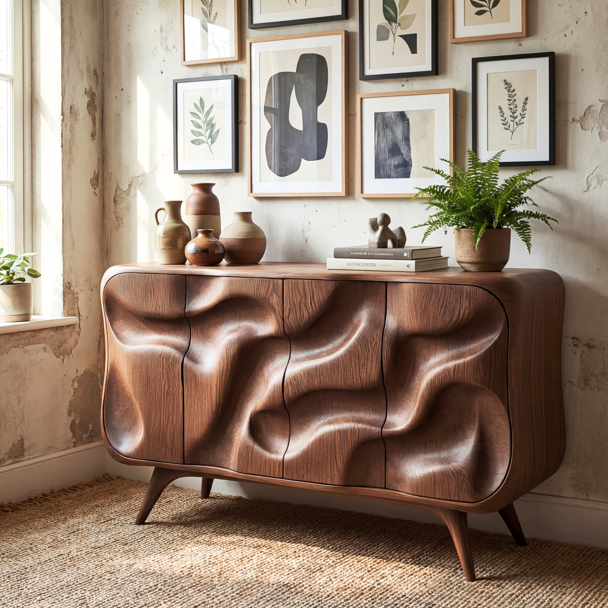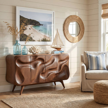 This sculptural credenza turns everyday storage into a work of art. The front doors are carved into soft, flowing waves that seem to move across the surface, while the rounded corners and slim, tapered legs keep the silhouette light and elegant. It sits comfortably in a living room, dining room, or entryway, offering both a focal point and a practical place to keep essentials neatly tucked away.