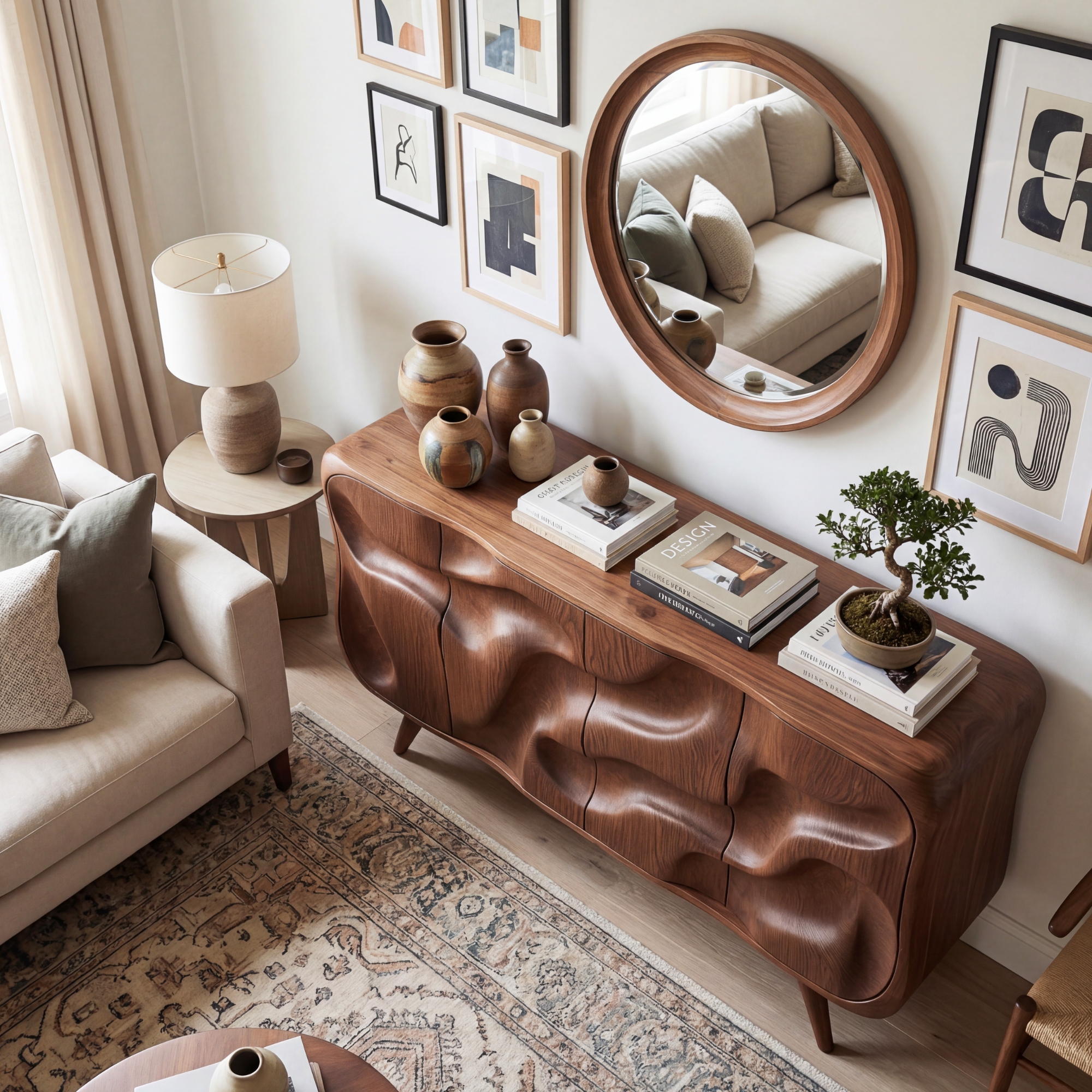 Curved Wavefront Solid Wood Credenza for Modern Living and Dining Room Storage