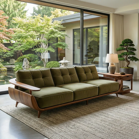 Walnut Frame Sofa with Green Cushions for Mid-Century Modern Living