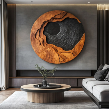 Crafted in a contemporary style, this solid wood wall art sculpture features a circular form with layered contours inspired by flowing landscapes. The organic pattern and balanced composition create a calm focal point for modern interiors.