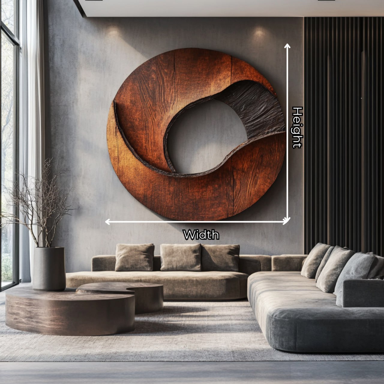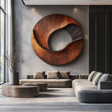 This wall art presents a circular form and carved flowing sections that add gentle depth and visual movement. The composition feels calm and balanced and fits contemporary interior spaces.