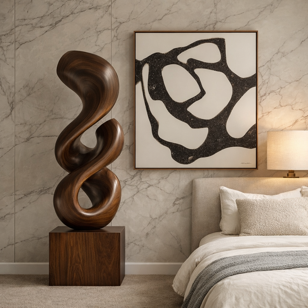 Hand-carved from natural solid wood, the sculpture showcases organic lines and a refined satin surface that preserves and reveals the grain and texture of the material. Each curve is thoughtfully shaped, making the piece feel organic yet modern, a harmonious blend of nature and artistry.