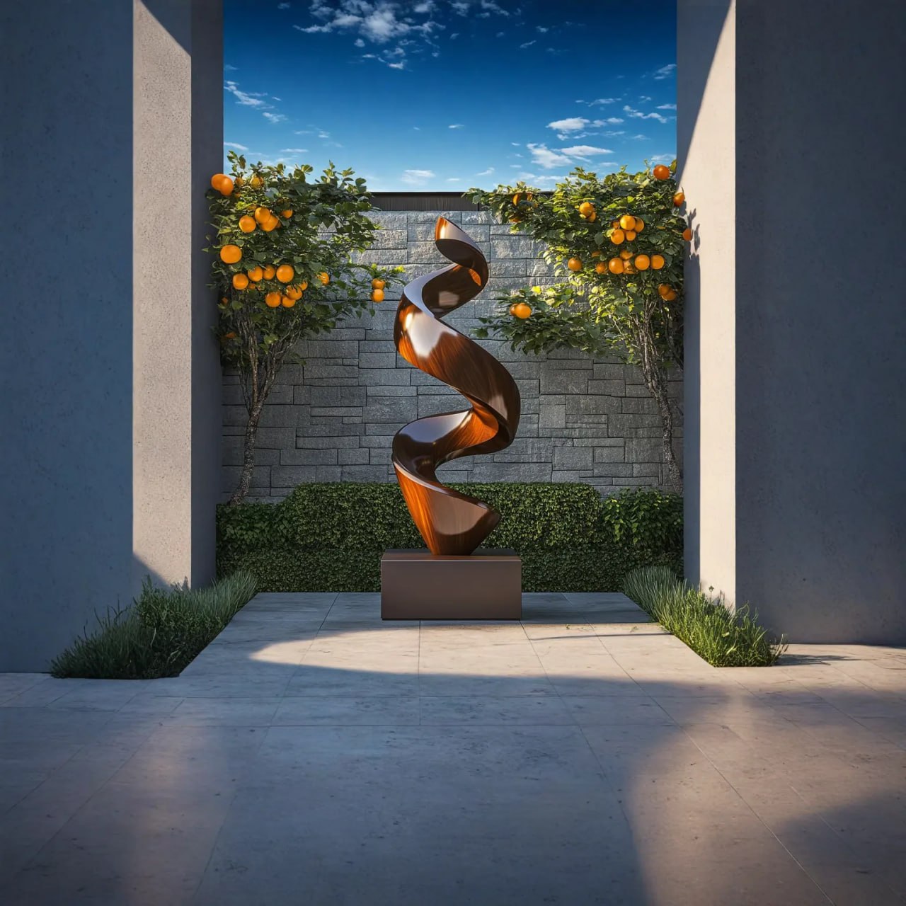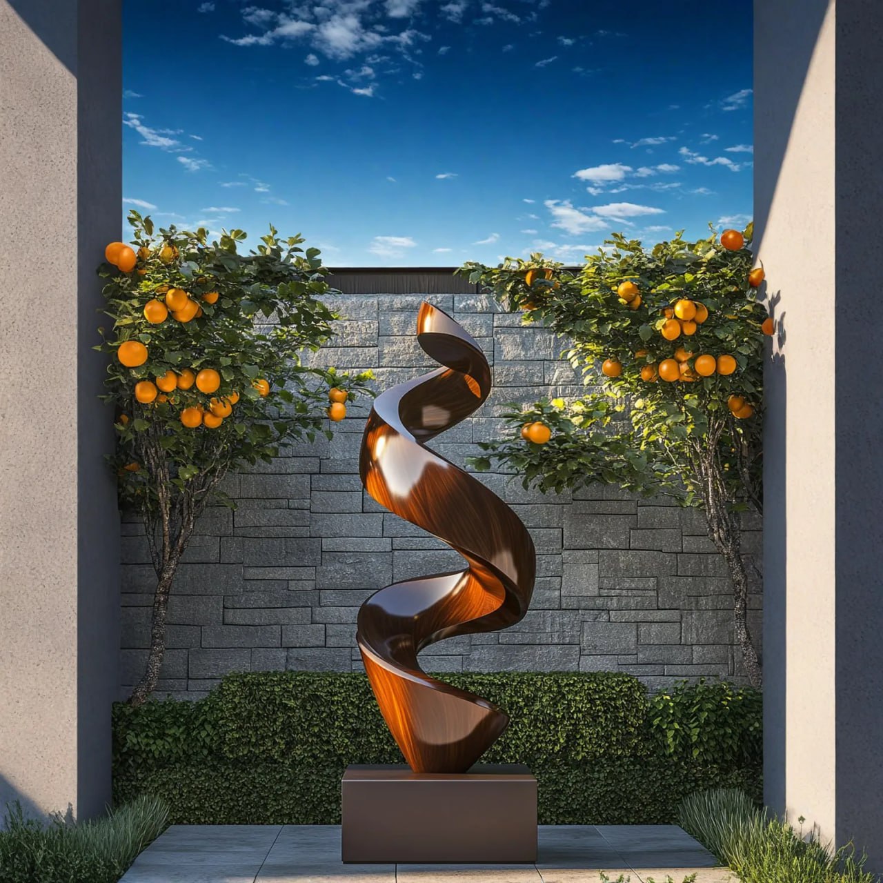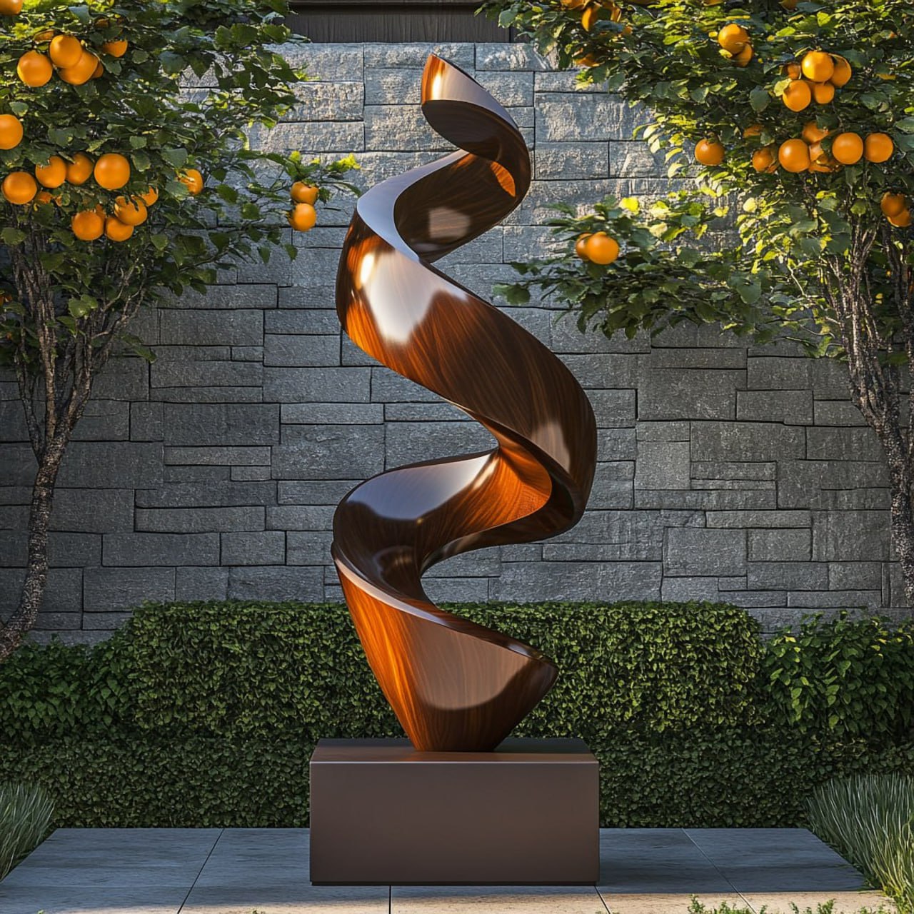 This contemporary sculpture is crafted from solid wood and shaped into a graceful upward spiral, creating a visual expression of balance, motion, and quiet energy. Its smooth, continuous curves draw the eye upward, bringing a sense of elevation and elegance to outdoor settings.