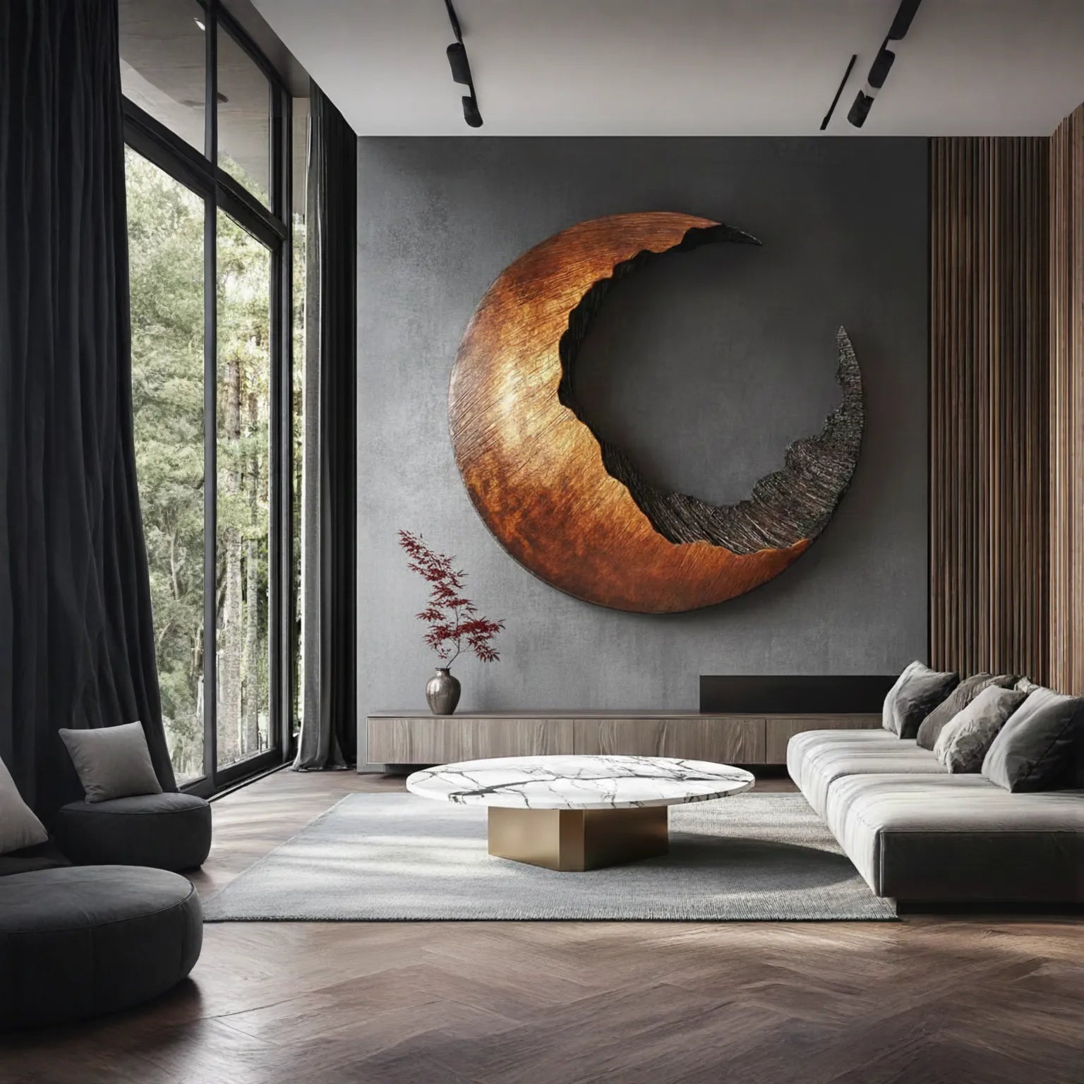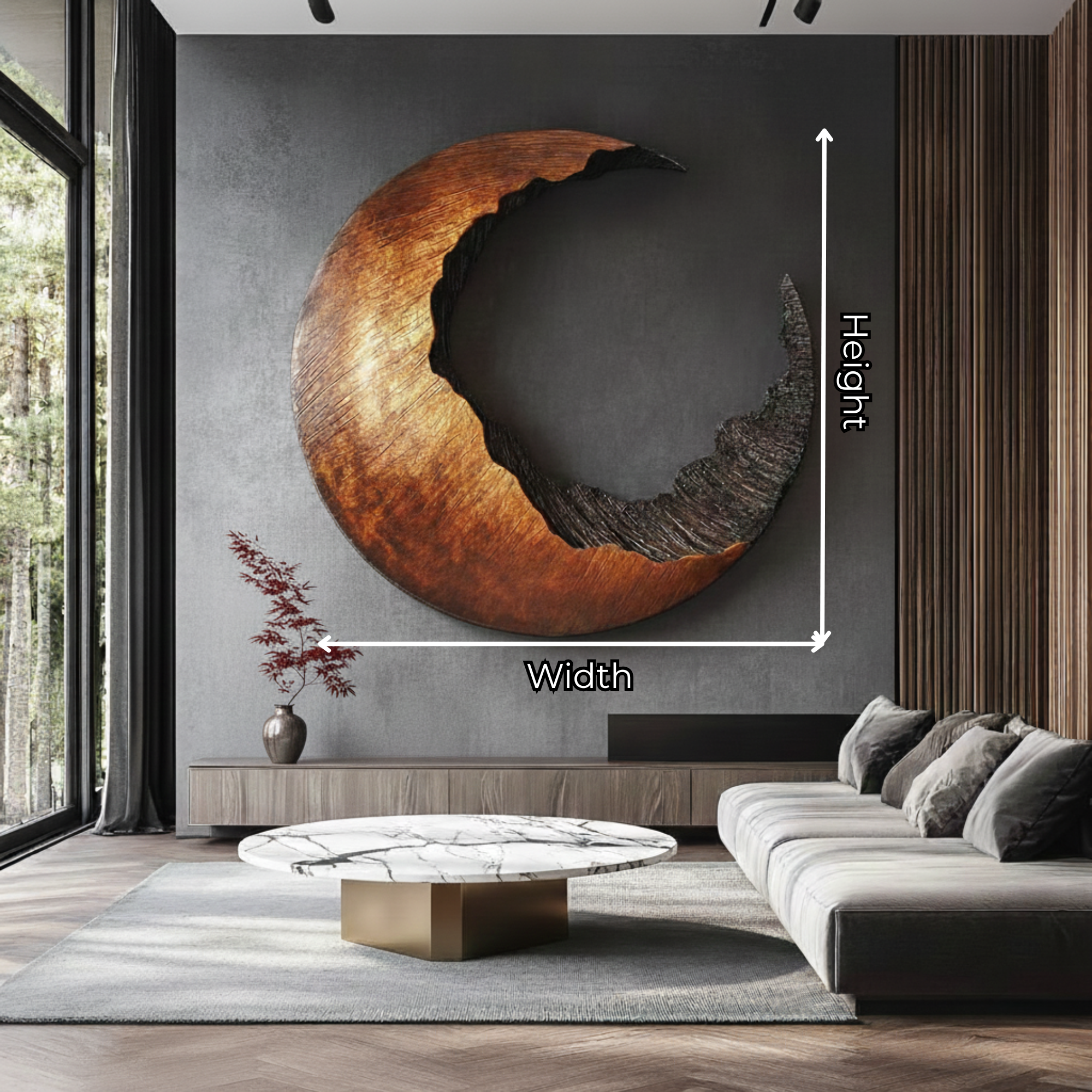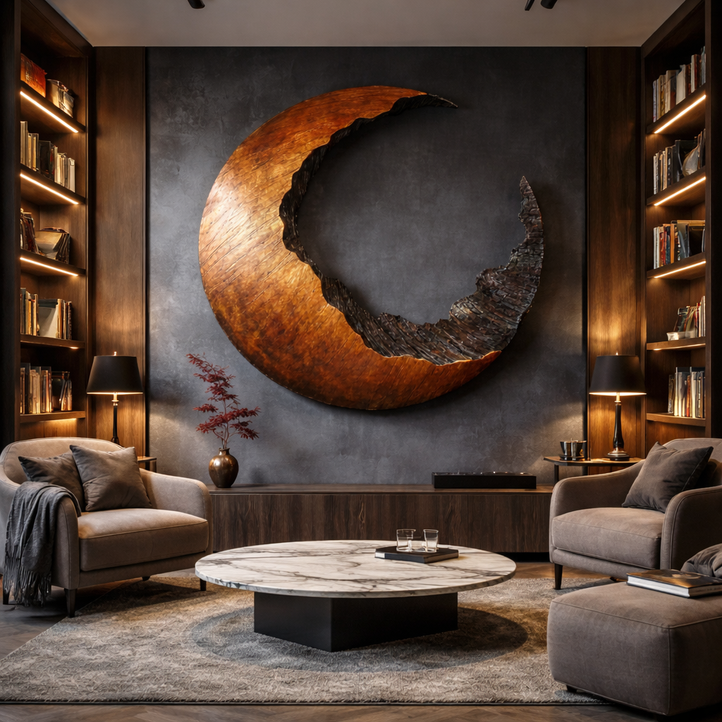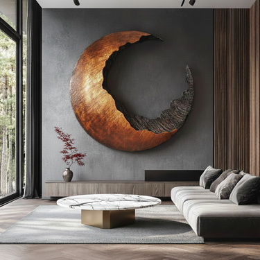 Add a sense of balance and quiet drama to your interior with this abstract crescent shaped solid wood wall sculpture. Inspired by the natural rhythm of the moon, the curved form combines a smooth outer surface with a deeply carved inner texture, creating a striking contrast between refined finish and raw organic detail. The open negative space gives the piece a light, floating presence while remaining visually bold on the wall.