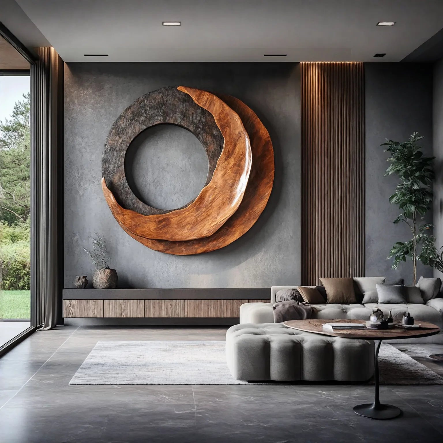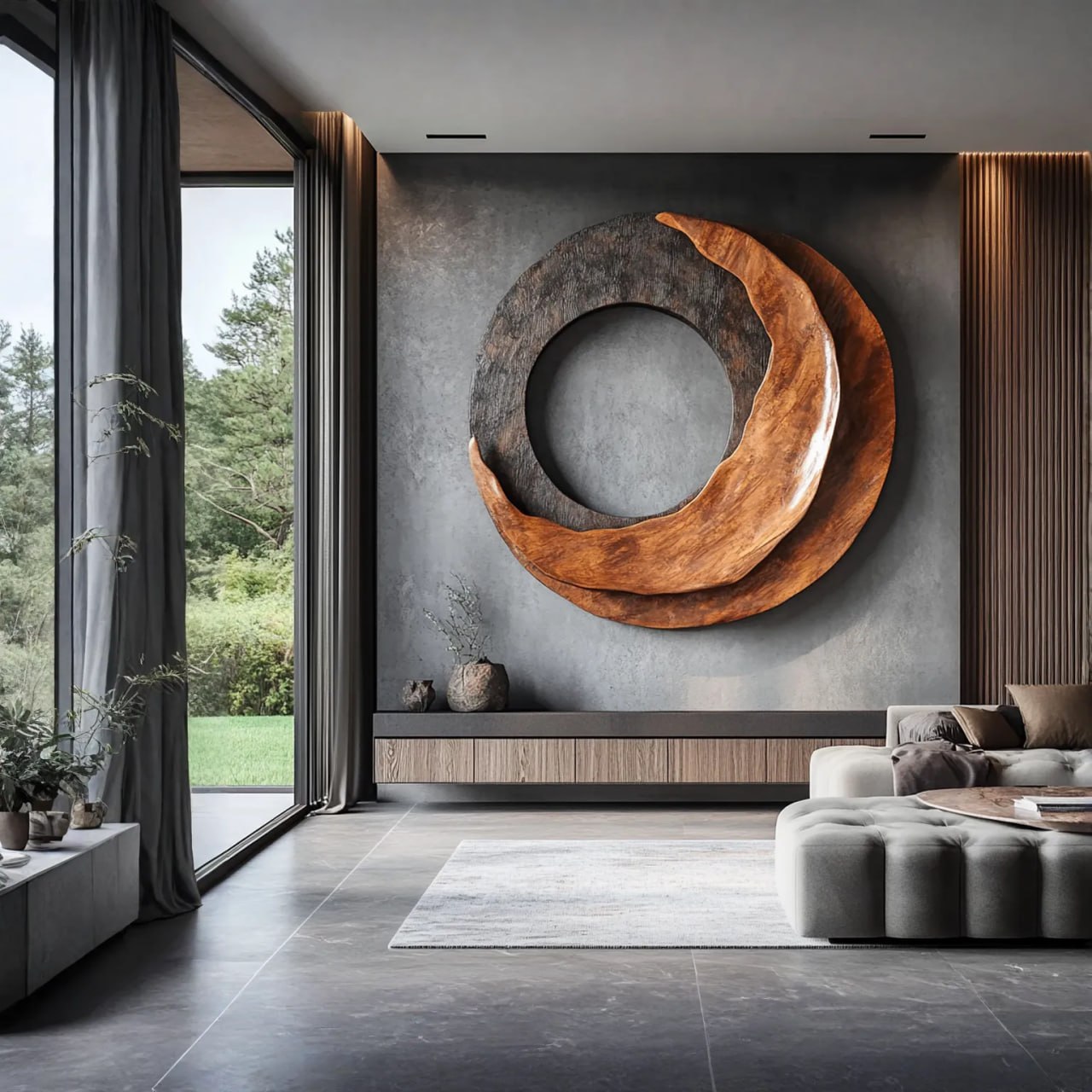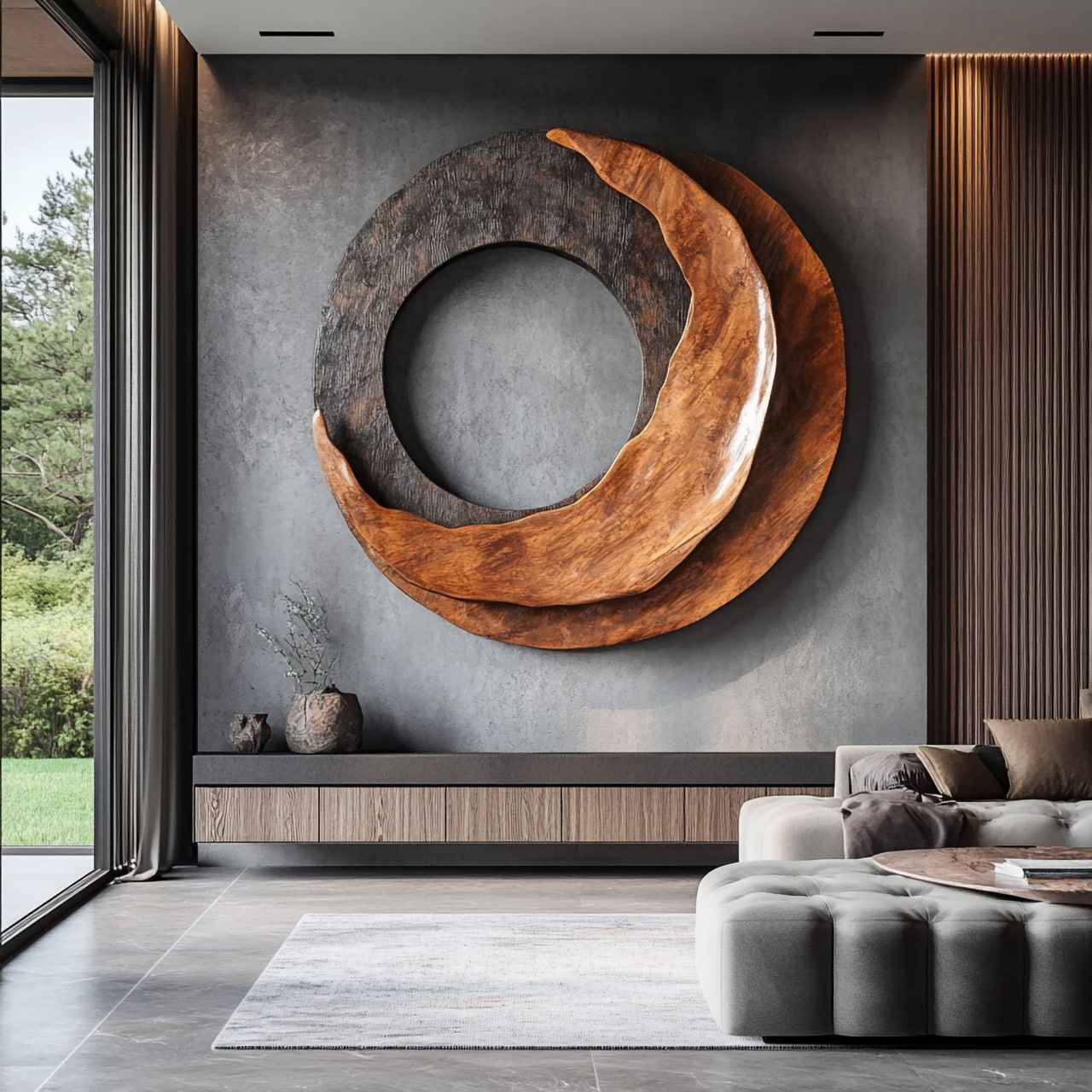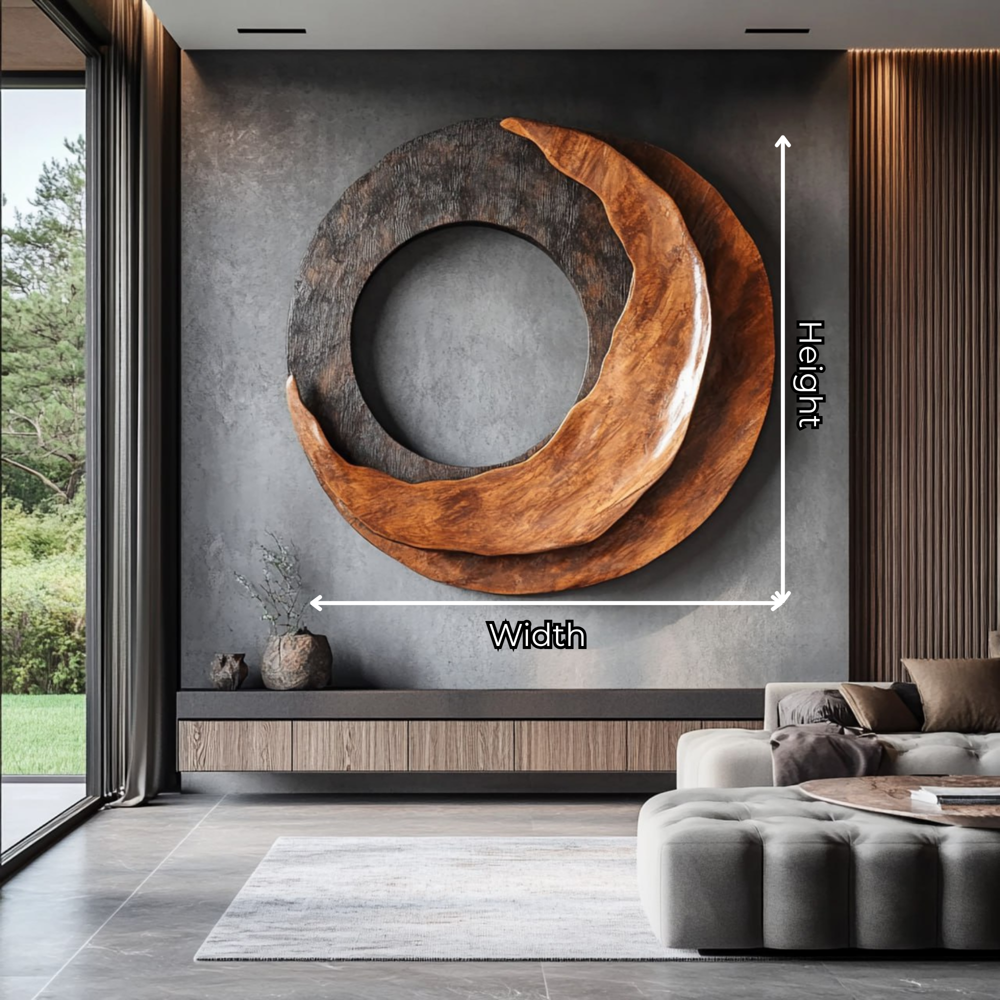 This abstract wall sculpture is crafted from solid wood, shaped into a layered circular form that creates depth, movement, and a calm architectural presence. The sculpted contours draw the eye inward, while the open center introduces negative space that subtly shifts with viewing distance and changing light.