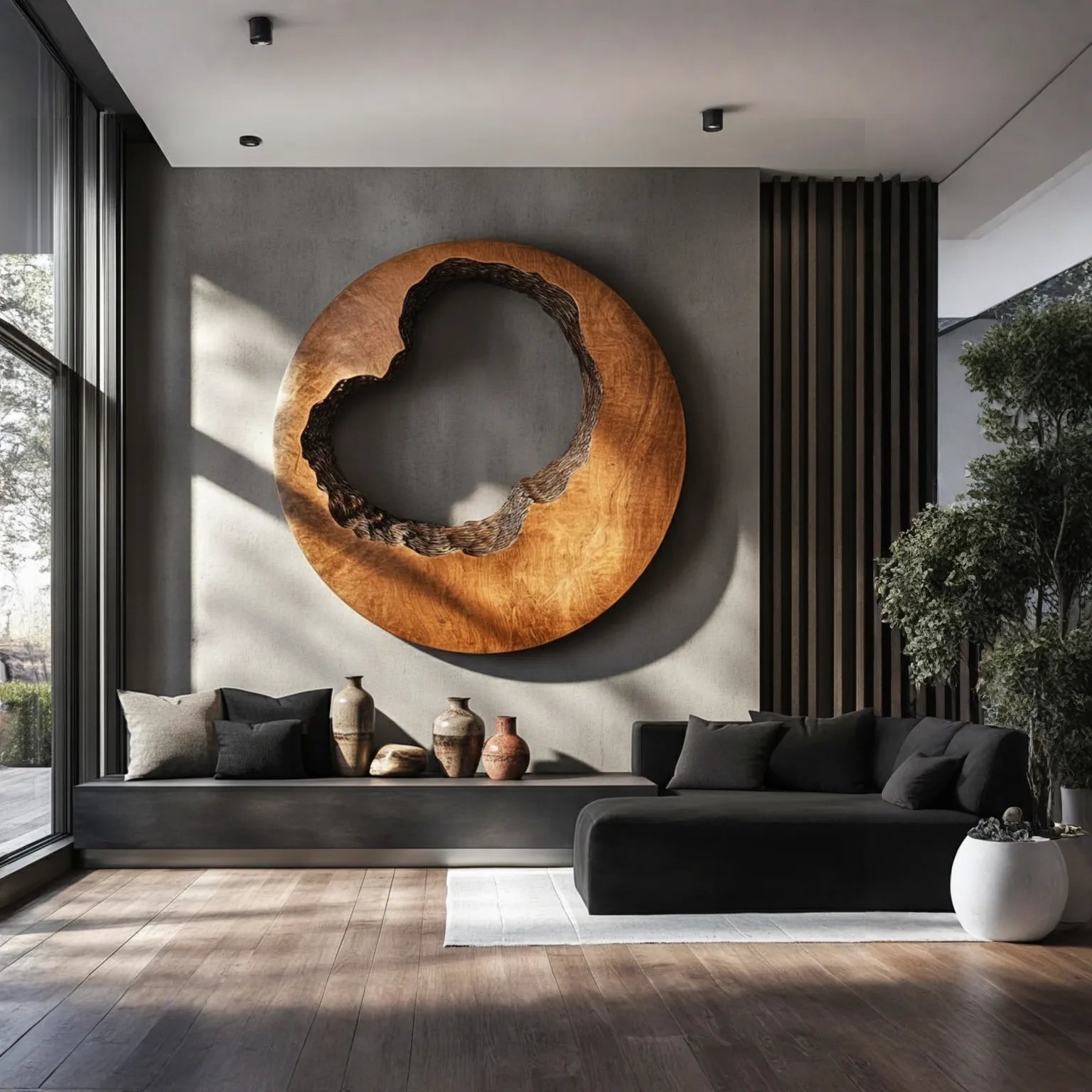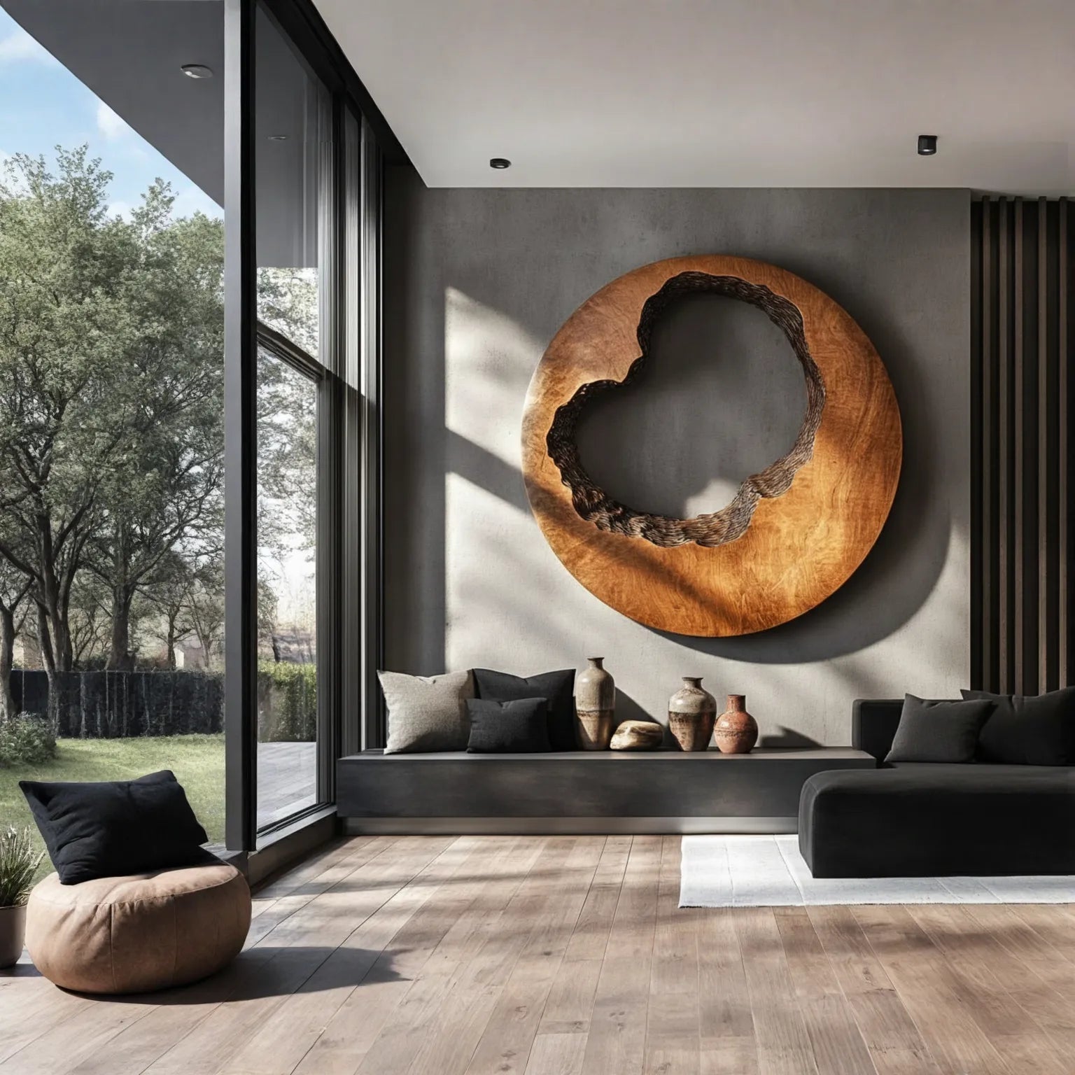 Each artwork is carved by hand from solid wood, allowing the natural grain to guide the flowing interior texture. The smooth outer ring contrasts with the more deeply carved inner edge, where layered details catch light and shadow throughout the day. As lighting changes, the sculpture reveals subtle variations in depth and character from different viewing angles without overpowering the room.