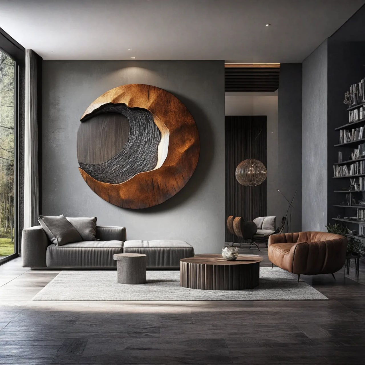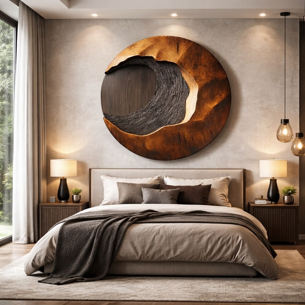 Designed with an abstract, sculptural sensibility, this circular wall piece features layered carving that suggests natural formations found in wood and stone. The contrast between smooth surfaces and textured depth creates a refined focal point that feels calm and intentional in modern interiors.