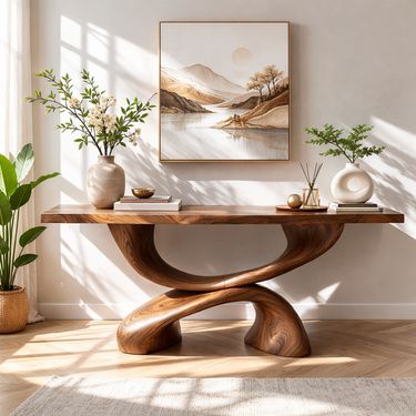 Double Curve Sculptural Solid Wood Console Table with Intertwined Organic Base