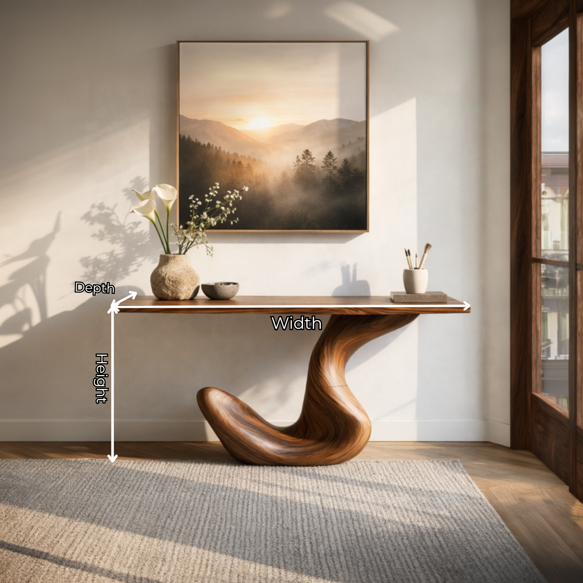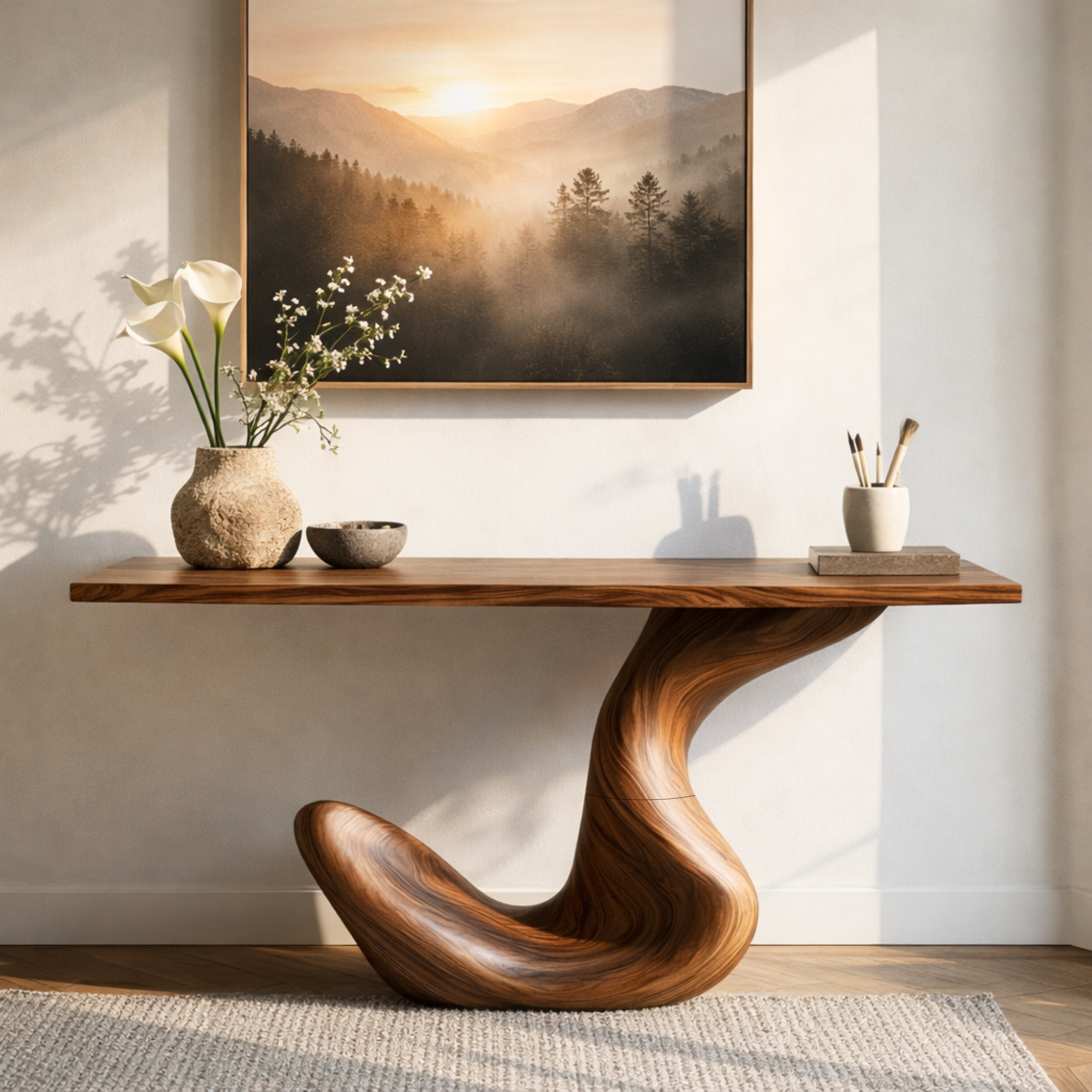 This console table features a hook curve sculptural base with a monolithic looping form that rises into a long, clean rectangular top. The bold organic silhouette creates a strong sense of movement and visual contrast, bringing an artistic yet balanced presence to smooth walls and minimalist interior architecture.