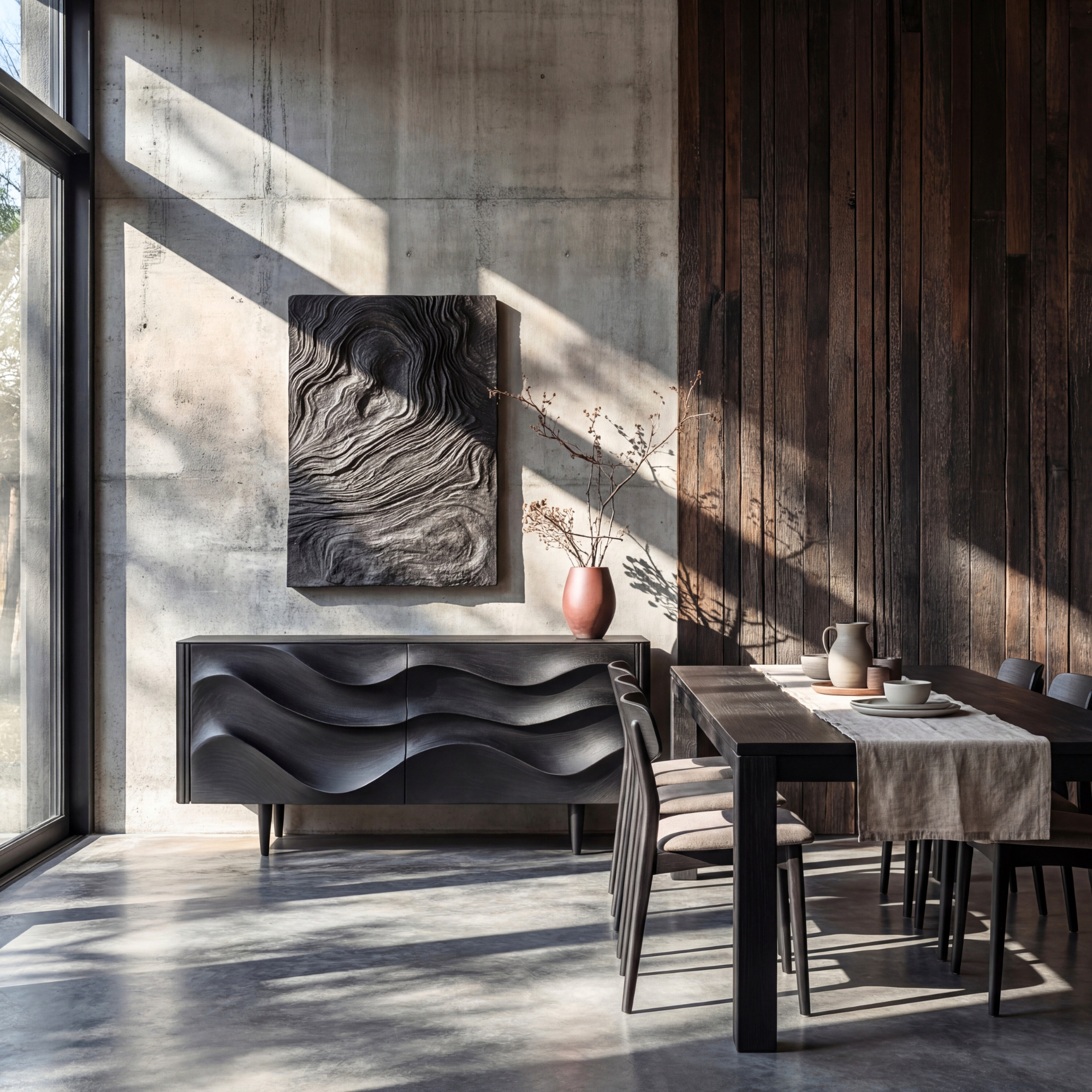 This sculptural sideboard turns everyday storage into a dramatic focal point. The front doors are carved into flowing wave-like forms that catch the light and create a sense of movement across the cabinet. Finished in deep black with a soft sheen, the piece feels both minimalist and expressive, making it ideal for anchoring a living room, dining room, or entryway against concrete, stone, or wood walls. Slim tapered legs lift the cabinet lightly off the floor, keeping the silhouette elegant and contemporary.