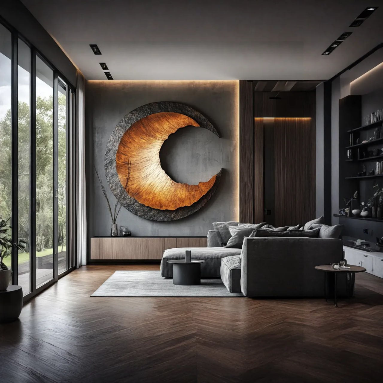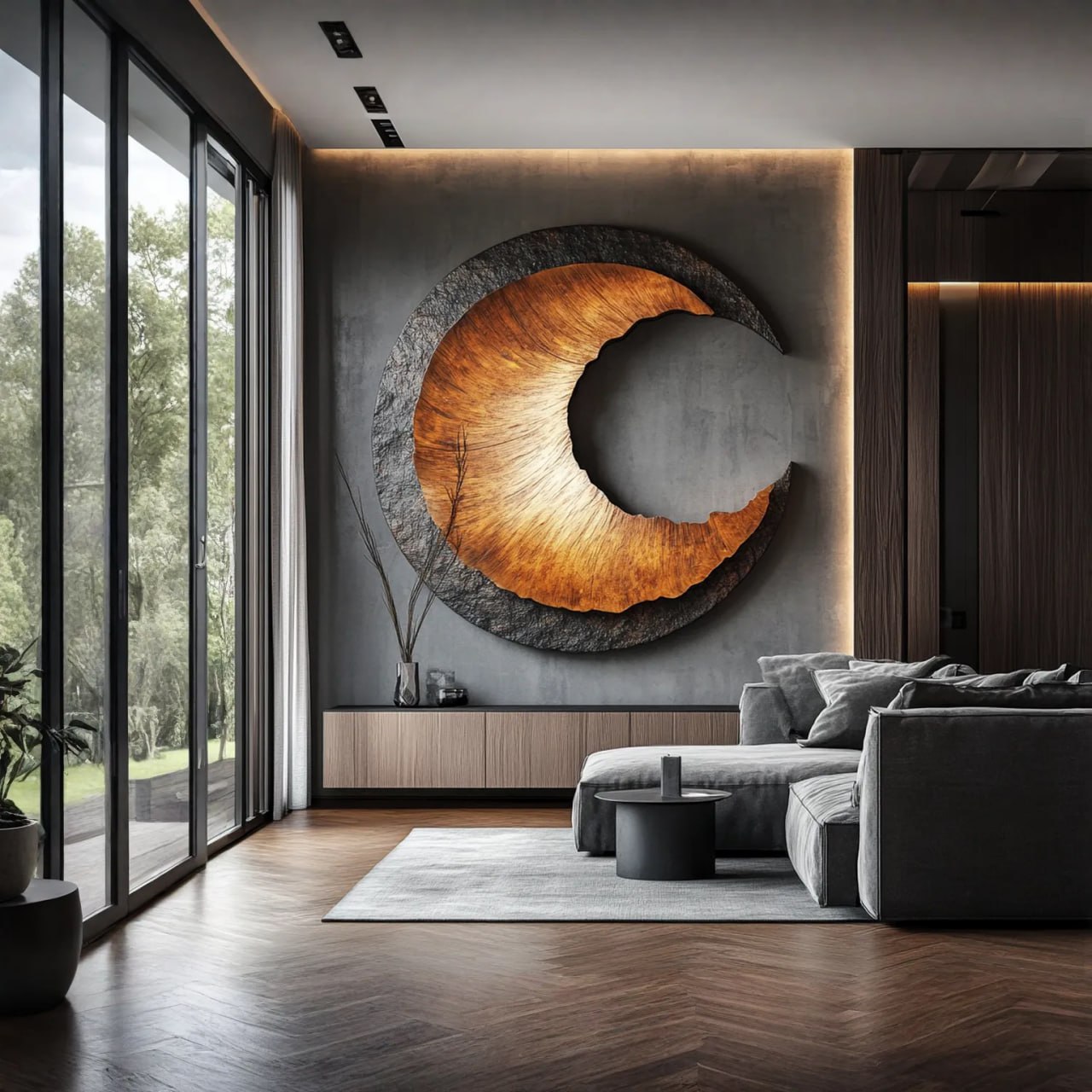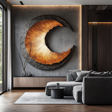 This wall piece adds a contemporary sculptural presence to interior spaces. The circular form and flowing carved contour soften flat wall surfaces and introduce quiet movement. Layered texture interacts with both natural and ambient light, creating depth without overpowering the room.