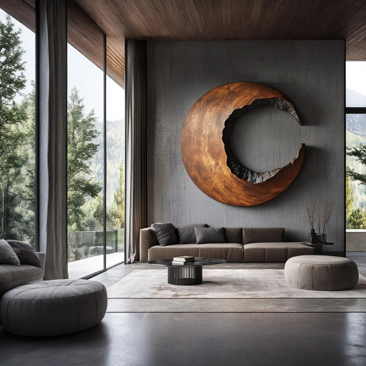 This wall art features a curved circular form and a recessed inner opening that adds depth and visual flow. The composition creates a balanced rhythm on the wall and suits contemporary spaces without feeling heavy.