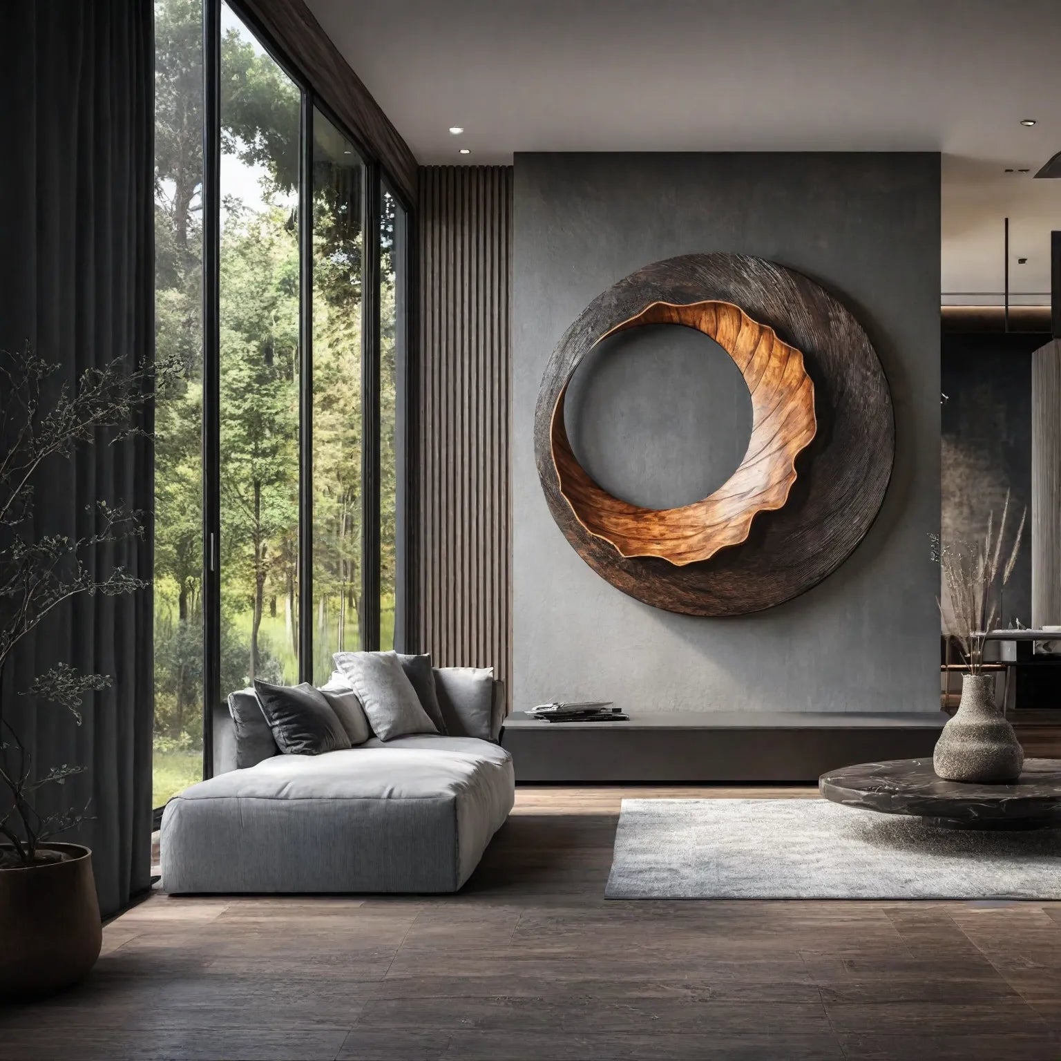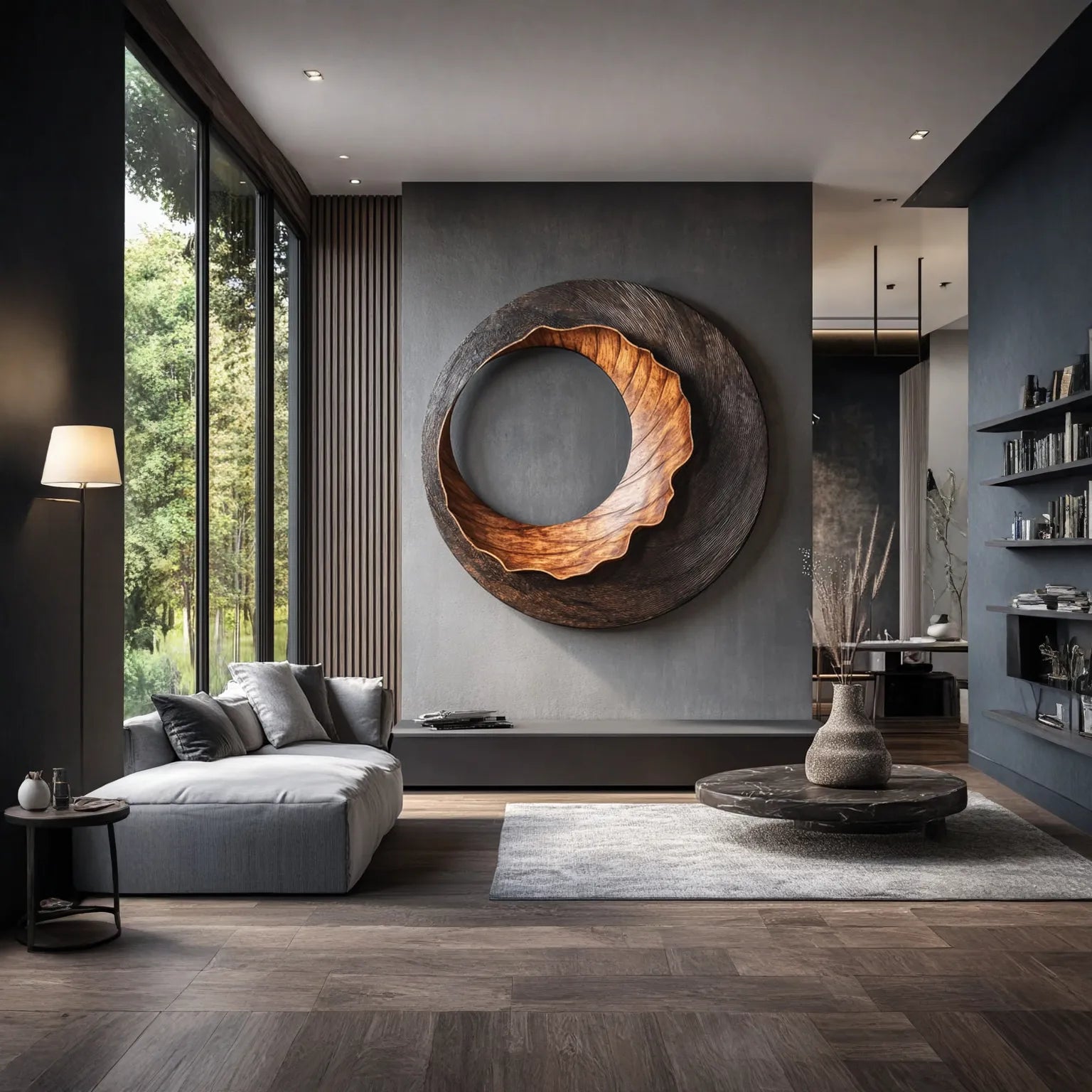 Crafted from solid wood, the artwork highlights natural grain variation across both the inner and outer sections. The carved surfaces are finished to a smooth touch while retaining visible texture, allowing natural and ambient light to produce soft highlights and shadows throughout the day. From different viewing angles, the relationship between the warm central ring and the darker background reveals quiet dimensional changes rather than a flat decorative panel.