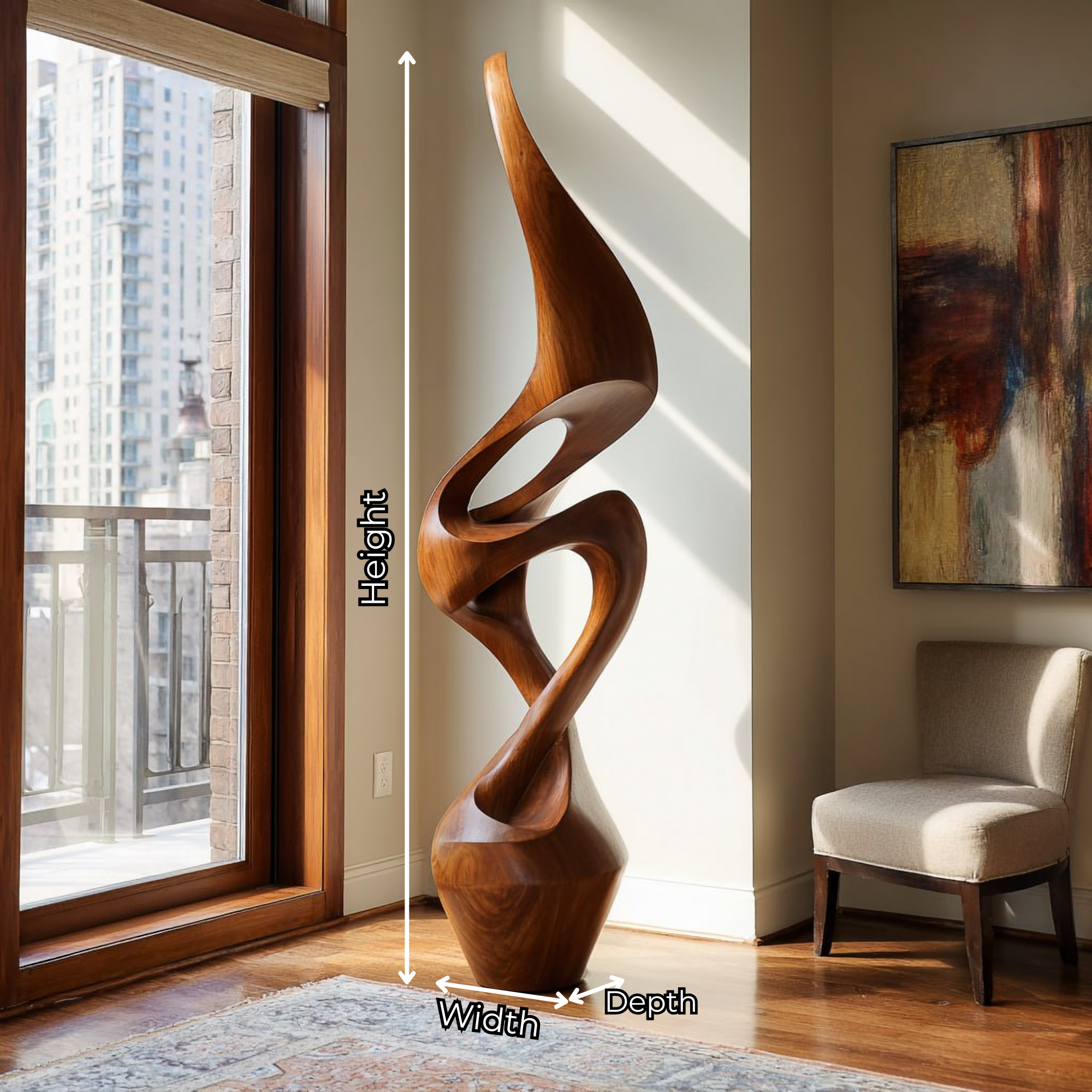 The sculpture harmonizes with contemporary, minimalist, and Japandi-inspired interiors, offering both visual interest and a calming artistic character. Because solid wood is a natural material and finished by hand, natural variations in grain, tone, and subtle surface details are expected, no two sculptures are exactly alike.